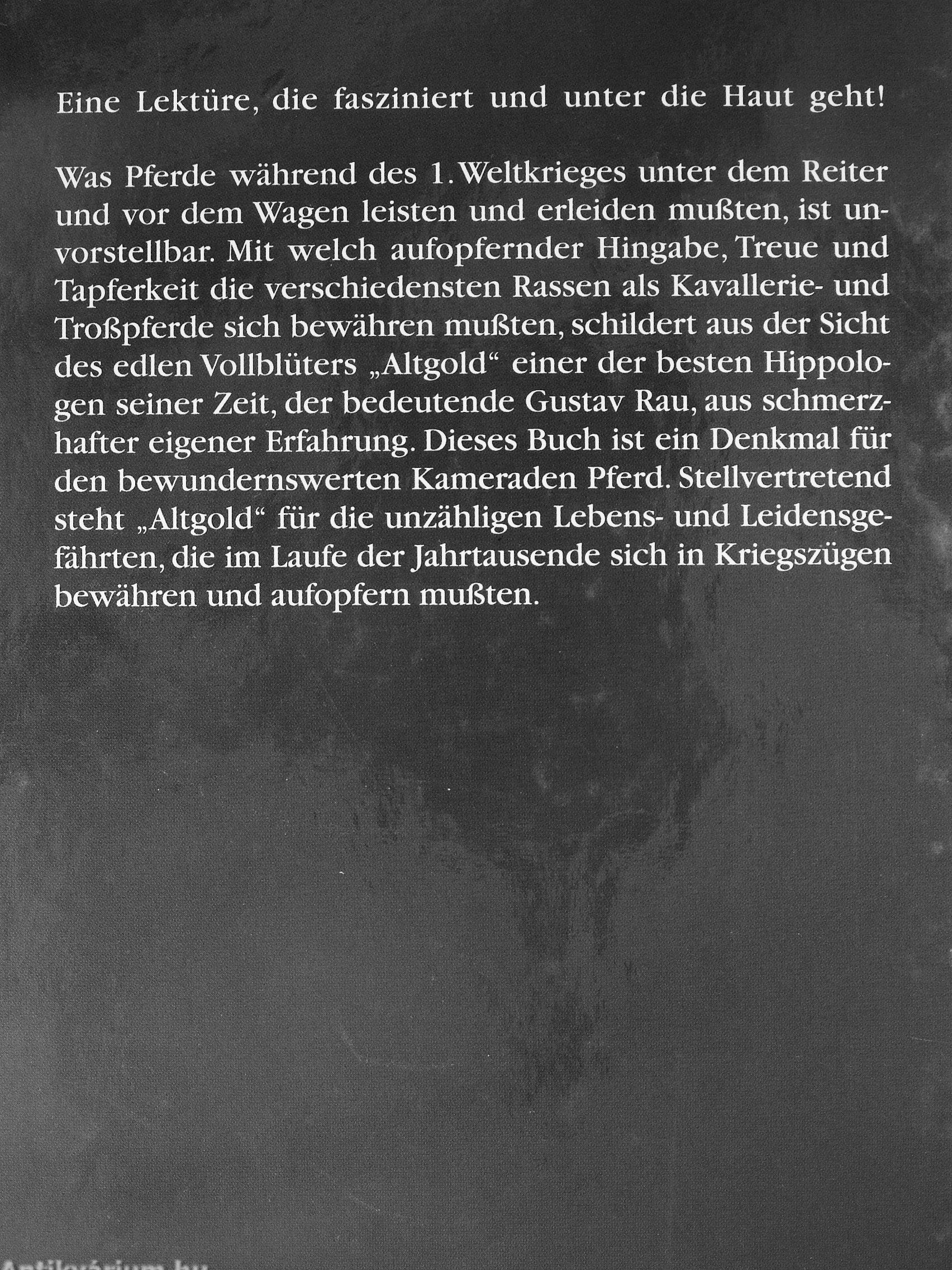 Was Pferde während des I.Weltkrieges unter dem Reiter und vor dem Wagen leisten und erleiden mußten, ist unvorstellbar. Mit welch aufopfernder Hingabe, Treue und Tapferkeit die verschiedensten Rassen als Kavallerie- und Troßpferde sich bewähren mußten, schildert aus der Sicht des edlen Vollblüters „Altgold" einer der besten Hippolo-gen seiner Zeit, der bedeutende Gustav Rau, aus schmerzhafter eigener Erfahrung. Dieses Buch ist ein Denkmal für den bewundernswerten Kameraden Pferd. Stellvertretend steht „Altgold" für die unzähligen Lebens- und Leidensgefährten, die im Laufe der Jahrtausende sich in Kriegszügen bewähren und aufopfern mußten.