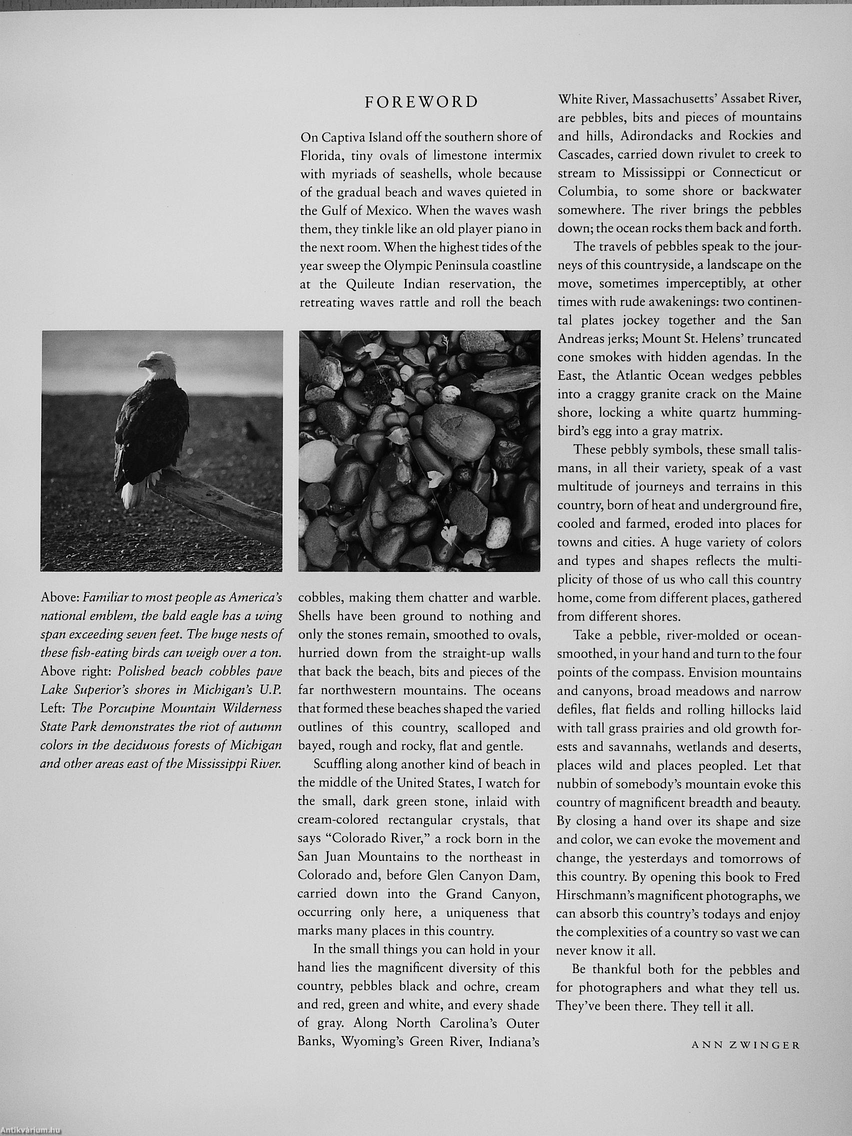 Ann Zwinger, a favorite writer on the beauty of nature, has contributed the foreword to AMERICA. Her analogy of the journeys of pebbles expresses the story of this land, a nation too great to be explored in an entire lifetime.