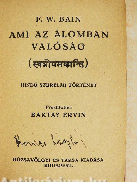 | Megjegyzés: | F. W. Bain tizenegy hindú meséjét (A Hajna Leánya, Holdsarló, A Hibák Bányája, A Testetöltött Hó, Az Éjbemerült Nap, A Nagy Isten Hajában, Szürkület, Buborékok Az élet Tengerén, Az Égszinkék Ital, Isteni Hamvak, Az Alkony Köntöse) követi "Ami az Álomban Valóság". A művet Sugár Jenő rendezte sajtó alá. Szedték Korvin Testvérek félkövér Nordischantiqua betűivel. |