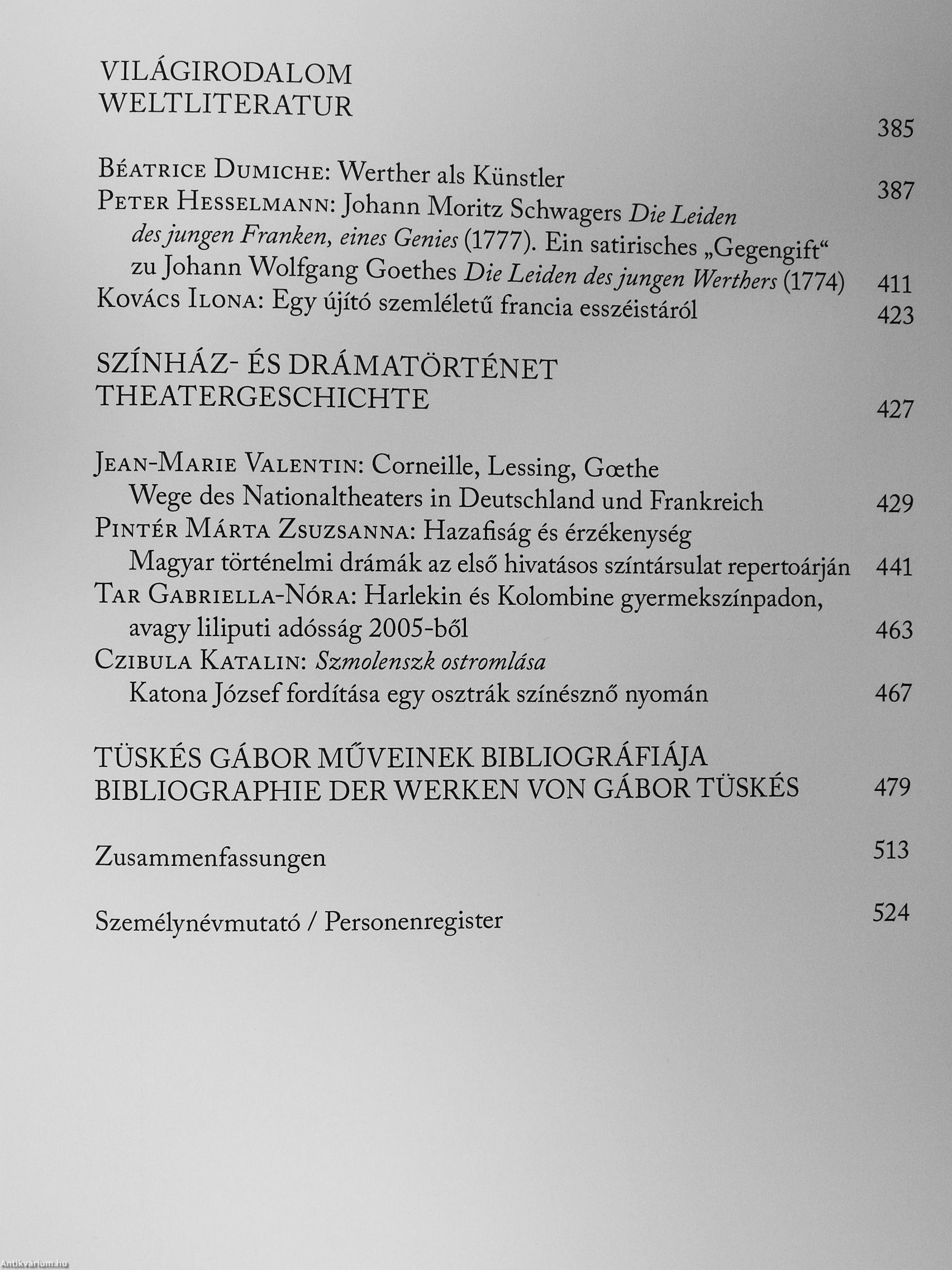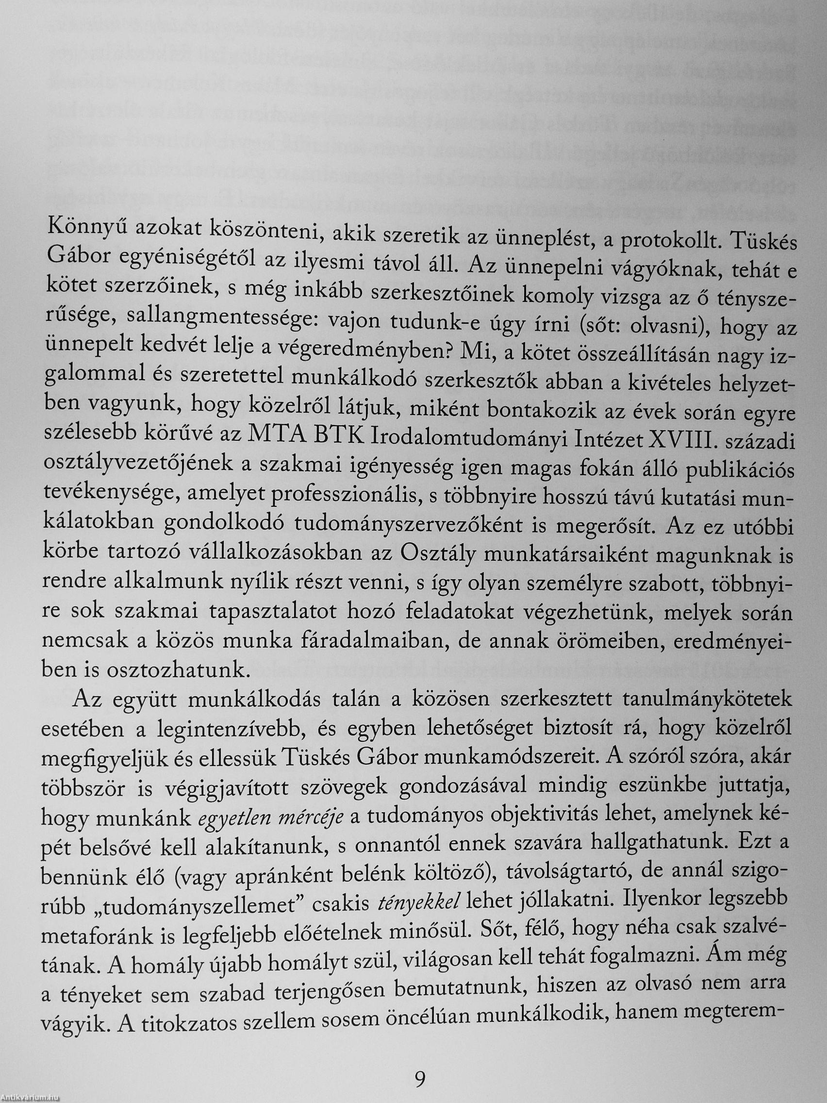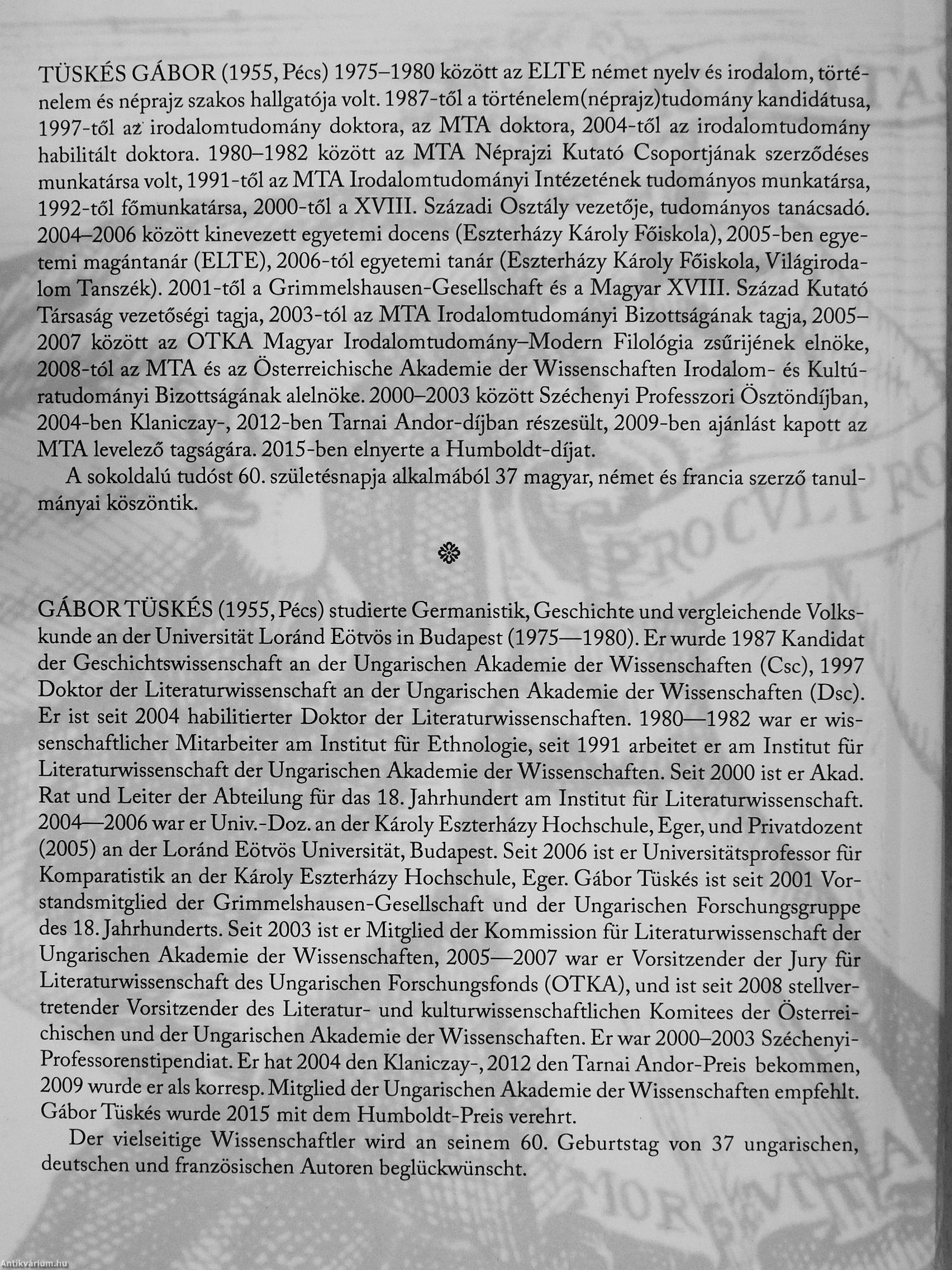 GABORTÜSKÉS (1955, Pécs) studierte Germanistik, Geschichte und vergleichende Volkskunde an der Universität Loránd Eötvös in Budapest (1975—1980). Er wurde 1987 Kandidat der Geschichtswissenschaft an der Ungarischen Akademie der Wissenschaften (Csc), 1997 Doktor der Literaturwissenschaft an der Ungarischen Akademie der Wissenschaften (Dsc). Er ist seit 2004 habilitierter Doktor der Literaturwissenschaften. 1980—1982 war er wissenschaftlicher Mitarbeiter am Institut für Ethnologie, seit 1991 arbeitet er am Institut für Literaturwissenschaft der Ungarischen Akademie der Wissenschaften. Seit 2000 ist er Akad. Rat und Leiter der Abteilung für das 18. Jahrhundert am Institut für Literaturwissenschaft. 2004—2006 war er Univ.-Doz. an der Károly Eszterházy Hochschule, Eger, und Privatdozent (2005) an der Loránd Eötvös Universität, Budapest. Seit 2006 ist er Universitätsprofessor für Komparatistik an der Károly Eszterházy Hochschule, Eger. Gábor Tüskés ist seit 2001 Vorstandsmitglied der Grimmelshausen-Gesellschaft und der Ungarischen Forschungsgruppe des 18. Jahrhunderts. Seit 2003 ist er Mitglied der Kommission für Literaturwissenschaft der Ungarischen Akademie der Wissenschaften, 2005—2007 war er Vorsitzender der Jury für Literaturwissenschaft des Ungarischen Forschungsfonds (OTKA), und ist seit 2008 stellvertretender Vorsitzender des Literatur- und kulturwissenschaftlichen Komitees der Österreichischen und der Ungarischen Akademie der Wissenschaften. Er war 2000-2003 Széchenyi-Professorenstipendiat. Er hat 2004 den Klaniczay-, 2012 den Tarnai Andor-Preis bekommen, 2009 wurde er als korresp. Mitglied der Ungarischen Akademie der Wissenschaften empfehlt. Gábor Tüskés wurde 2015 mit dem Humboldt-Preis verehrt.