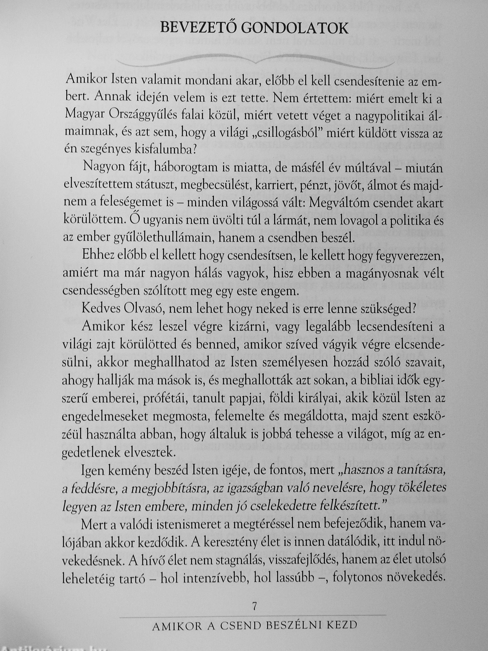 Amikor Isten valamit mondani akar, előbb el kell csendesítenie az embert. Annak idején velem is ezt tette. Nem értettem, hogy miért emelt ki a Parlament falai közül, miért vetett véget a nagypolitikai álmaimnak, és azt sem, hogy a világi „csillogásból" miért küldött vissza az én szegényes kis falumba. Nagyon fájt, de másfél év múltával - miután elveszítettem státuszt, megbecsülést, karriert, pénzt, jövőt, álmot és majdnem a feleségemet is — mindent megértettem: Megváltóm csendet akart körülöttem!