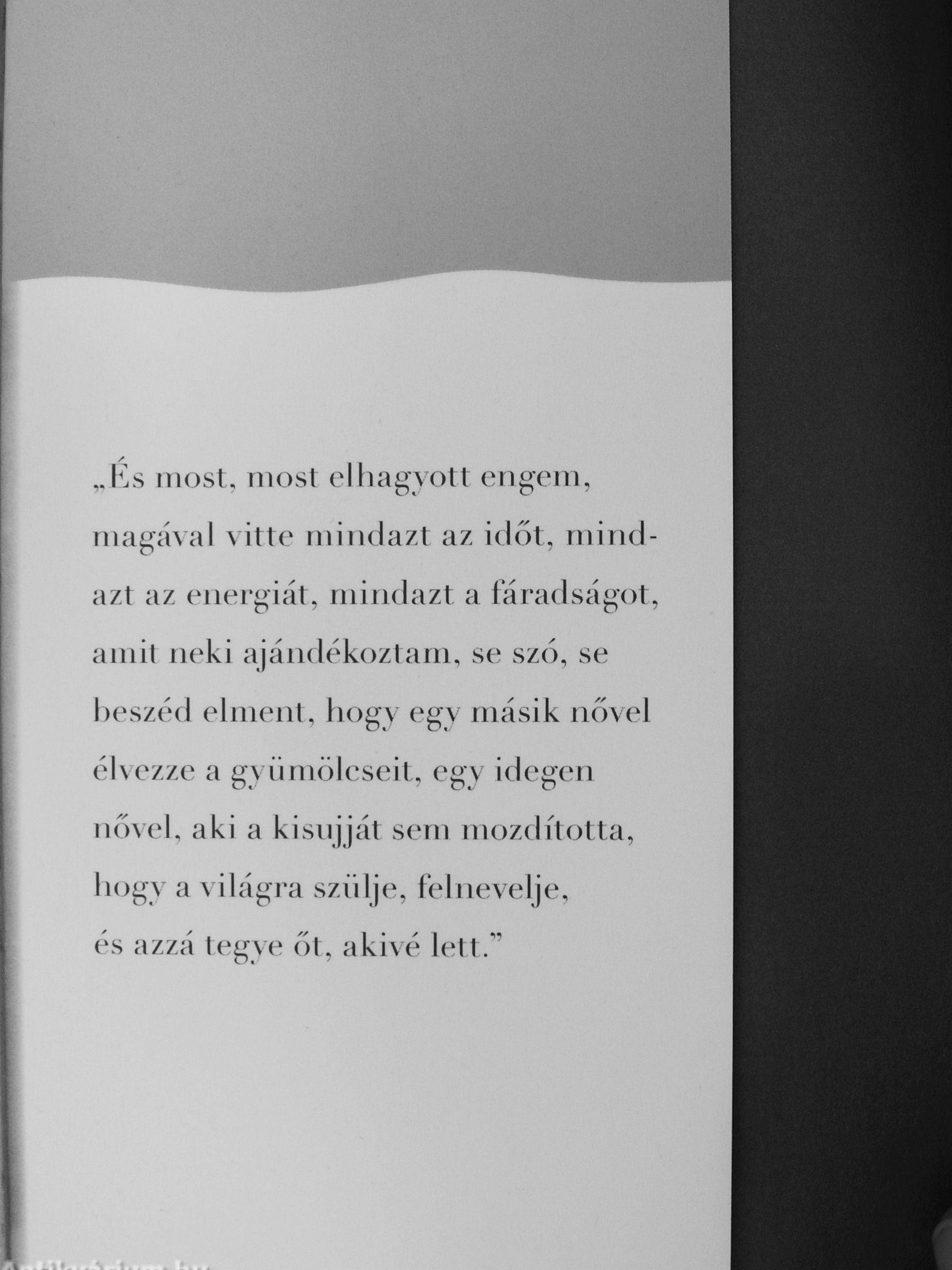iTiosl. niosl elliagvott en^>'ein, rnagiual vilte niindazt az idol, niind-azl az energiát, niiiHlazt a íaradságot, aiiiil neki ajándekozlaoK se szo, se heszíMl elment, hogy egy másik növel el\ezze a gyiiniölcseil, egv idegen novek aki a kisnjját sern mozdította, hogy a világi^a szülje, iehunelje, és azzá legye ol. akivé leli/'