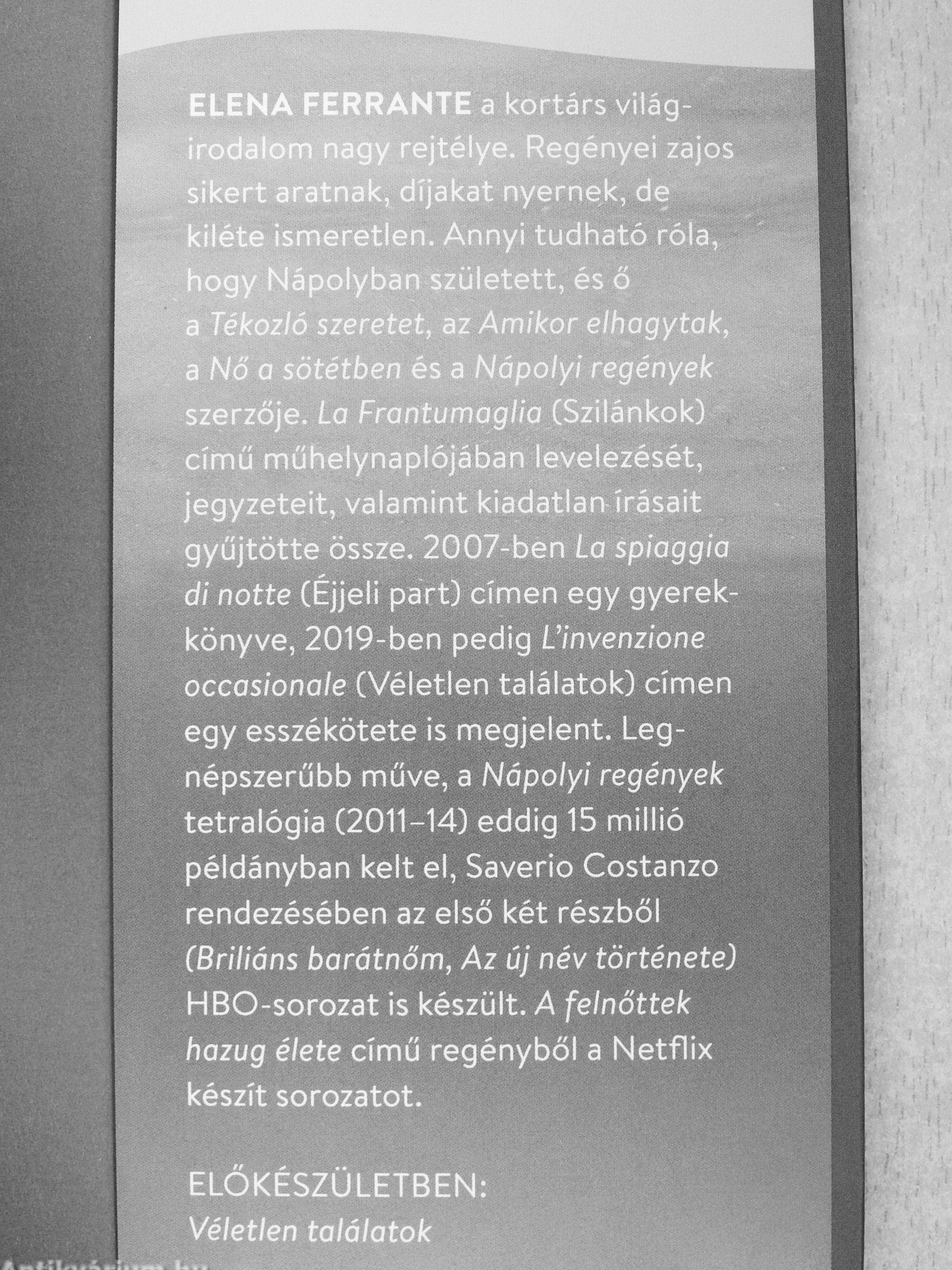 ELENA FERRANTE a kortárs világirodalom nagy rejtélye. Regényei zajos sikert aratnak, díjakat nyernek, de kiléte ismeretlen. Annyi tudható róla, hogy Nápolyban született, és ő a Tékozló szeretet, az Amikor elhagytok, a Nő a sötétben és a Nápolyi regények szerzője. La Frantumoglia (Szilánkok) című mühelynaplójában levelezését, jegyzeteit, valamint kiadatlan írásait gyűjtötte össze. 2007-ben Lo spiaggia di nőtte (Éjjeli part) címen egy gyerekkönyve, 2019-ben pedig L'invenzione occasionale (Véletlen találatok) címen egy esszékötete is megjelent. Legnépszerűbb műve, a Nápolyi regények tetralógia (2011-14) eddig 15 millió példányban kelt el, Saverio Costanzo rendezésében az első két részből (Briliáns barátnőm, Az új név története) HBO-sorozat is készült. A felnőttek hazug élete című regényből a Netflix készít sorozatot.