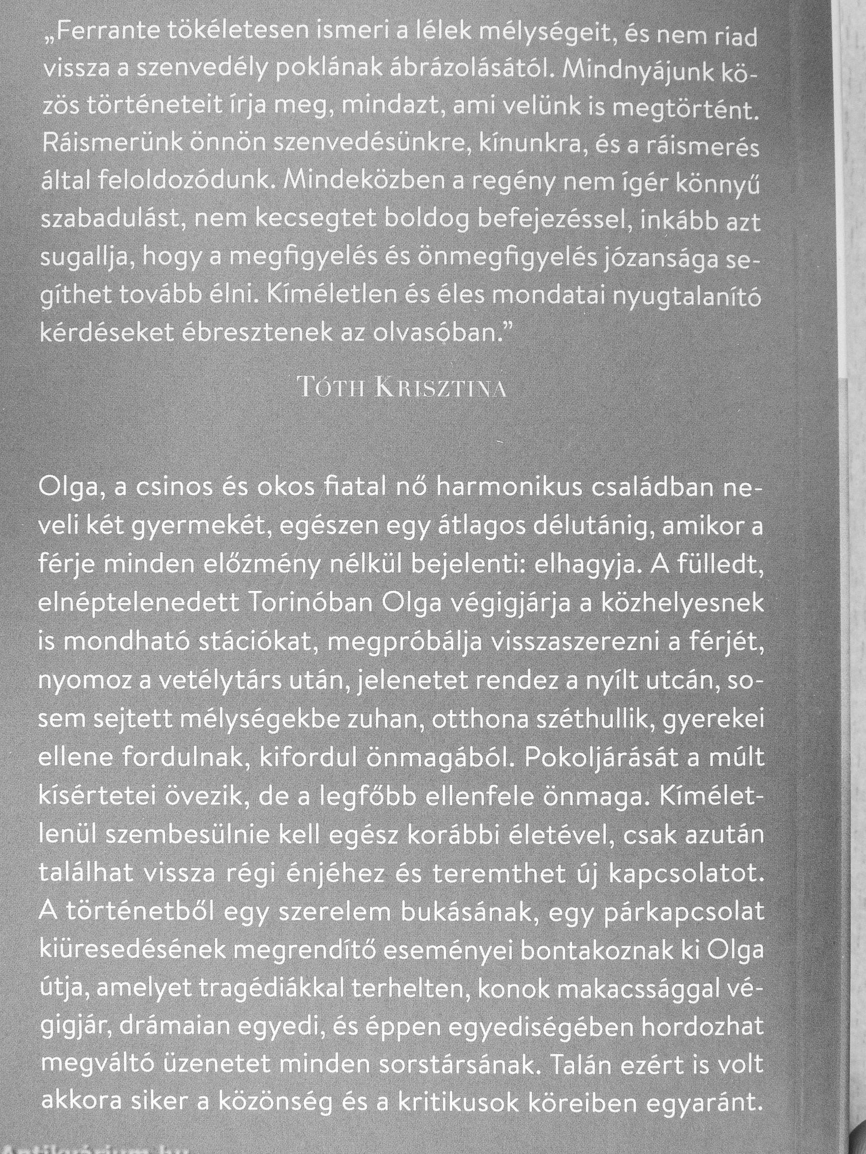 „Ferrante tökéletesen isnneri a lélek mélységeit, és nem riad vissza a szenvedély poklának ábrázolásától. Mindnyájunk közös történeteit írja meg, mindazt, ami velünk is megtörtént. Ráismerünk önnön szenvedésünkre, kínunkra, és a ráismerés által feloldozódunk. Mindeközben a regény nem ígér könnyű szabadulást, nem kecsegtet boldog befejezéssel, inkább azt sugallja, hogy a megfigyelés és önmegfigyelés józansága segíthet tovább élni. Kíméletlen és éles mondatai nyugtalanító kérdéseket ébresztenek az olvasóban."