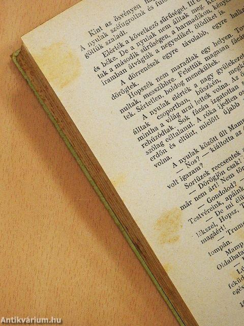 A testes, nagy nyúl összekuporodott, tagjai egyetlen gömbölyű tömegbe forrtak. Fekete csík futott végig hátán, földbarna, puha szőrén és pici, fekete vonalak játszadoztak füle hajlásán. Hatalmas, fehér bajusza szüntelenül remegett. Valószínűtlennek látszott, hogy a pici fiú egyszer majd olyan nagy és erős lesz, mint anyja."