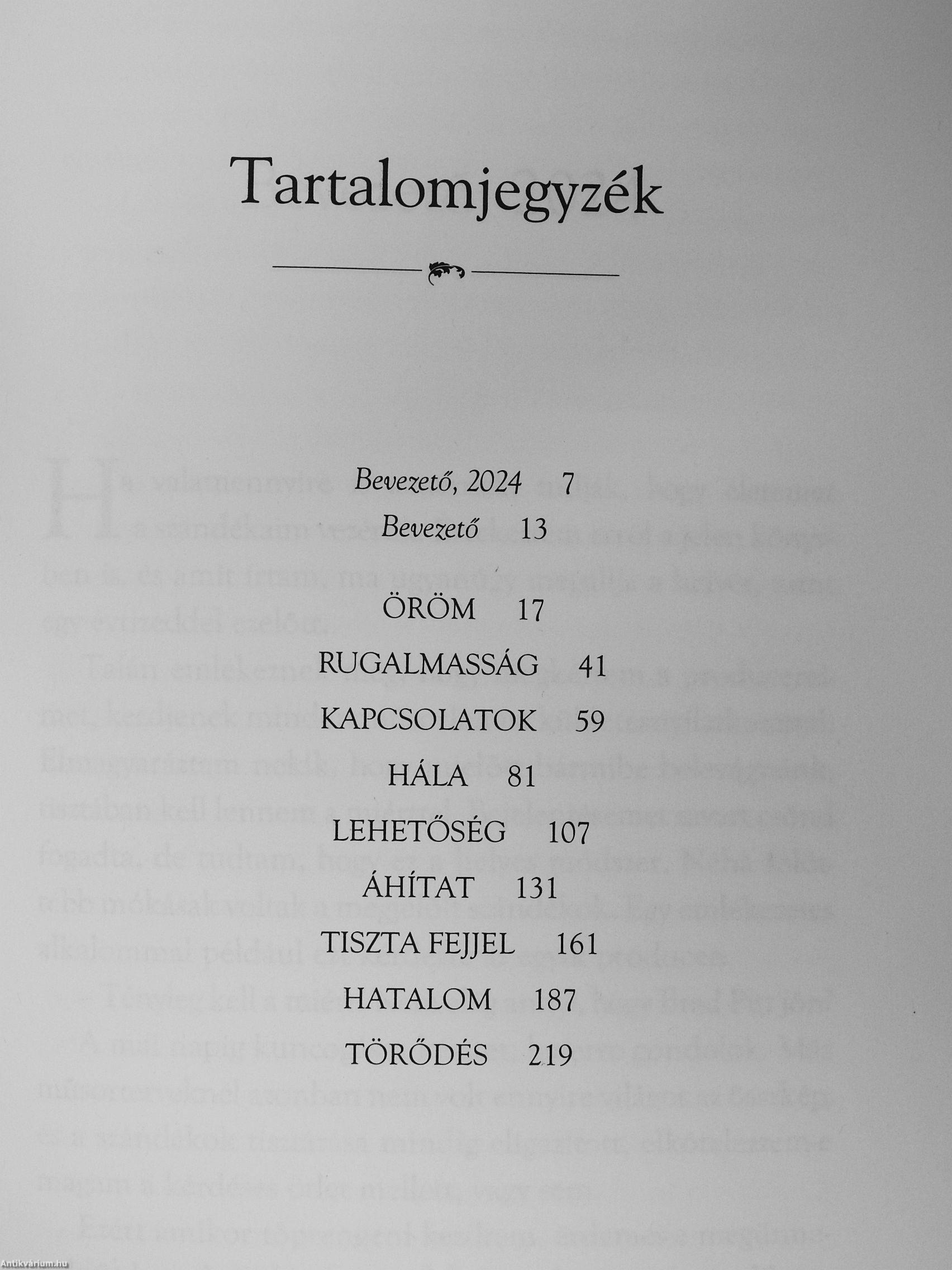 A témakörökbe foglalt esszék - öröm, rugalmasság, kapcsolatok, hála, lehetőség, áhítat, tudatosság, hatalom és törődés - ritka bepillantást nyújtanak a világ egyik legkülönlegesebb asszonyának világába. Őszinte, megrendítő, lelkesítő, felemelő és erőt sugárzó szavaiban az a fajta bölcsesség és igazság csillan meg, amire olyannyira szomjazik minden olvasó. Történetei mindvégig a lélek és a szeretet fontosságáról tanítanak.