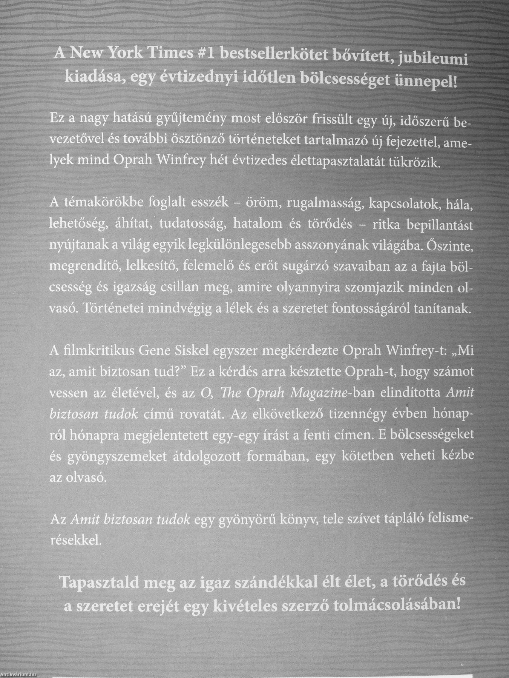 A filmkritikus Gene Siskel egyszer megkérdezte Oprah Winfrey-t: „Mi az, amit biztosan tud?" Ez a kérdés arra késztette Oprah-t, hogy számot vessen az életével, és az O, The Oprah Magazine-han elindította Amit biztosan tudok című rovatát. Az elkövetkező tizennégy évben hónapról hónapra megjelentetett egy-egy írást a fenti címen. E bölcsességeket és gyöngyszemeket átdolgozott formában, egy kötetben veheti kézbe az olvasó.