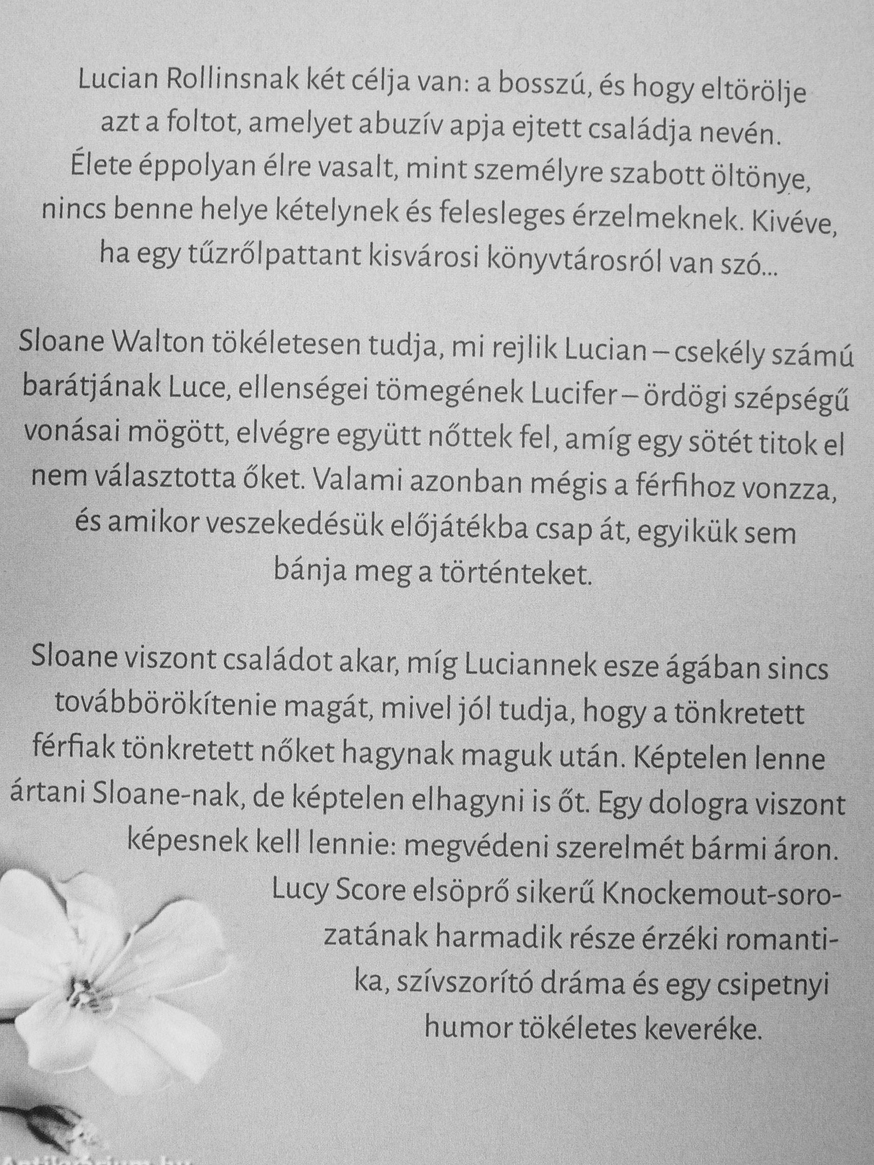 továbbörökítenie magát, mivel jól tudja, hogy a tönkretett férfiak tönkretett nőket hagynak maguk után. Képtelen lenne ártani Sioane-nak, de képtelen elhagyni is őt. Egy dologra viszont képesnek kell lennie: megvédeni szerelmét bármi áron. ^ Lucy Score elsöprő sikerű Knockemout-soro-