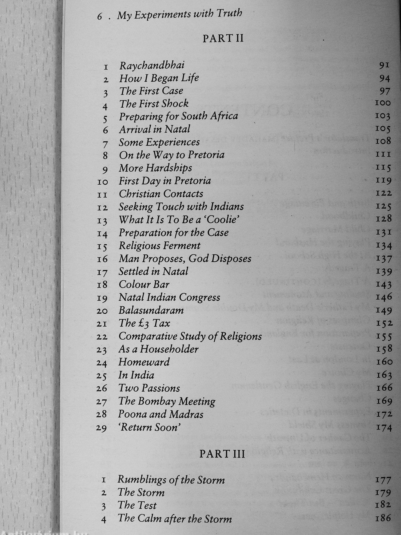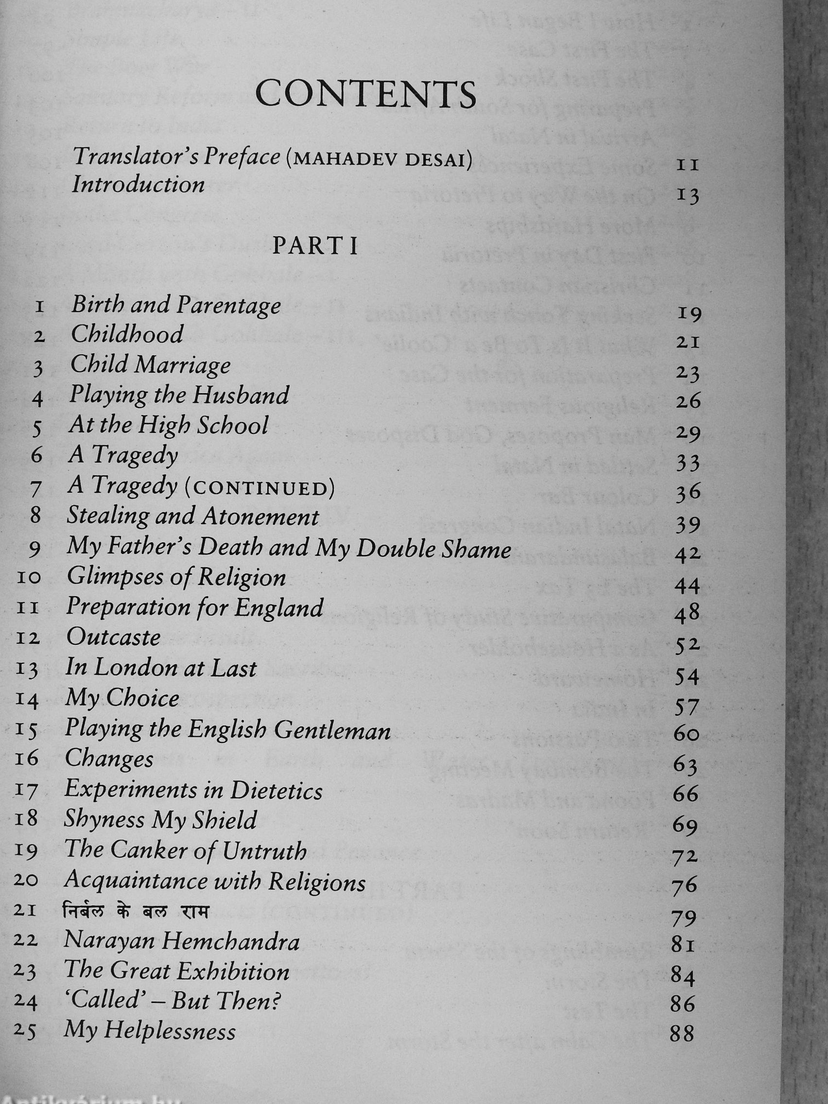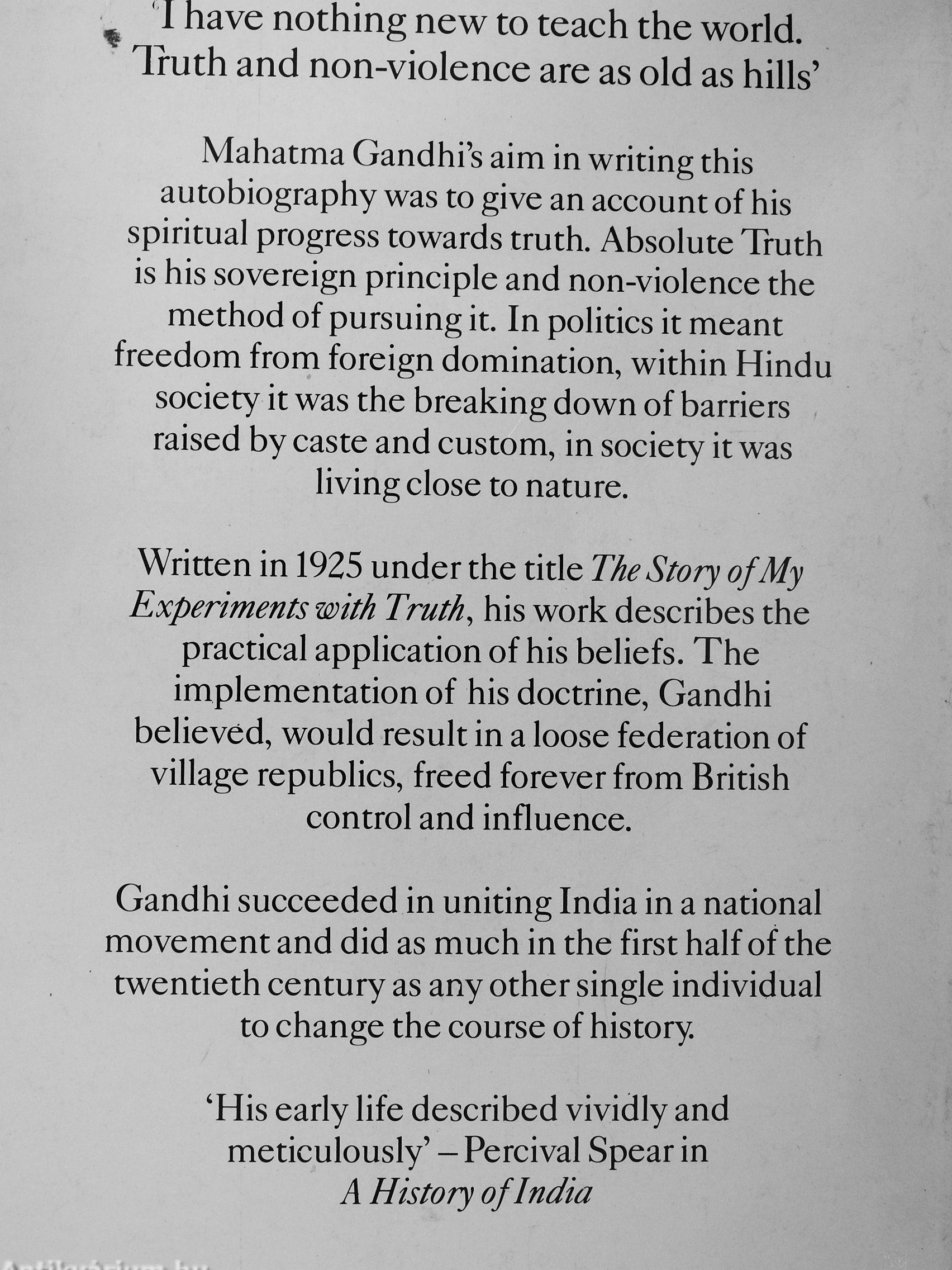Mahatma Gandhi's aim in writing this autobiography was to give an account of his spiritual progress towards truth. Absolute Truth is his sovereign principle and non-violence the method of pursuing it. In politics it meant freedom from foreign domination, within Hindu society it was the breaking down of barriers raised by caste and custom, in society it was living close to nature.
