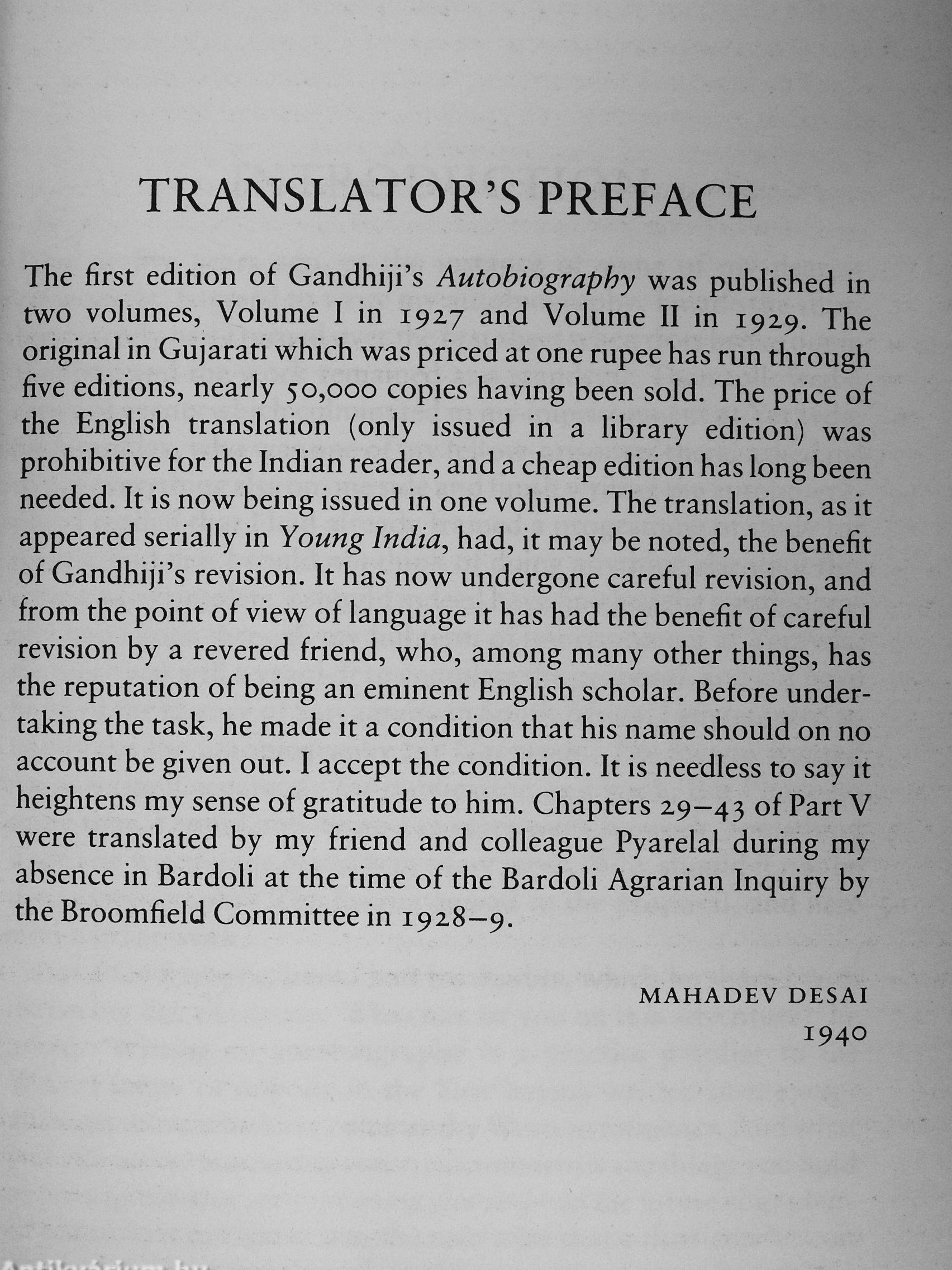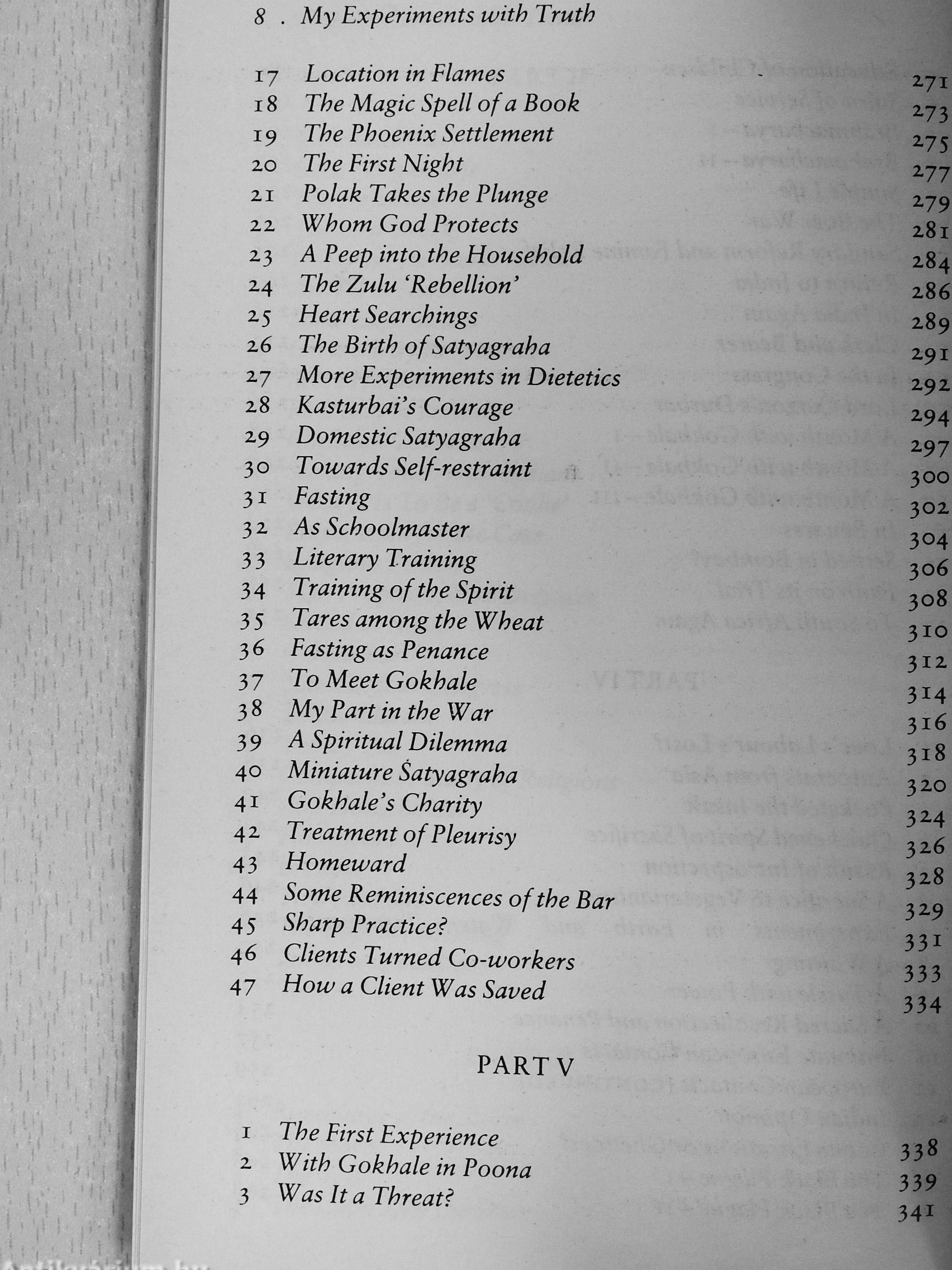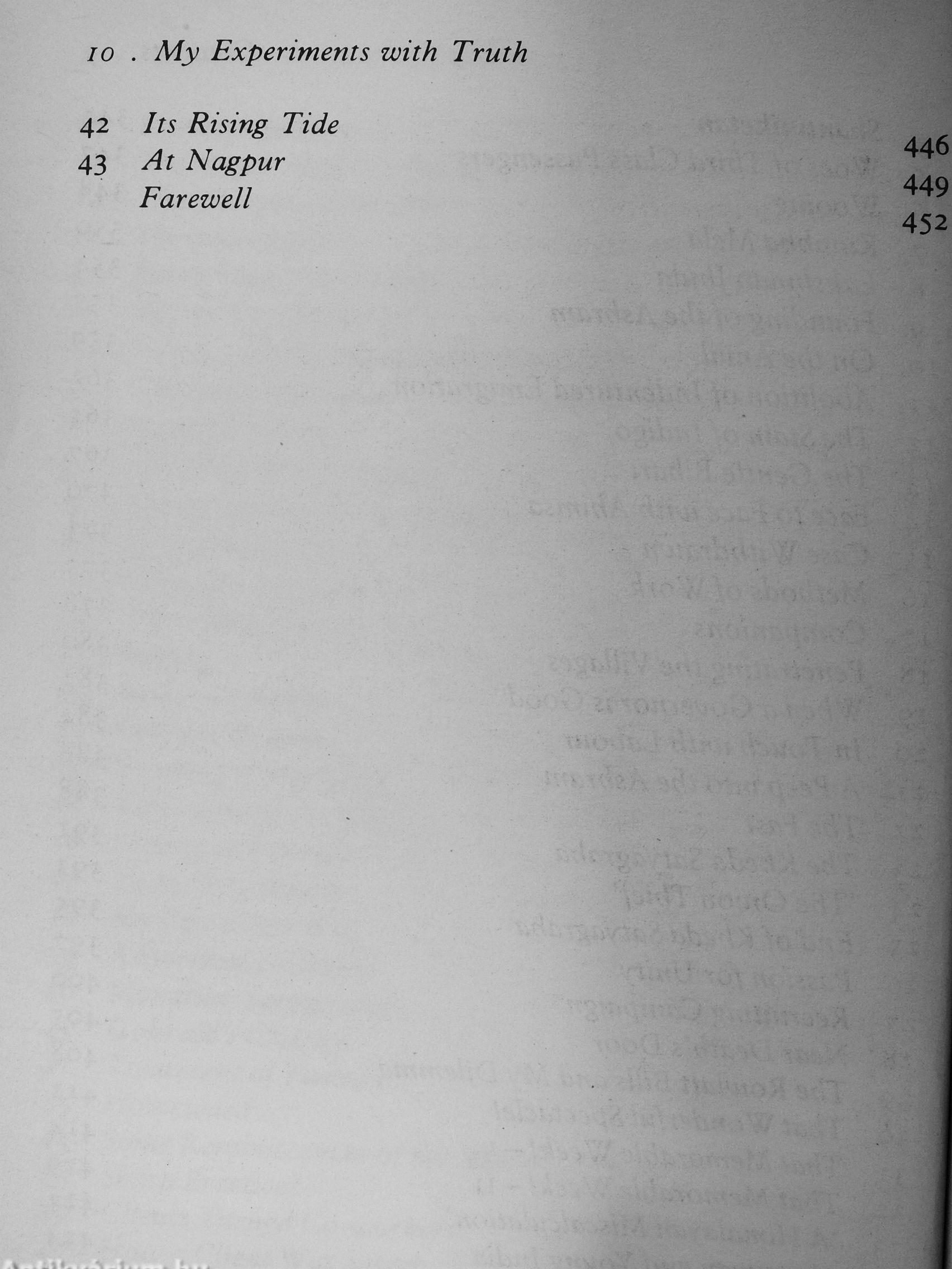 Mahatma Gandhi's aim in writing this autobiography was to give an account of his spiritual progress towards truth. Absolute Truth is his sovereign principle and non-violence the method of pursuing it. In politics it meant freedom from foreign domination, within Hindu society it was the breaking down of barriers raised by caste and custom, in society it was living close to nature.