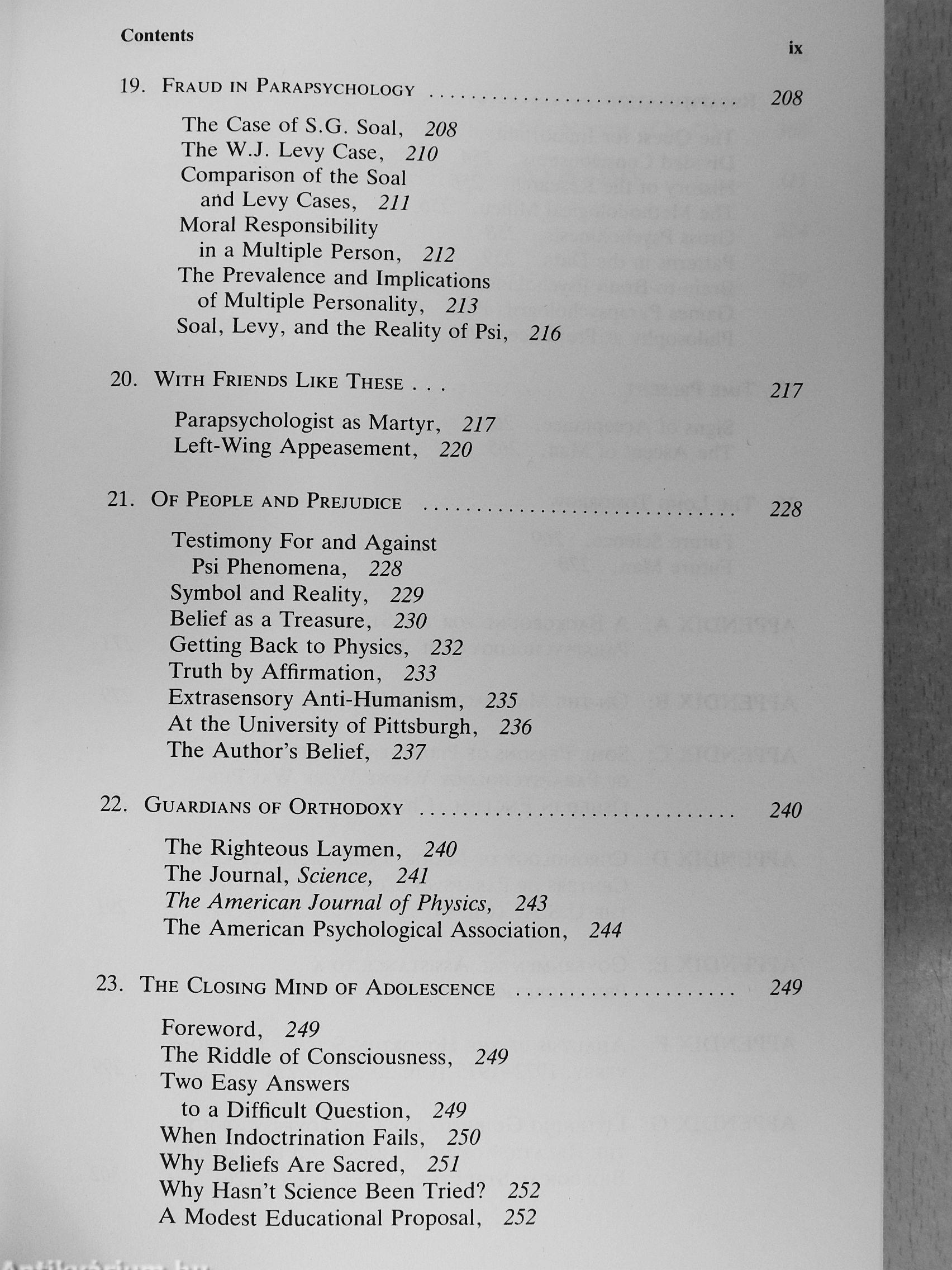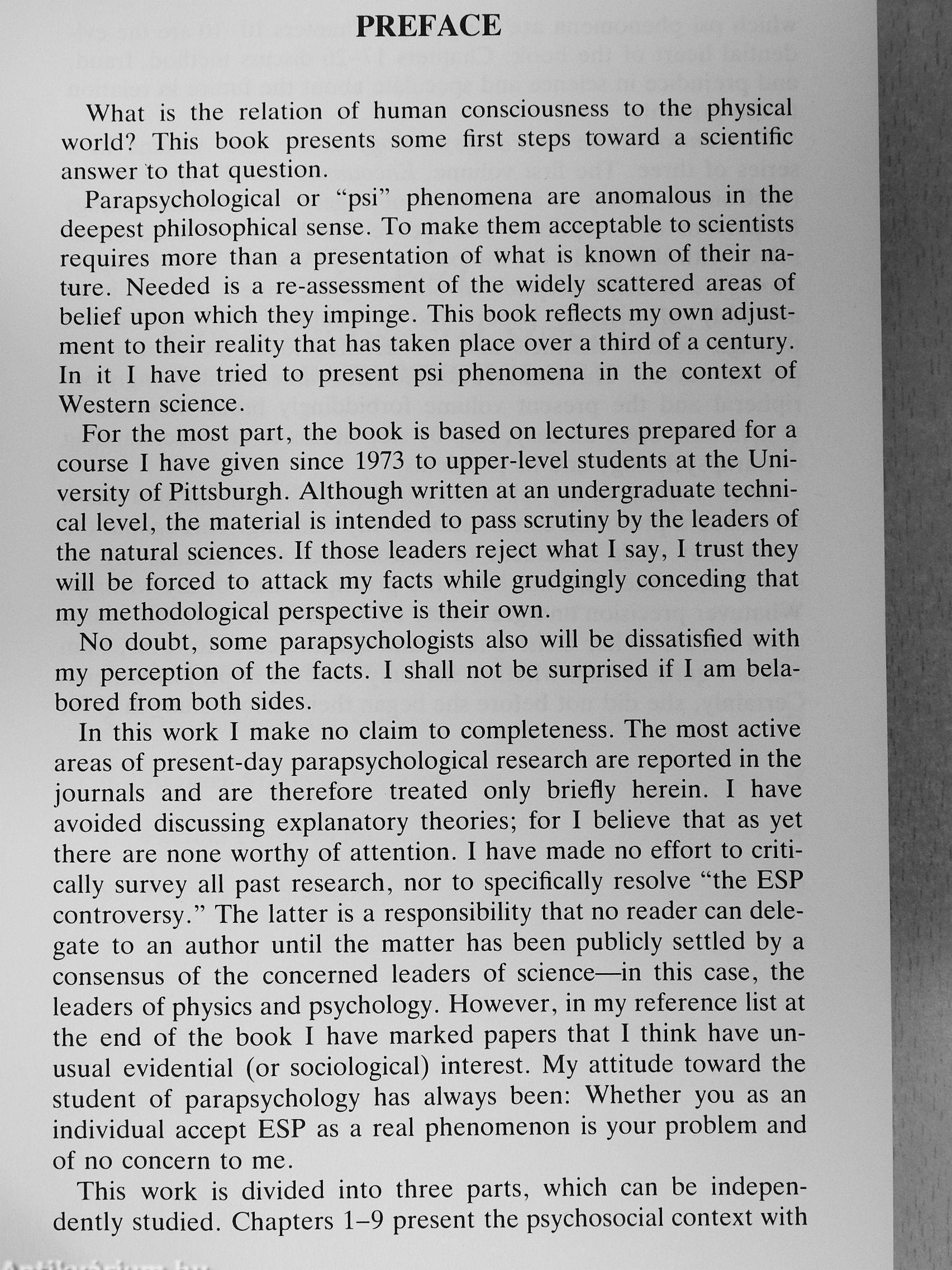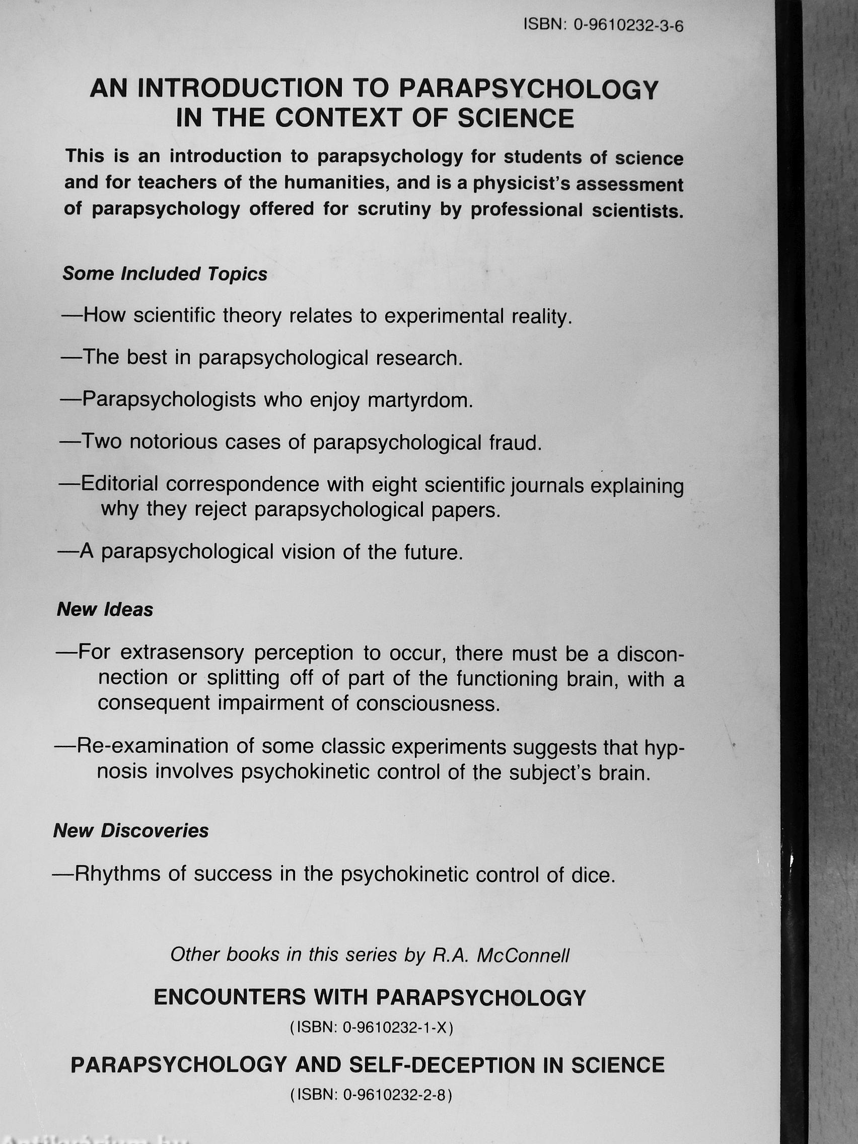 This is an introduction to parapsychology for students of science and for teachers of the humanities, and is a physicist's assessment of parapsychology offered for scrutiny by professional scientists.