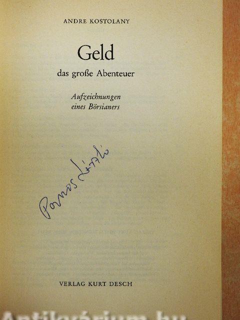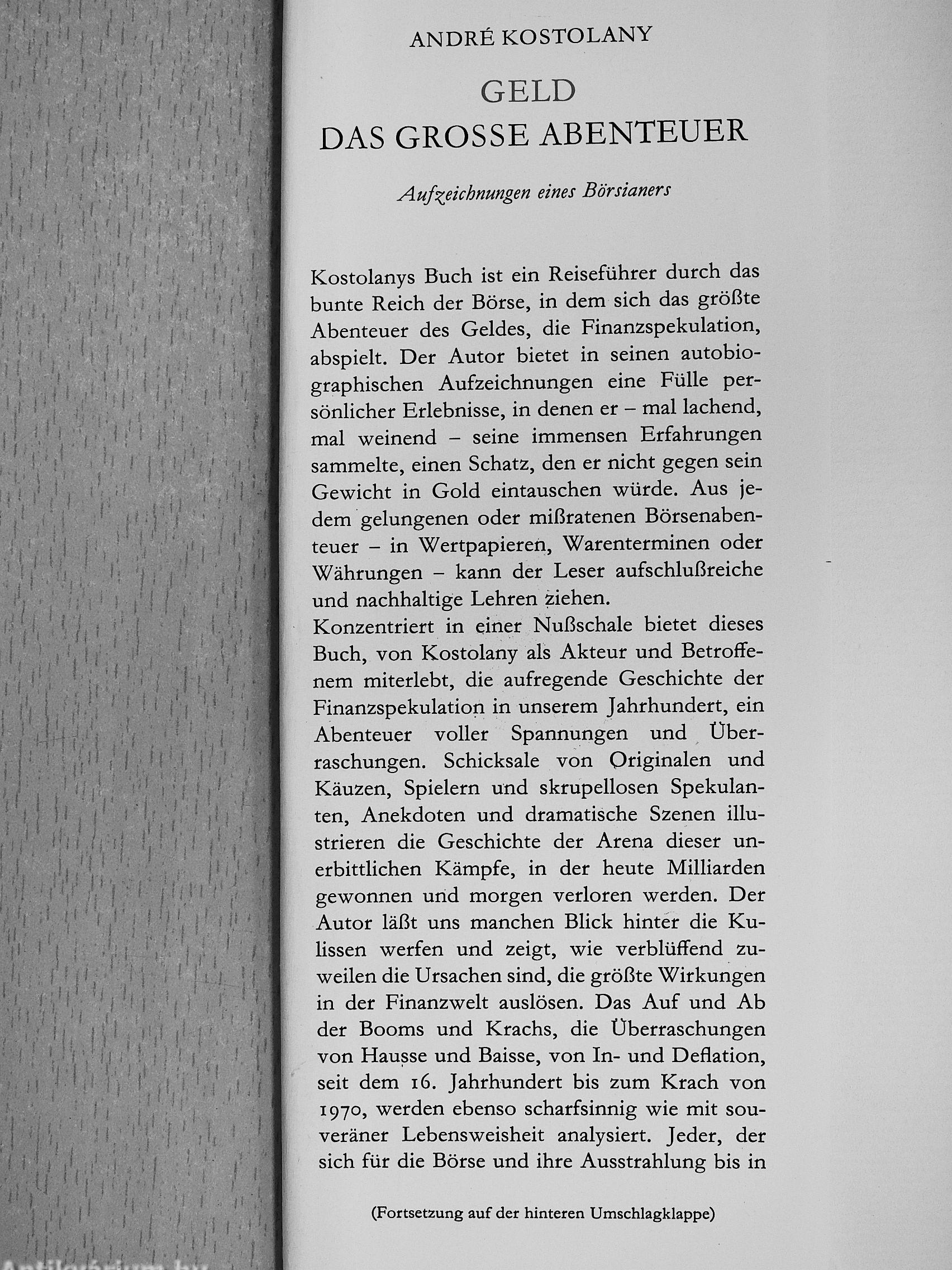 Der Börsianer André Kostolany schreibt über das Abenteuer des Geldes, weil die Börse sein Lebensraum ist. Seit über 45 Jahren lebt er an der Börse und von der Börse, sei es in München, in Paris oder in New York, Toronto, London oder in Zürich. Auch die Spekulationsmanöver des Ostblocks sind ihm wohlbekannt. Kostolany erlebte Kriege und Friedensschlüsse, Hochkonjunkturen und Krisen, Auf-und Abwertungen und all dies auf internationaler Ebene. Es gibt in der Welt keine nennenswerte Börse, an der er nicht seine Erfahrungen gesammelt hat. Geboren in Budapest, amerikanischer Bürger, heute an der französischen Riviera oder in Paris und München lebend, weiß der welterfahrene André Kostolany selber nicht mehr, wo sein Zuhause ist. Alle, die ihn kennen, bestätigen ohne zu zögern : dieser Mann gehört der Börse, »einem Imperium, in dem die Sonne nicht untergeht«.