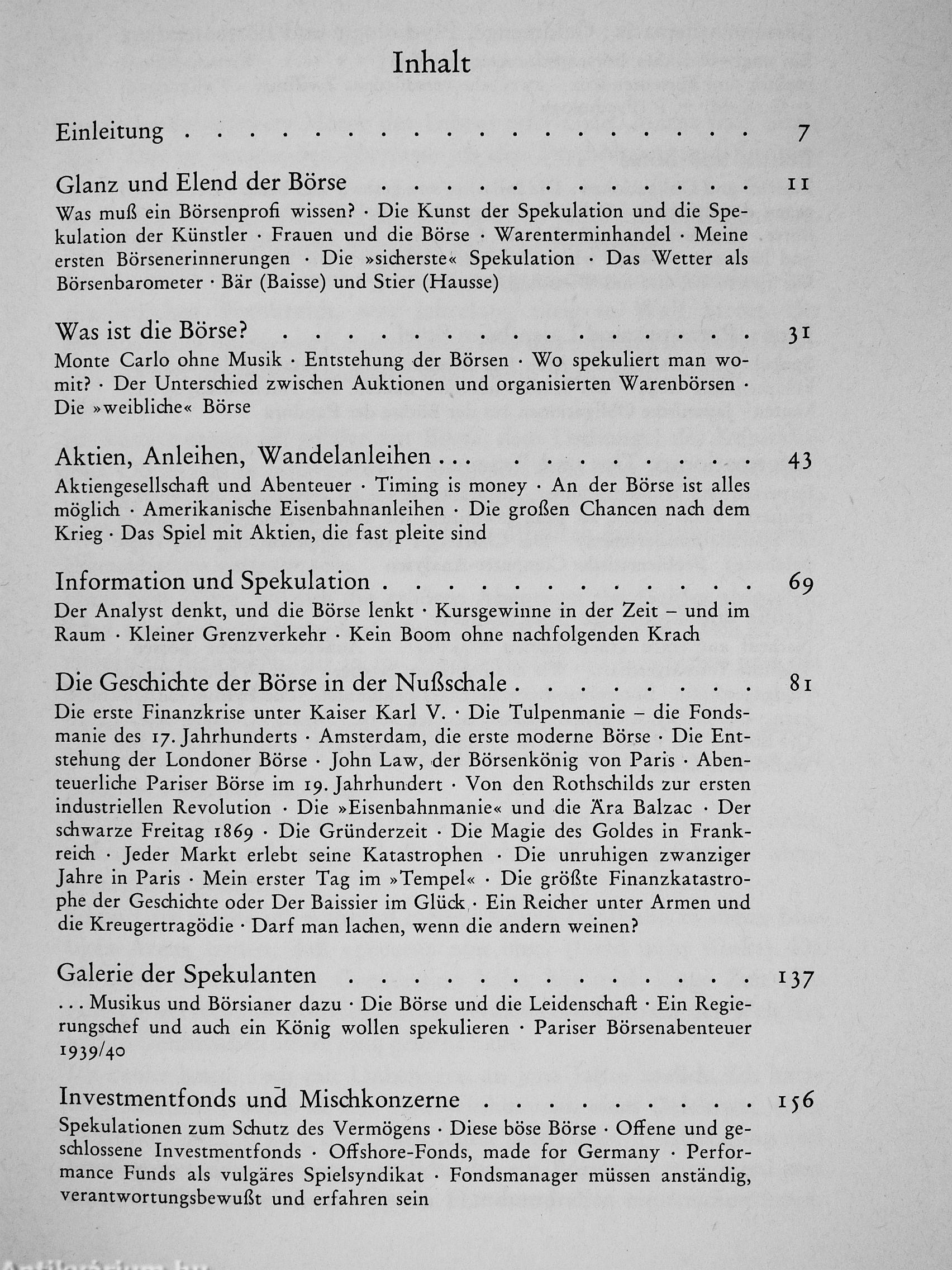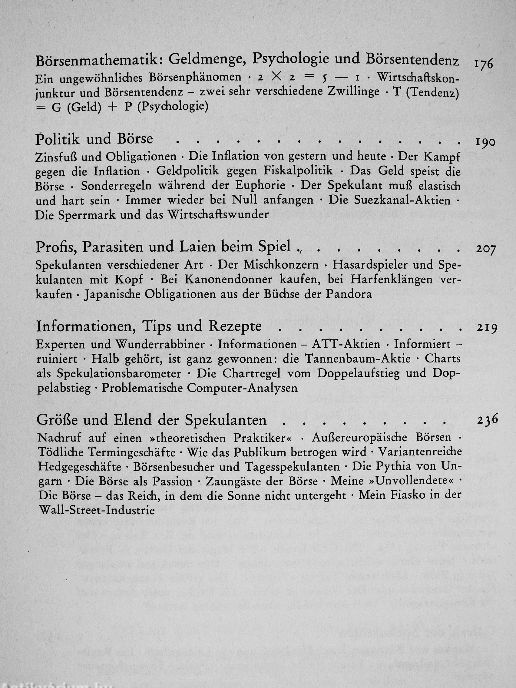 Was für den Leser besonders interessant sein dürfte: das Buch gibt eine brillante Lektion in Börsenkunde - über die Tendenzen, die Kurs-entwicklungen, die Symptome, die Charts, Computer, Bilanzen und über vieles mehr. »Börsenprofessor« Kostolany erteilt diesen Unterricht ganz unprofessoral, weltmännisch und souverän, zugleich mit viel Humor, so daß sich sogar die Spaziergänge in die Technik der Börsenkunde wie interessante Kapitel eines Romans lesen.