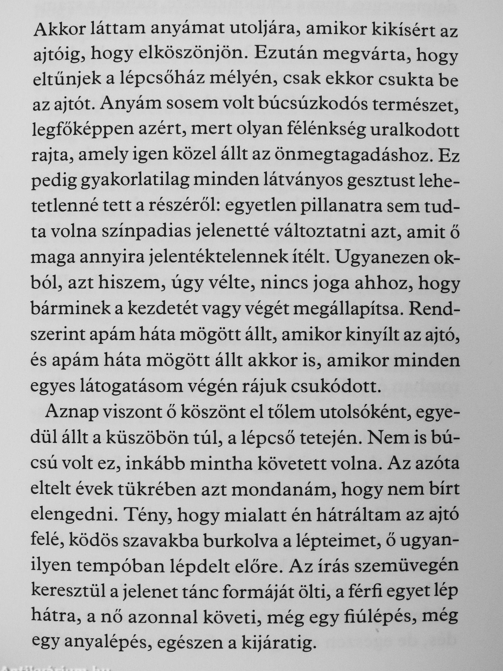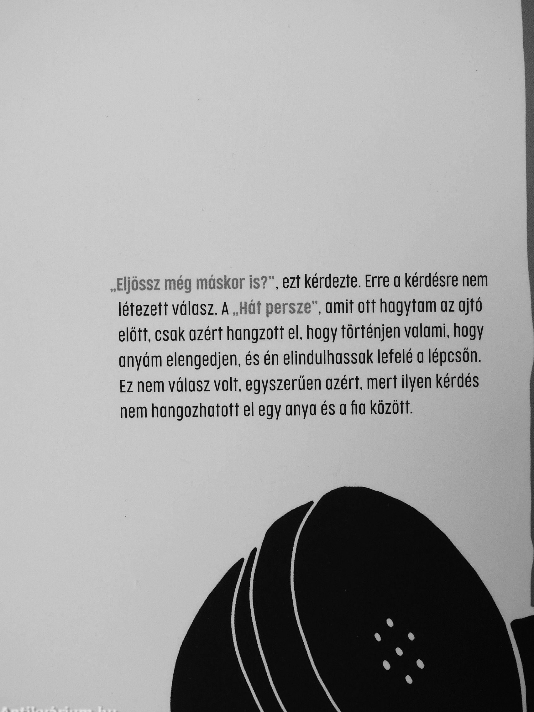 iljössz még máskor is?", ezt l<érclezíe. Erre a l(érdésre nem létezett válasz. A „Hát persze", amit ott hagytam az ajíó előtt, csak azért hangzatt el, hogy töríénjen valami, hogy anyám elengedjen, és én elindulhassak lefelé a lépcsőn. EZ nem válasz volt, egyszerűen azért, mert ilyen kérdés nem hangozhatott el egy anya és a fia között.