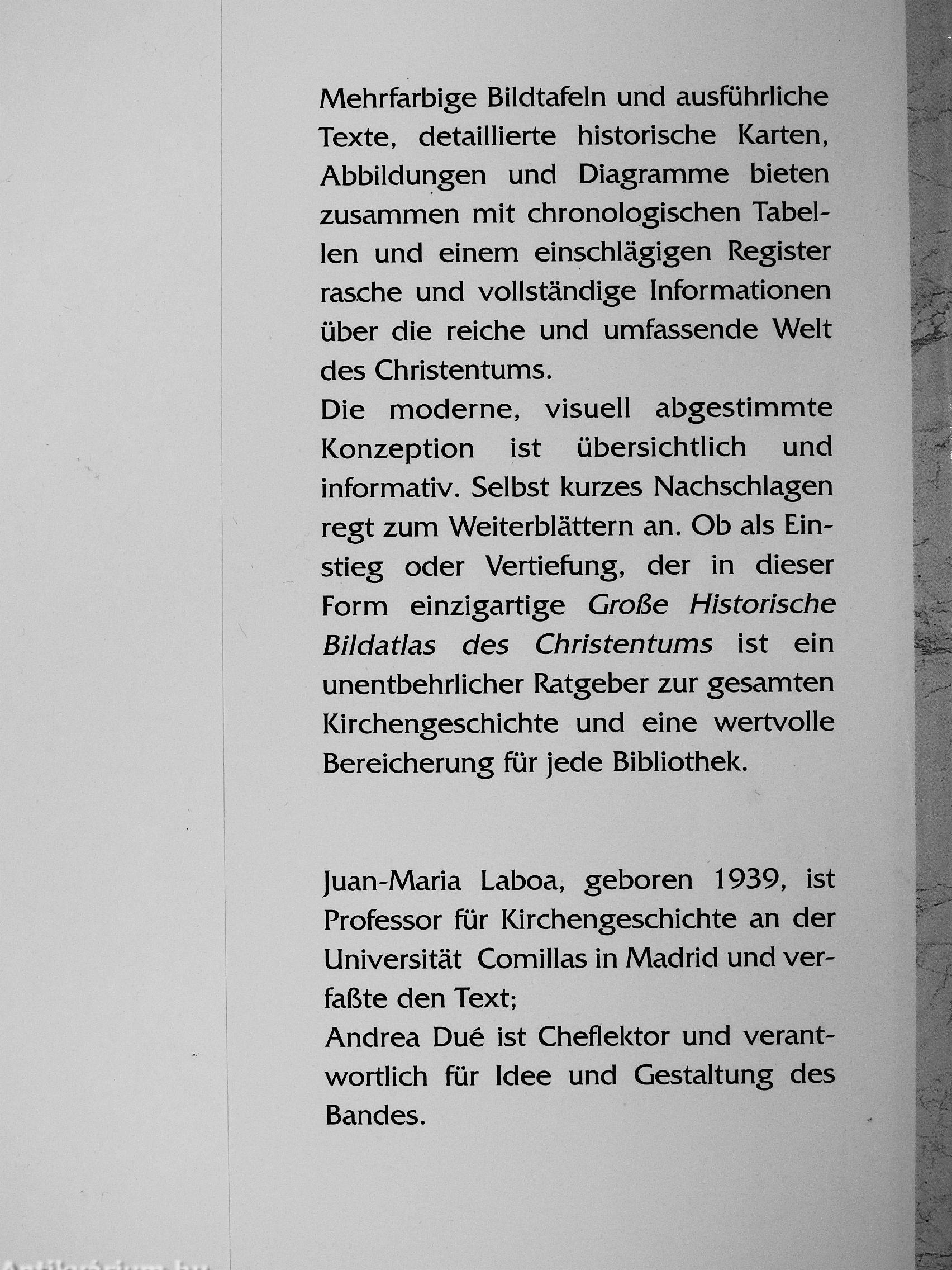 Die moderne, visuell abgestimmte Konzeption ist übersichtlich und informativ. Selbst kurzes Nachschlagen regt zum Weiterblättern an. Ob als Einstleg oder Vertiefung, der in dieser Form einzigartige Große Historische Bildatlas des Christentums ist ein unentbehrlicher Ratgeber zur gesamten Kirchengeschichte und eine wertvolle Bereicherung für jede Bibliothek.