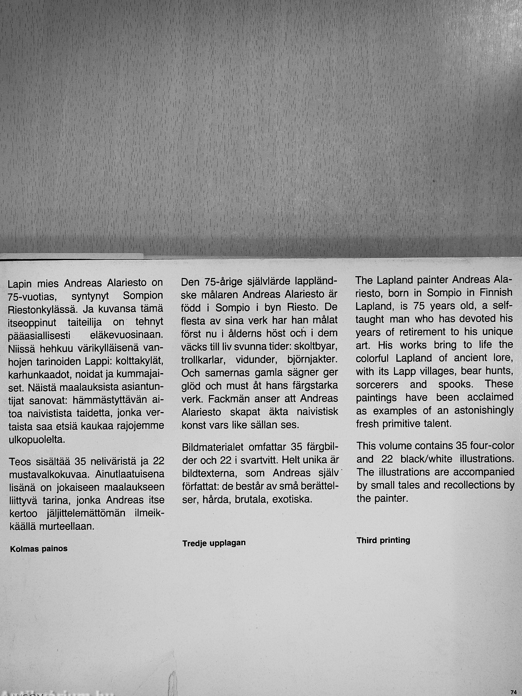 The Lapland painter Andreas Alariesto, born in Sompio in Finnish Lapland, is 75 years old, a self-taught man who has devoted his years of retirement to his unique art. His works bring to life the colorful Lapland of ancient lore, with its Lapp villages, bear hunts, sorcerers and spooks. These paintings have been acclaimed as examples of an astonishingly fresh primitive talent.