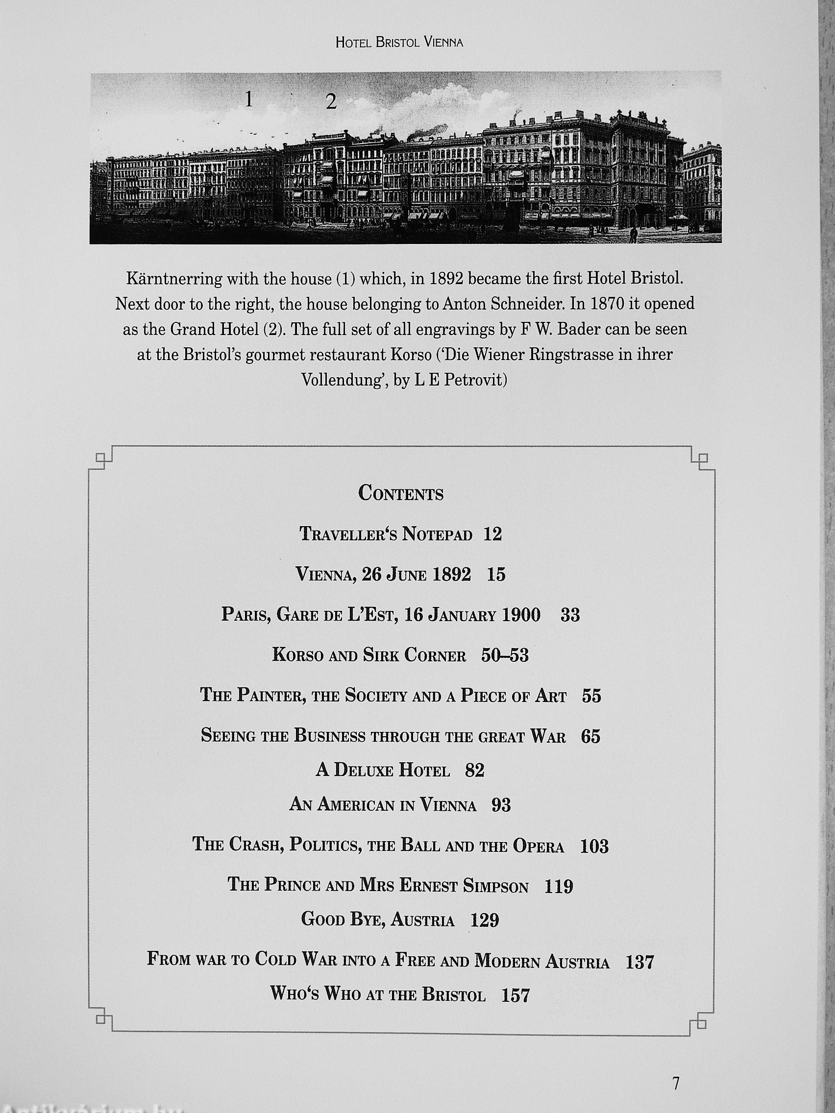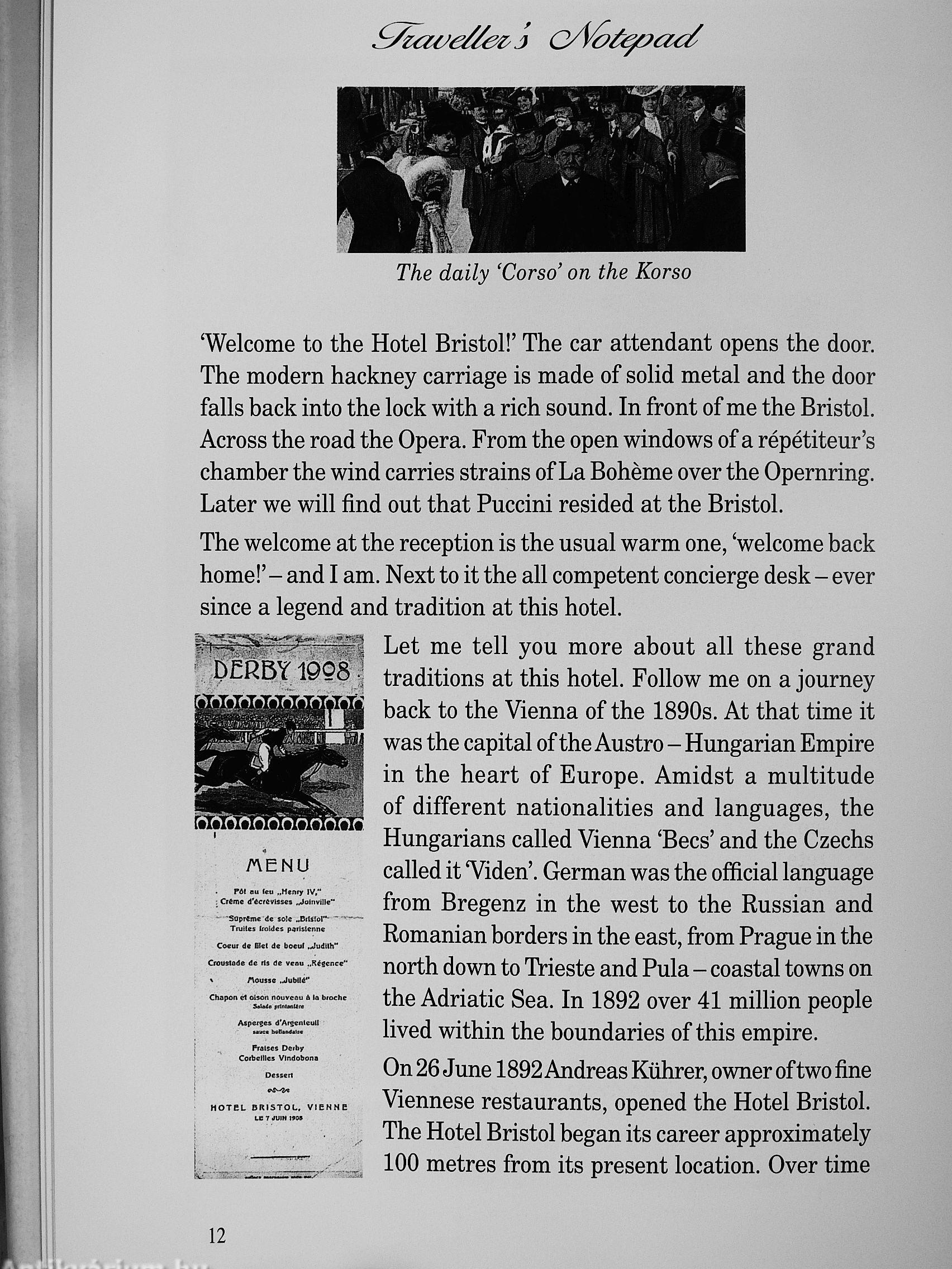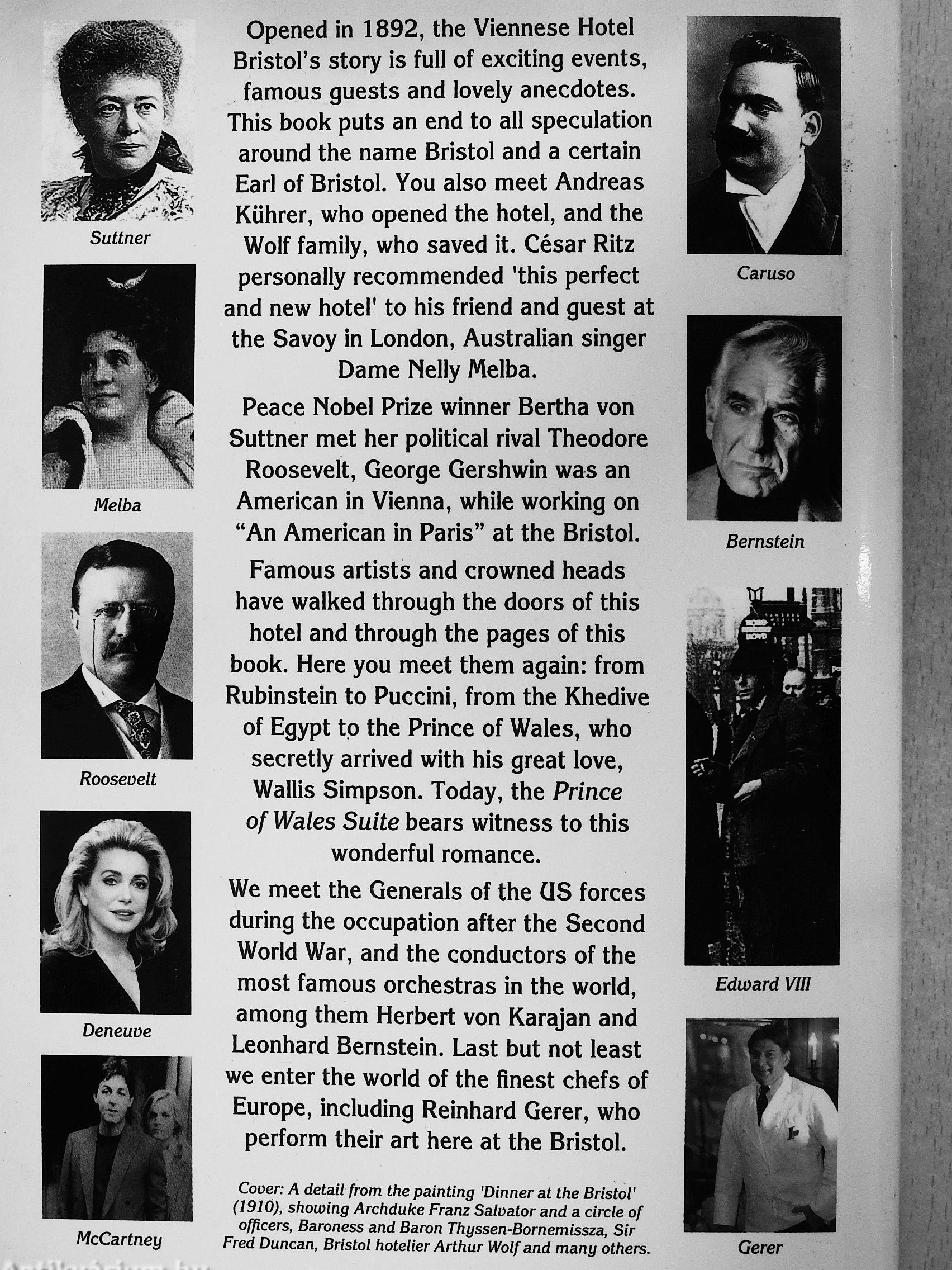 hotel and through the pages of this book. Here you meet them again: from Rubinstein to Puccini, from the Khedive of Egypt to the Prince of Wales, who secretly arrived with his great love, Wallis Simpson. Today, the Prince of Wales Suite bears witness to this wonderful romance. We meet the Generals of the CIS forces during the occupation after the Second World War, and the conductors of the most famous orchestras in the world, among them Herbert von Karajan and Leonhard Bernstein. Last but not least we enter the world of the finest chefs of Europe, including Reinhard Gerer, who perform their art here at the Bristol.