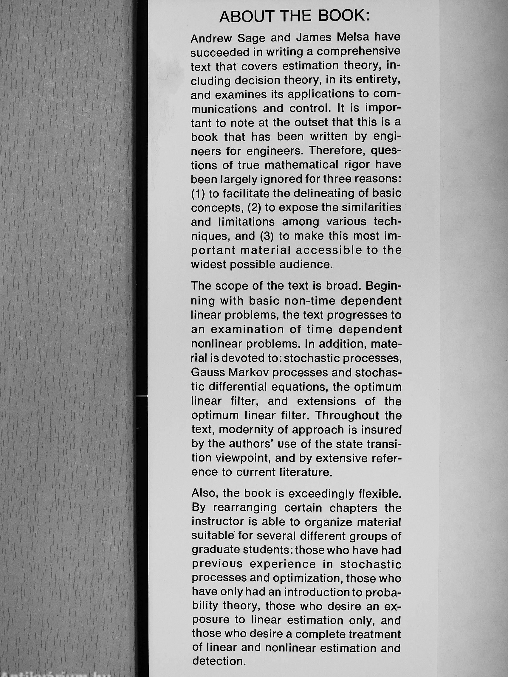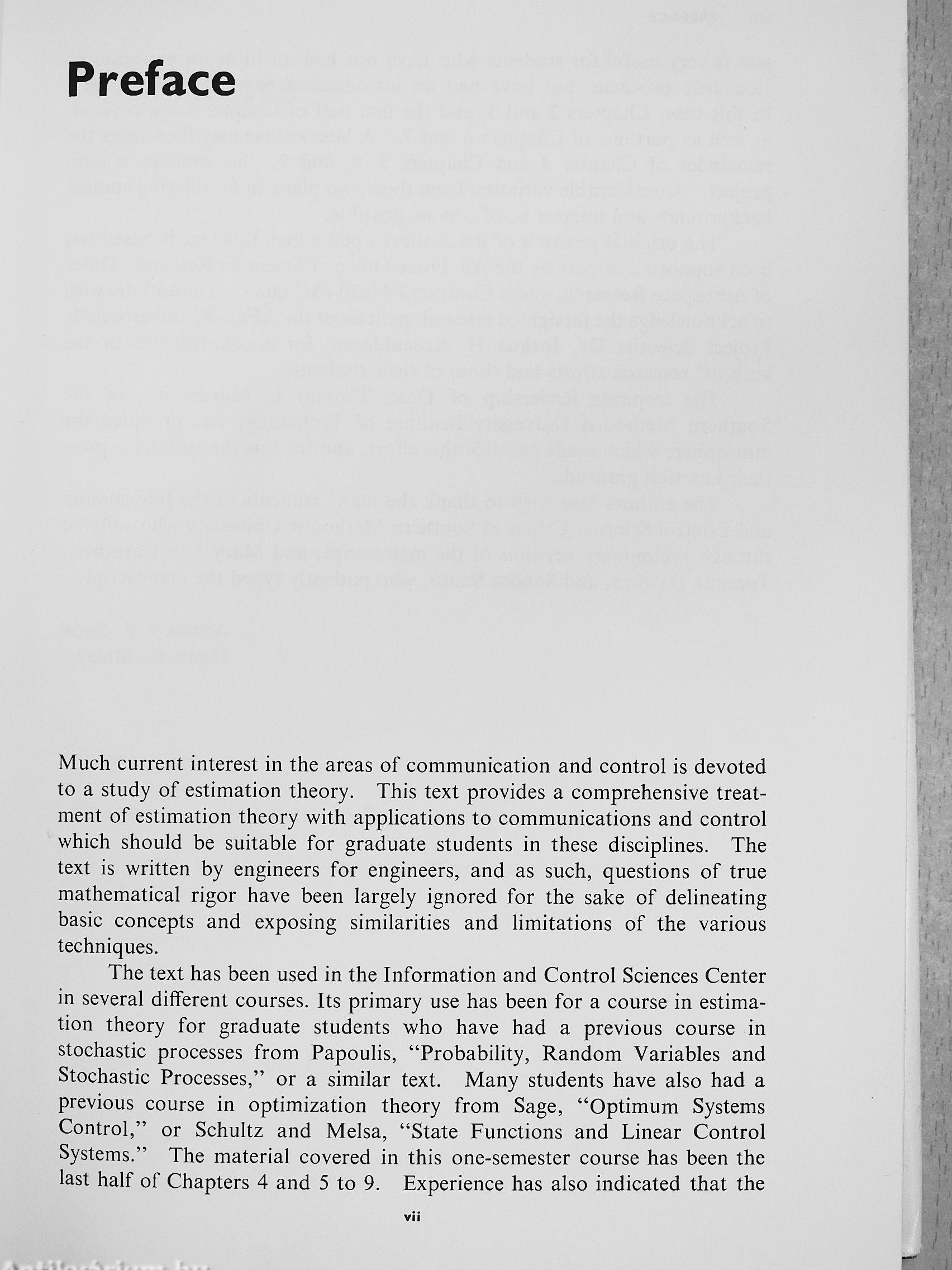 Andrew Sage and James Melsa have succeeded in writing a comprehensive text that covers estimation theory, including decision theory, in its entirety, and examines its applications to communications and control. It is important to note at the outset that this is a book that has been written by engineers for engineers. Therefore, questions of true mathematical rigor have been largely ignored for three reasons: (1) to facilitate the delineating of basic concepts, (2) to expose the similarities and limitations among various techniques, and (3) to make this most important material accessible to the widest possible audience.