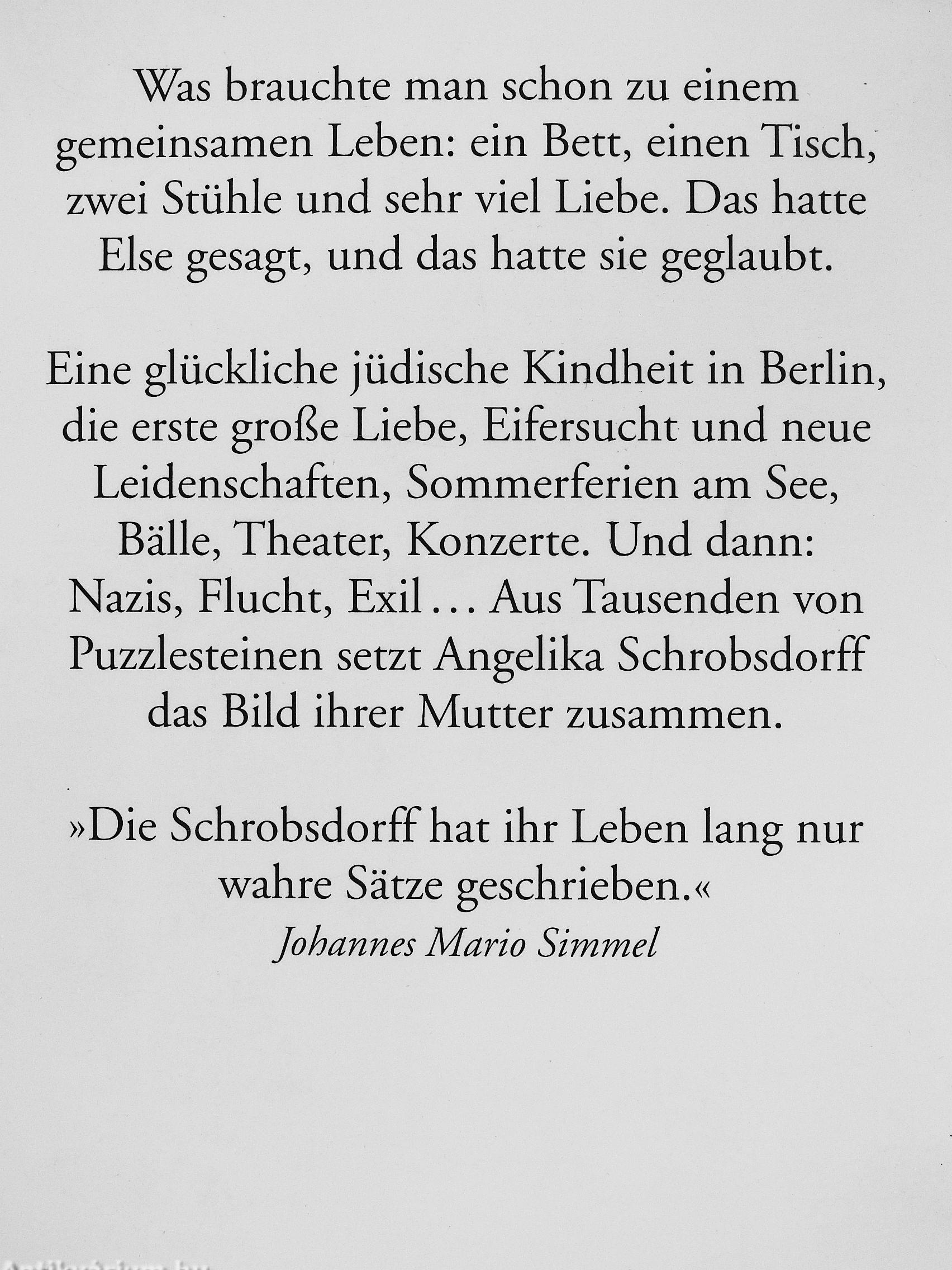 Eine glückliche jüdische Kindheit in Berlin, die erste große Liebe, Eifersucht und neue Leidenschaften, Sommerferien am See, Bälle, Theater, Konzerte. Und dann: Nazis, Flucht, Exil Aus Tausenden von Puzzlesteinen setzt Angelika Schrobsdorff das Bild ihrer Mutter zusammen.