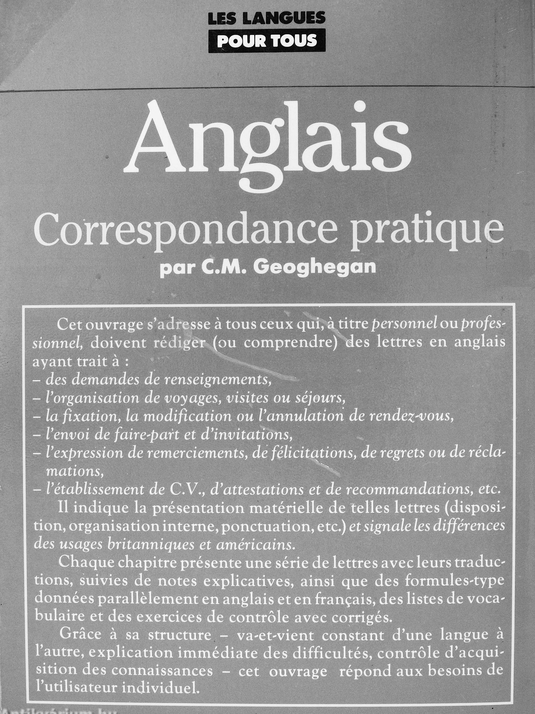 Chaque chapitre présente une série de lettres avec leurs traductions, suivies de notes explicatives, ainsi que des formules-type données parallelement en anglais et en français, des listes de vocabulaire et des exercices de contrôle avec corrigés.