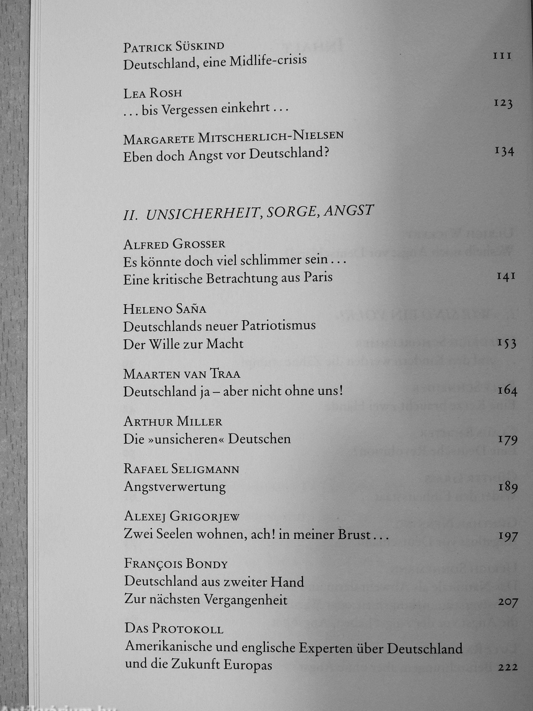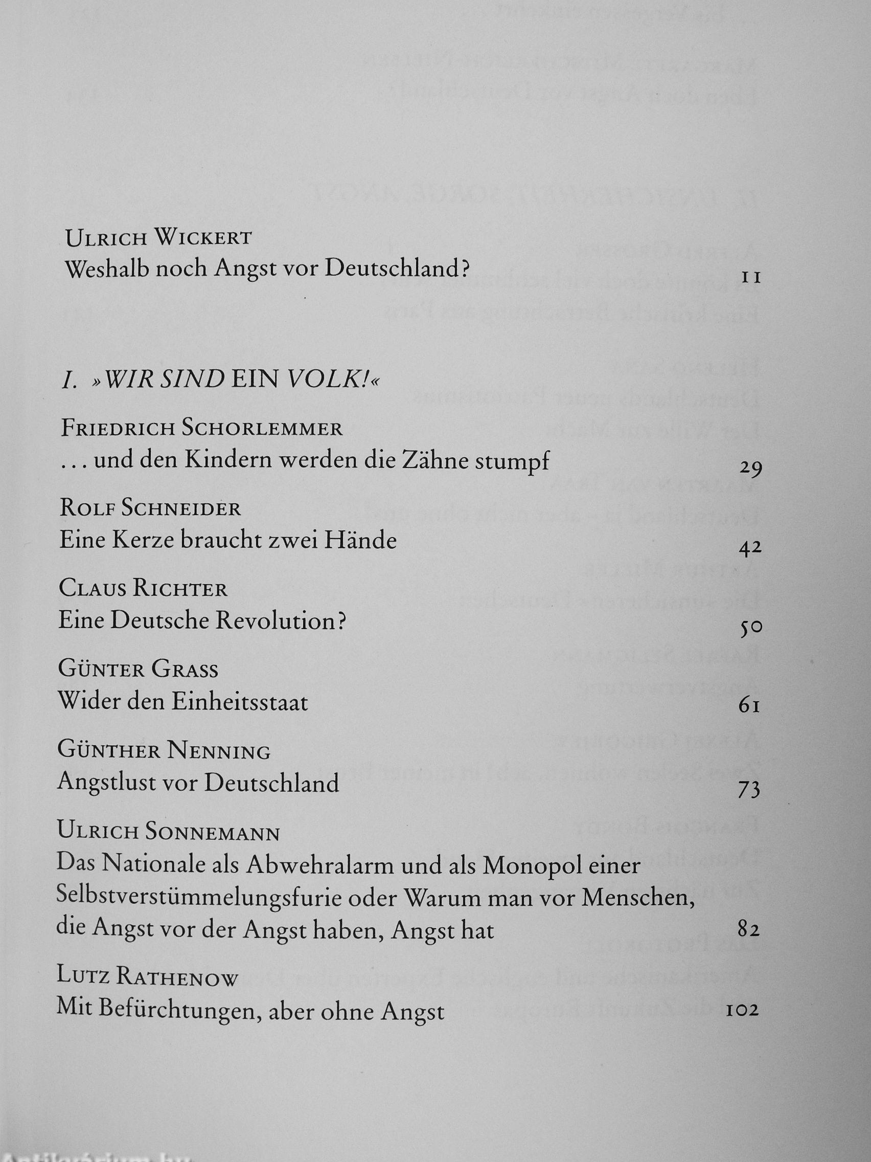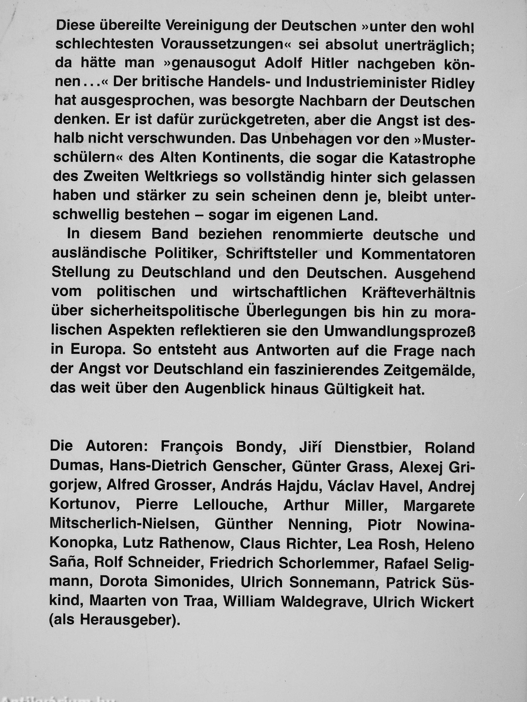 Die Autoren: François Bondy, Jifi Dienstbier, Roland Dumas, Hans-Dietrich Genscher, Günter Grass, Alexej Gri-gorjew, Alfred Grosser, András Hajdu, Václav Havel, Andrej Kortunov, Pierre Lellouche, Arthur Miller, Margarete Mitscherlich-Nielsen, Günther Nenning, Piotr Nowina-Konopka, Lutz Rathenow, Claus Richter, Lea Rosh, Heleno Sana, Rolf Schneider, Friedrich Schorlemmer, Rafael Seligmann, Dorota Simonides, Ulrich Sonnemann, Patrick Süskind, Maarten von Traa, William Waidegrave, Ulrich Wickert (als Herausgeber).