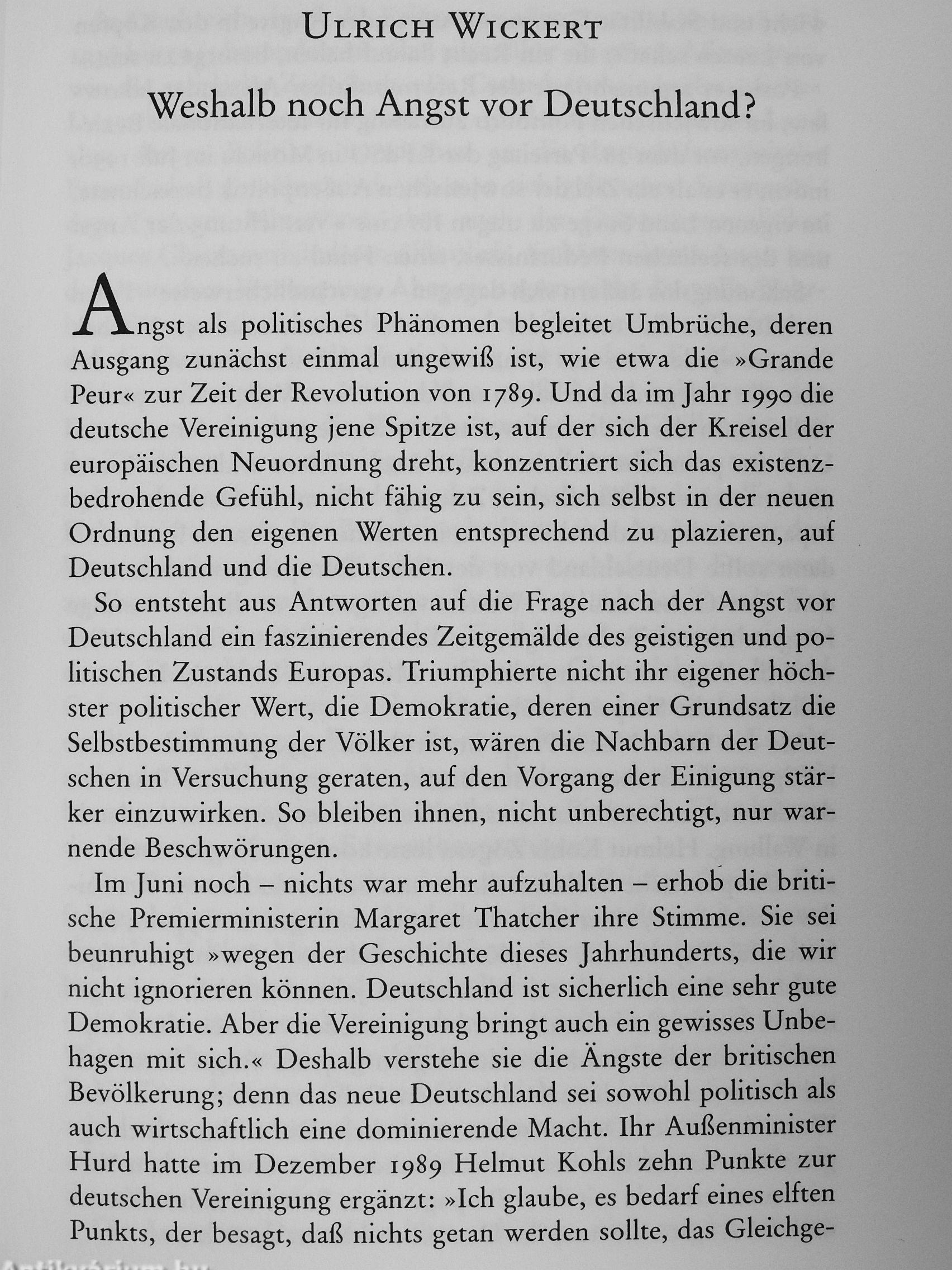 Diese übereilte Vereinigung der Deutschen »unter den wohl schlechtesten Voraussetzungen« sei absolut unerträglich; da hätte man »genausogut Adolf Hitler nachgeben können « Der britische Handels- und Industrieminister Ridley hat ausgesprochen, was besorgte Nachbarn der Deutschen denken. Er ist dafür zurückgetreten, aber die Angst ist deshalb nicht verschwunden. Das Unbehagen vor den »Musterschülern« des Alten Kontinents, die sogar die Katastrophe des Zweiten Weltkriegs so vollständig hinter sich gelassen haben und stärker zu sein scheinen denn je, bleibt unterschwellig bestehen - sogar im eigenen Land.