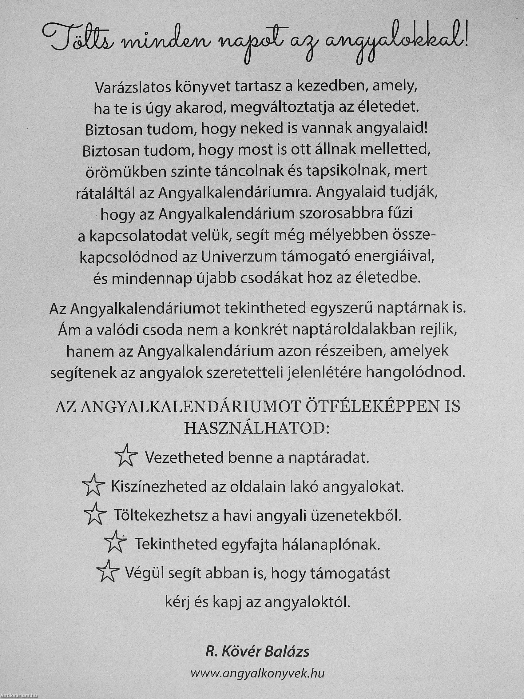 Varázslatos könyvet tartasz a kezedben, amely, ha te is úgy akarod, megváltoztatja az életedet. Biztosan tudom, hogy neked is vannak angyalaid! Biztosan tudom, hogy most is ott állnak melletted, örömükben szinte táncolnak és tapsikolnak, mert rátaláltál az Angyalkalendáriumra. Angyalaid tudják,