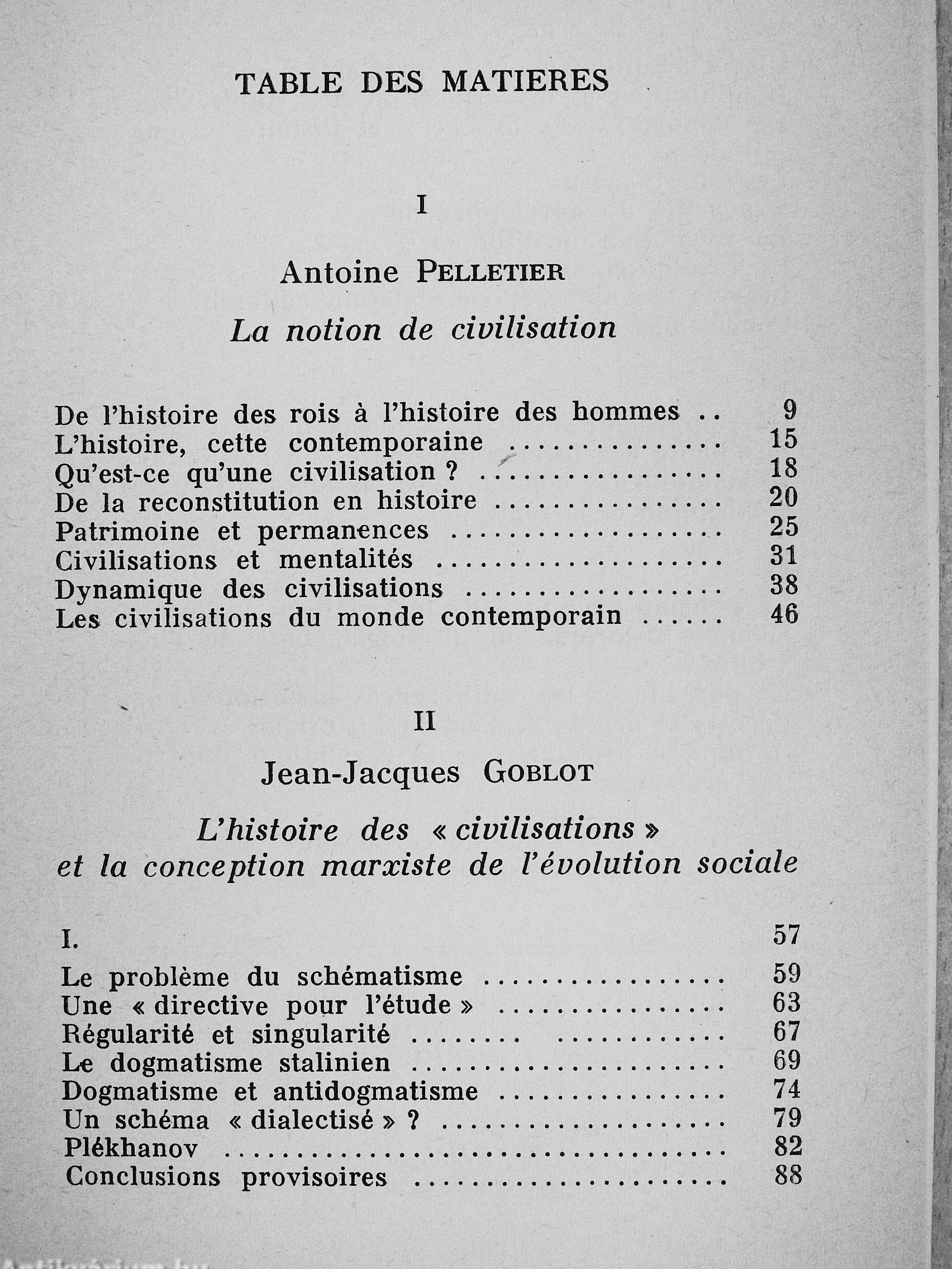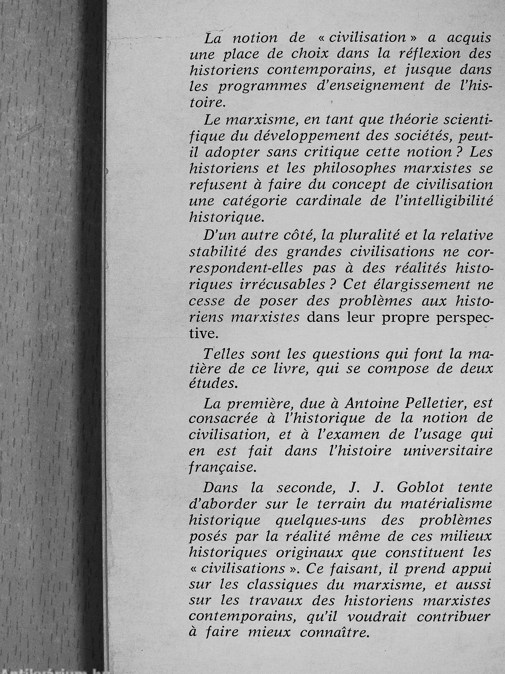 Dans la seconde, J. J. Goblot tente d'aborder sur le terrain du matérialisme historique quelques-uns des problemes posés par la réalité meme de ces milieux historiques originaux que constituent les « civilisations ». Ce faisant, il prend appui sur les classiques du marxisme, et aussi sur les travaux des historiens marxistes contemporains, qu'il voudrait contribuer a faire mieux connaître. Vissza