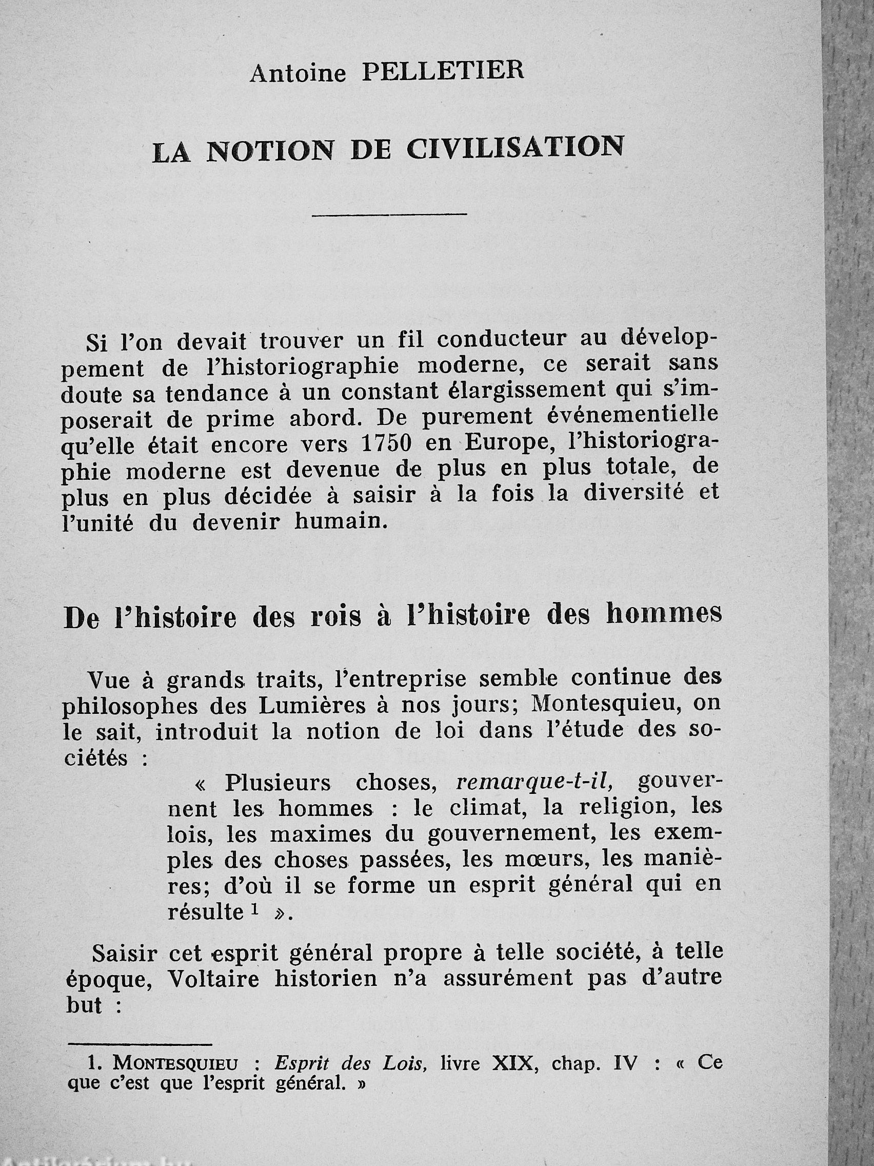 La premiere, due a Antoine Pelletier, est consacrée a l'historique de la notion de civilisation, et a l'examen de l'usage qui en est fait dans l'histoire universitaire française.