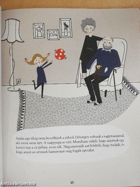 „Mindenki ott volt, amikor anya hazajött, mintha születésnapot ünnepeltünk volna. Mondtam is a nagypapának, hogy kár, hogy nincs ma szülinap, mert olyan szépen összejöttünk. Nagypapa azt mondta, hogy bizonyos értelemben ez is egy szülinap, anya újjászületett. A felnőttek mindig akkor mondják azt, hogy bizonyos értelemben, ha valami egyáltalán nem az, aminek nevezik. Vagyis nem volt torta." Gyermekien derűs az a hang, ahogyan Tóth Krisztina kislány hőse a betegségről beszél. Ha valamelyik szülő megbetegszik, az nehezen feldolgozható trauma a gyerek számára. Erről lehetne szomorúan írni, de a szerző inkább viccesen, a tőle megszokott friss szemlélettel közelít ehhez a tabutémához is. Elmagyarázza a gyerekeknek, hogy mit jelent egy daganat, hogy a betegségből meg lehet gyógyulni, és hogy mindenről lehet, sőt kell is beszélgetnünk. Humoros könyv, amely megmutatja, hogyan vészelhetünk át egy családi válságot, hogyan értethetjük meg a kicsikkel, hogy semmi sem félelmetes, ha mi, felnőttek világosan és tisztán beszélünk róla. Vissza