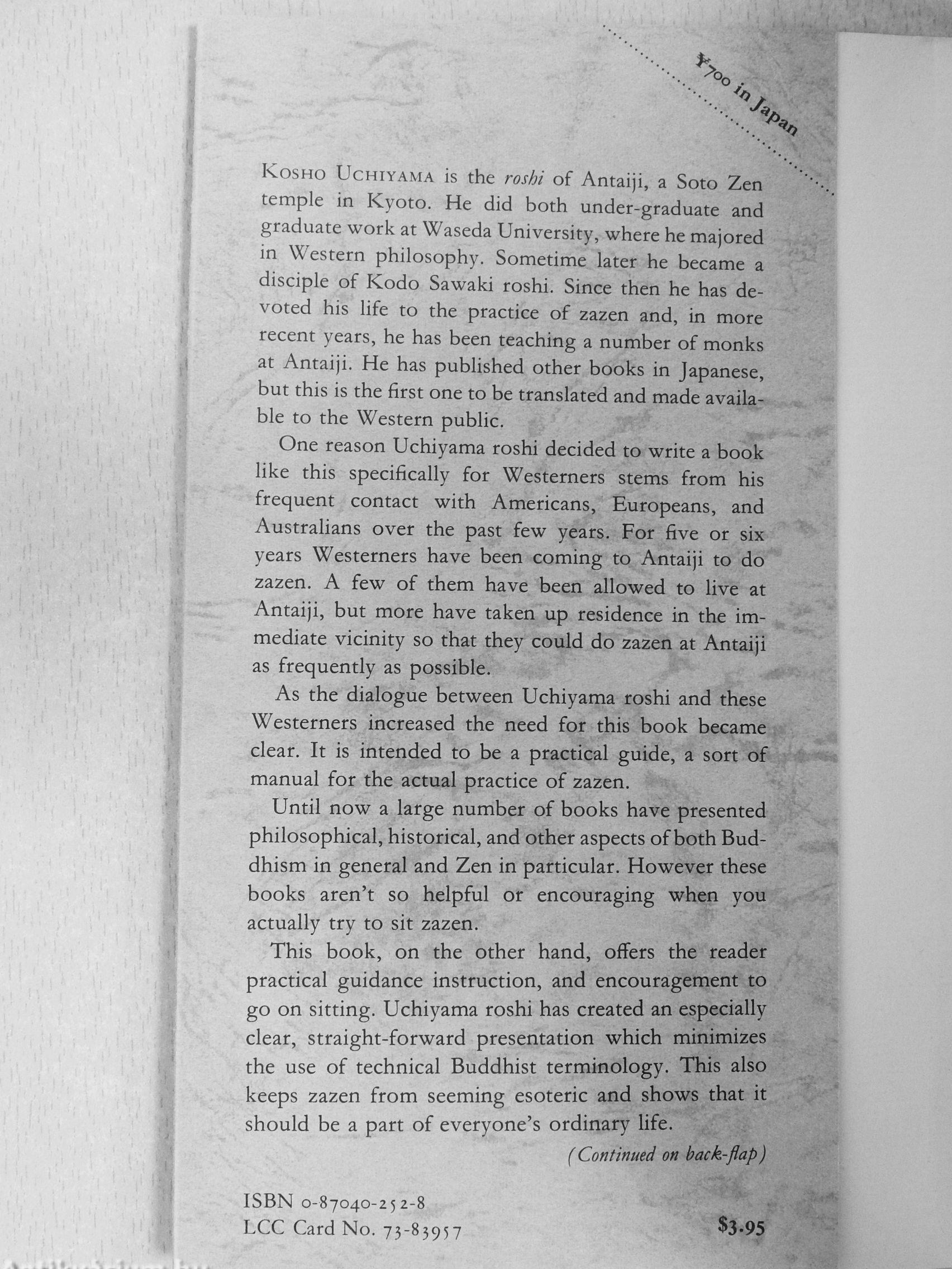 This book, on the other hand, offers the reader practical guidance instruction, and encouragement to go on sitting. Uchiyama roshi has created an especially clear, straight-forward presentation which minimizes the use of technical Buddhist terminology. This also keeps zazen from seeming esoteric and shows that it should be a part of everyone's ordinary life.