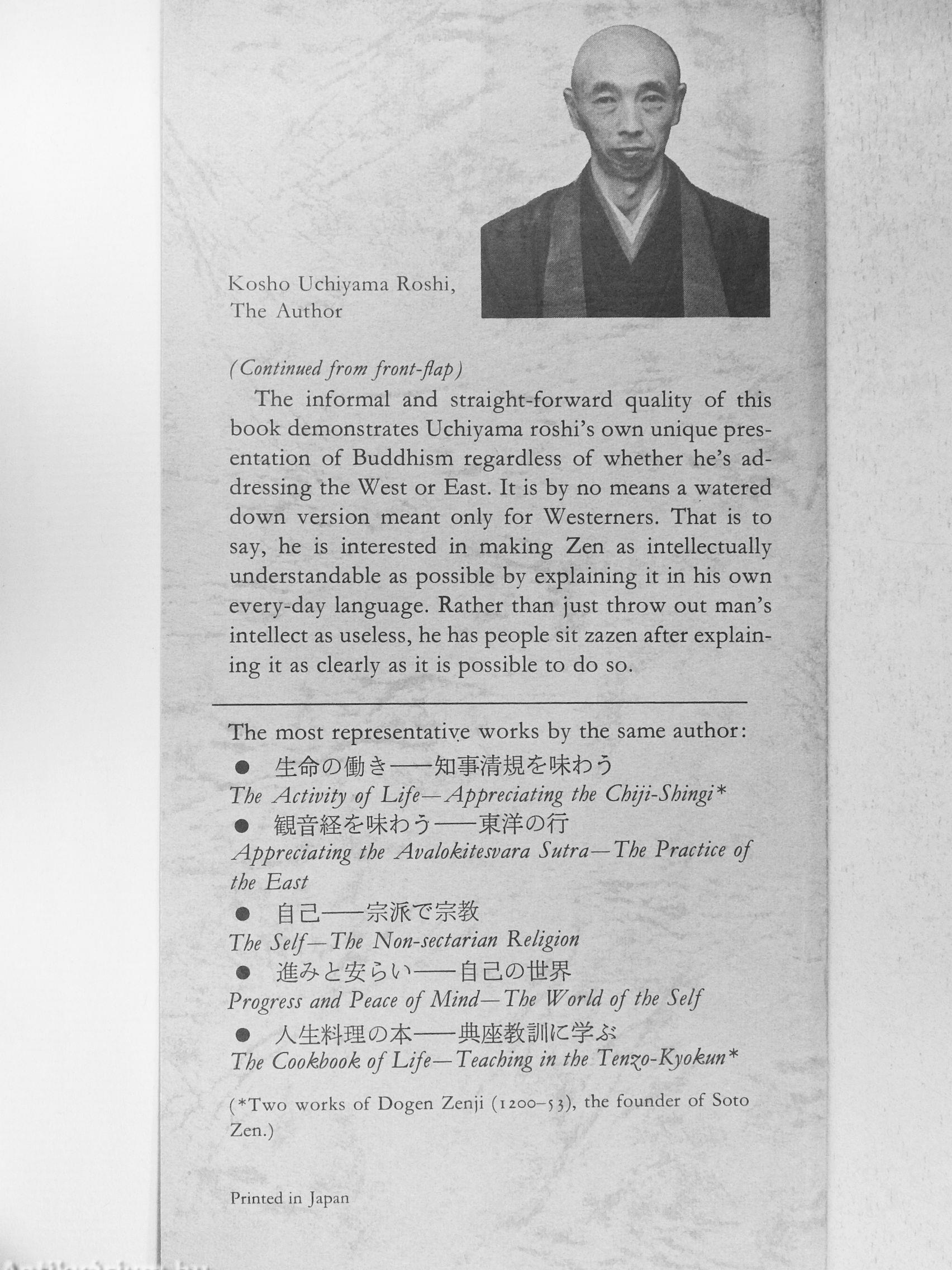 Kosho Uchiyama is the roshi of Antaiji, a Soto Zen temple in Kyoto. He did both under-graduate and graduate work at Waseda University, where he majored in Western philosophy. Sometime later he became a disciple of Kodo Sawaki roshi. Since then he has devoted his life to the practice of zazen and, in more recent years, he has been teaching a number of monks at Antaiji. He has published other books in Japanese, but this is the first one to be translated and made available to the Western public.