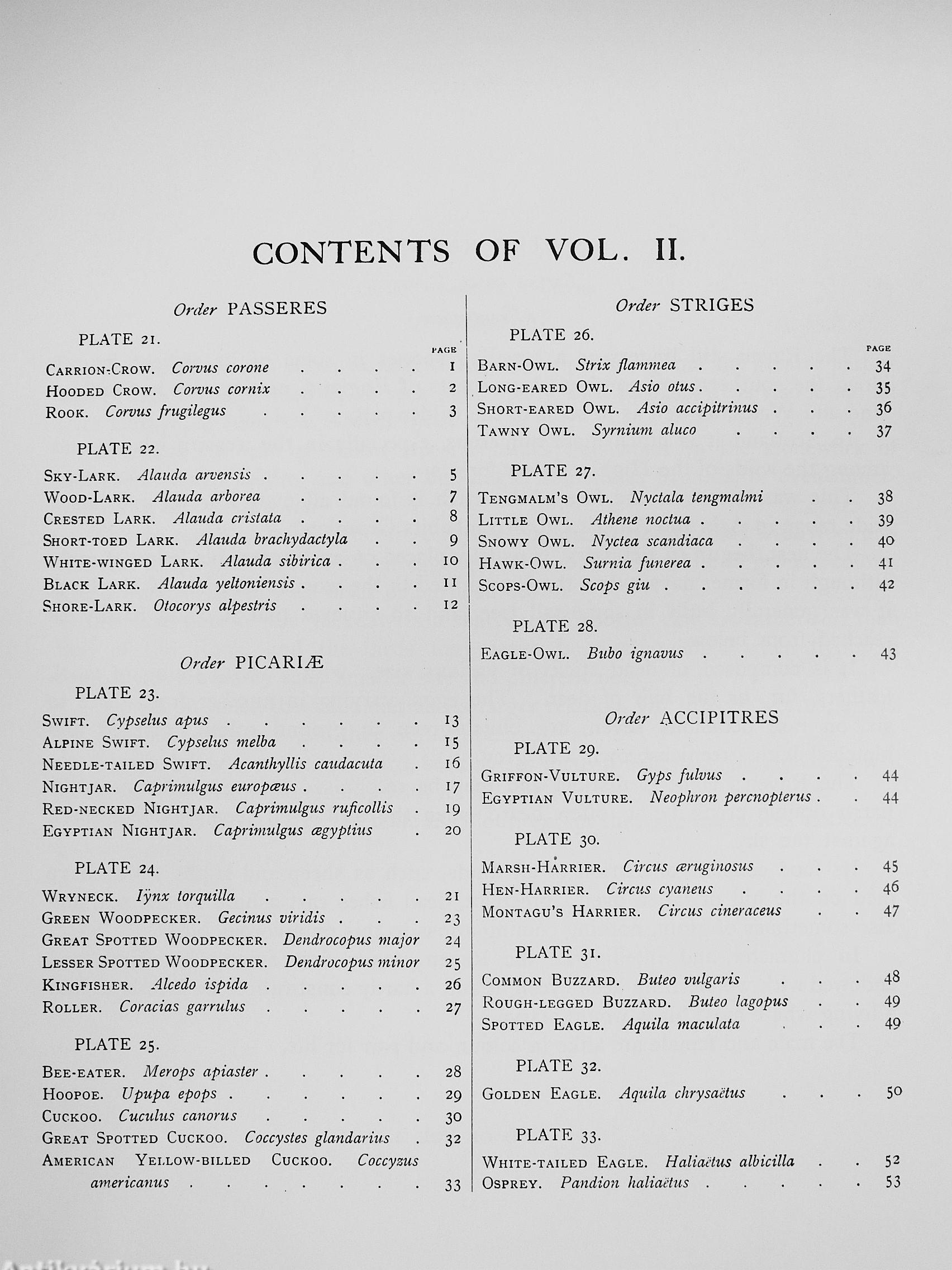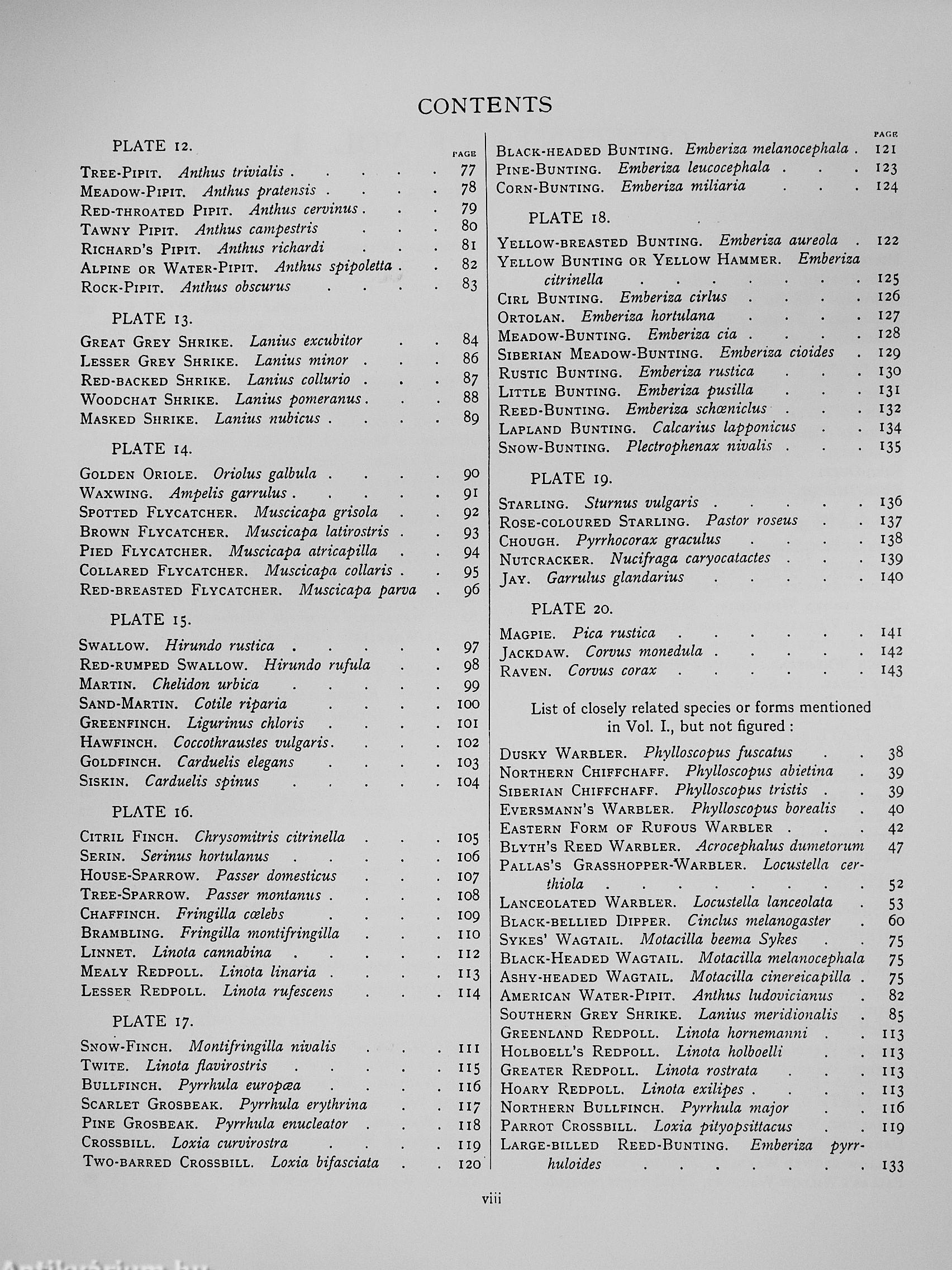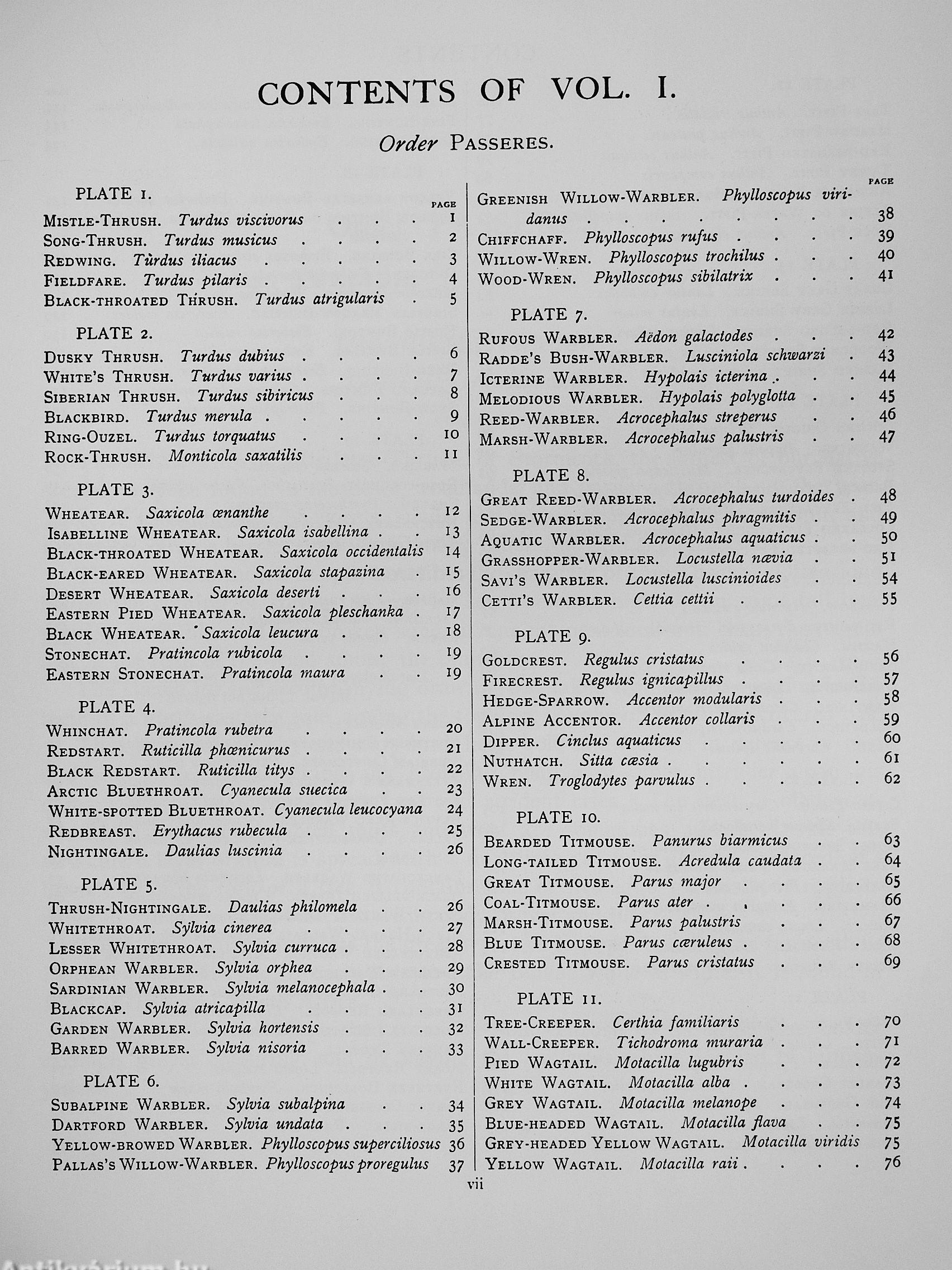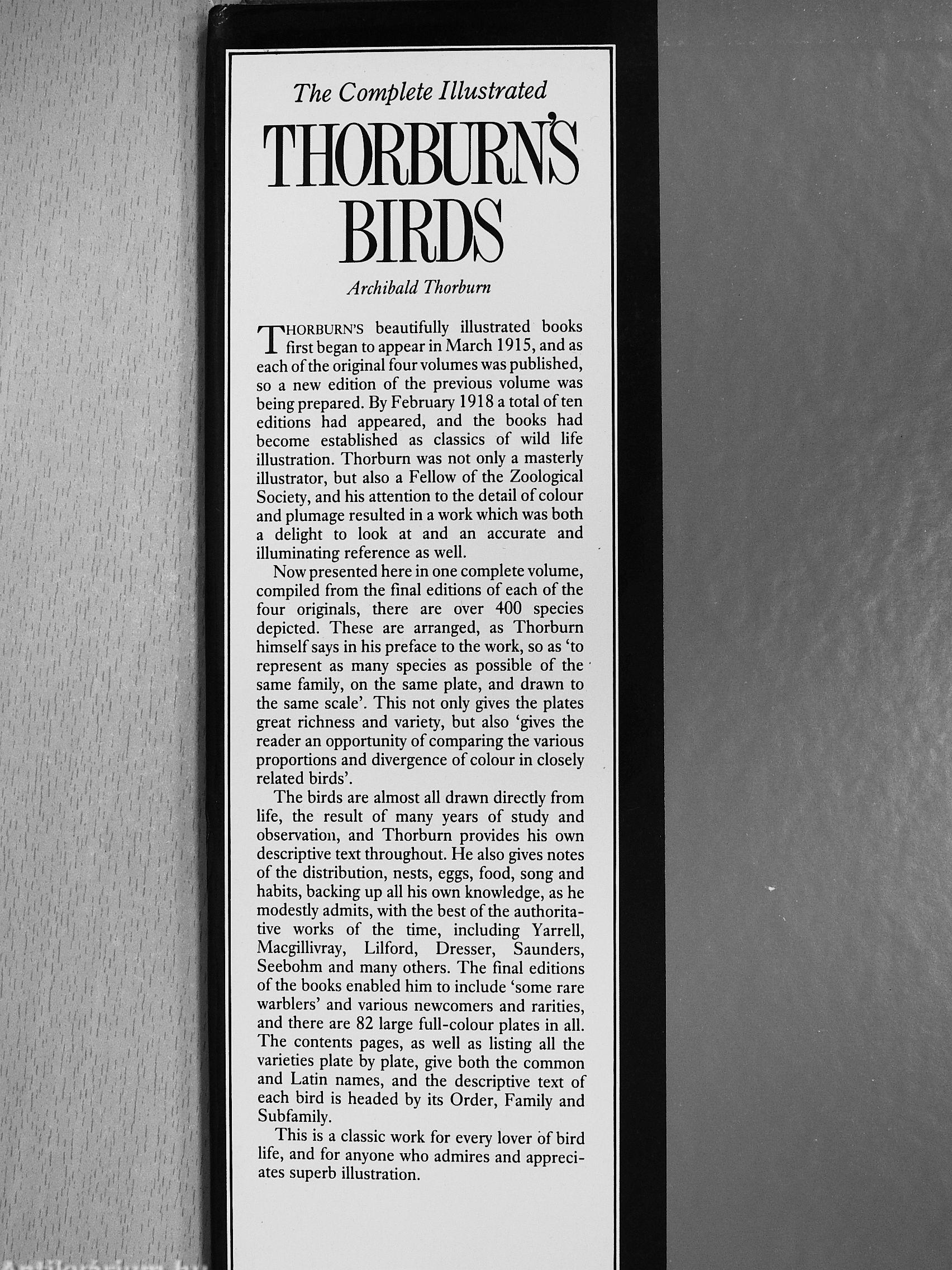 The birds are almost all drawn directiy from life, die result of many years of study and observation, and Thorburn provides his own descriptive text throughout. He also gives notes of the distribution, nests, eggs, food, song and habits, backing up all his own knowledge, as he modestiy admits, with the best of the authoritative works of the time, including Yarrell, Macgillivray, Lilford, Dresser, Saunders, Seebohm and many others. The final editions of the books enabled him to include 'some rare warblers' and various newcomers and rarities, and there are 82 large full-colour plates in all. The contents pages, as well as listing all die varieties plate by plate, give both the common and Latin names, and the descriptive text of each bird is headed by its Order, Family and Subfamily.