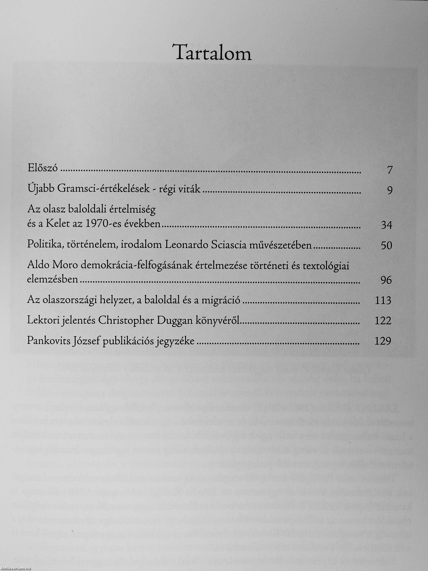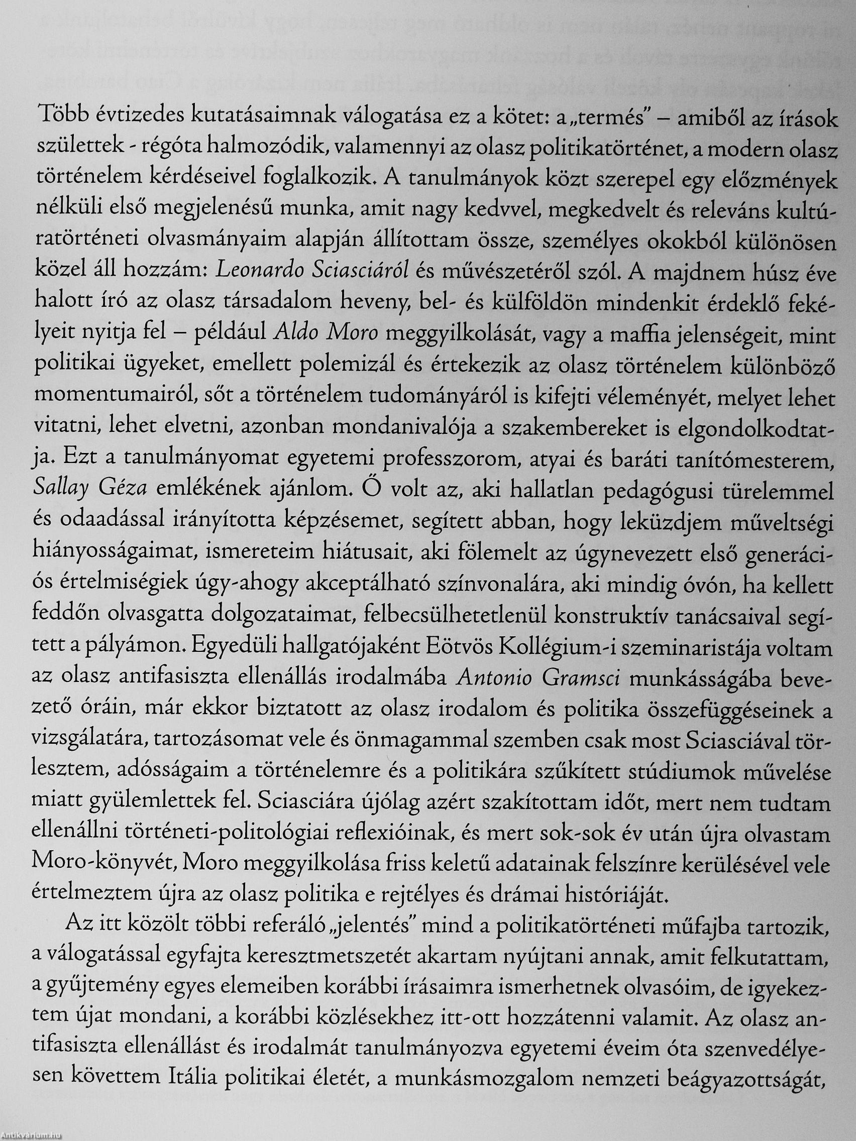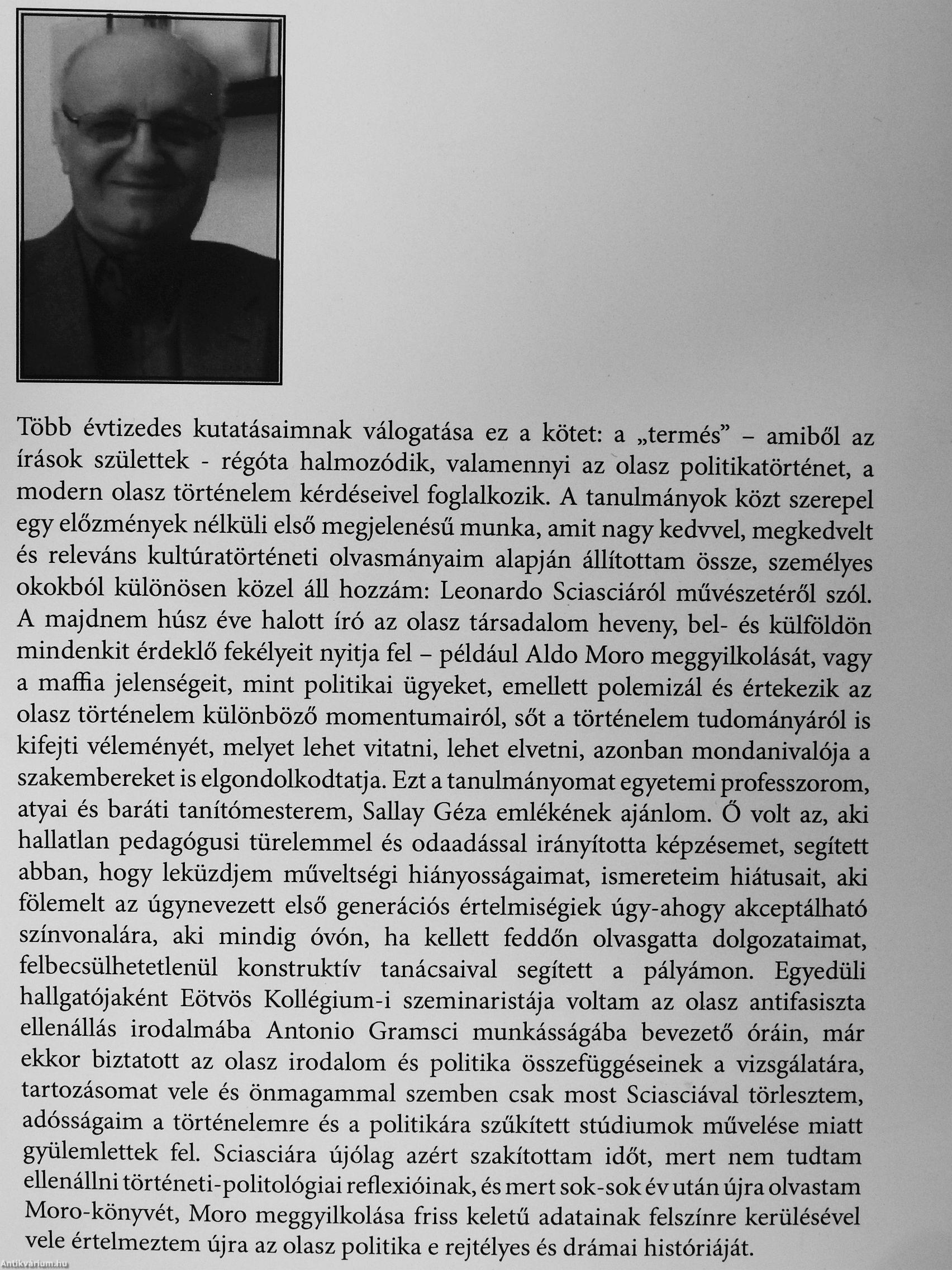 Több évtizedes kutatásaimnak válogatása ez a kötet: a „termés" - amiből az írások születtek - régóta halmozódik, valamennyi az olasz politikatörténet, a modern olasz történelem kérdéseivel foglalkozik. A tanulmányok közt szerepel egy előzmények nélküli első megjelenésű munka, amit nagy kedvvel, megkedvelt és releváns kultúratörténeti olvasmányaim alapján állítottam össze, személyes okokból különösen közel áll hozzám: Leonardo Sciasciáról művészetéről szól. A majdnem húsz éve halott író az olasz társadalom heveny, bel- és külföldön mindenkit érdeklő fekélyeit nyitja fel - például Aldo Moro meggyilkolását, vagy a maffia jelenségeit, mint politikai ügyeket, emellett polemizál és értekezik az olasz történelem különböző momentumairól, sőt a történelem tudományáról is kifejti véleményét, melyet lehet vitatni, lehet elvetni, azonban mondanivalója a szakembereket is elgondolkodtatja. Ezt a tanulmányomat egyetemi professzorom, atyai és baráti tanítómesterem, Sallay Géza emlékének ajánlom. Ö volt az, aki hallatlan pedagógusi türelemmel és odaadással irányította képzésemet, segített abban, hogy leküzdjem műveltségi hiányosságaimat, ismereteim hiátusait, aki fölemelt az úgynevezett első generációs értelmiségiek úgy-ahogy akceptálható színvonalára, aki mindig óvón, ha kellett feddőn olvasgatta dolgozataimat, felbecsülhetetlenül konstruktív tanácsaival segített a pályámon. Egyedüli hallgatójaként Eötvös KoUégium-i szeminarístája voltam az olasz antifasiszta ellenállás irodalmába Antonio Gramscí munkásságába bevezető óráin, már ekkor biztatott az olasz irodalom és politika összefüggéseinek a vizsgálatára, tartozásomat vele és önmagammal szemben csak most Sciascíával törlesztem, adósságaim a történelemre és a politikára szűkített stúdiumok művelése miatt gyülemlettek fel. Sciasciára újólag azért szakítottam időt, mert nem tudtam ellenállni történeti-politológiai reflexióinak, és mert sok-sok év után újra olvastam Moro-könyvét, Moro meggyilkolása friss keletű adatainak felszínre kerülésével vele értelmeztem újra az olasz politika e rejtélyes és drámai históriáját. Vissza