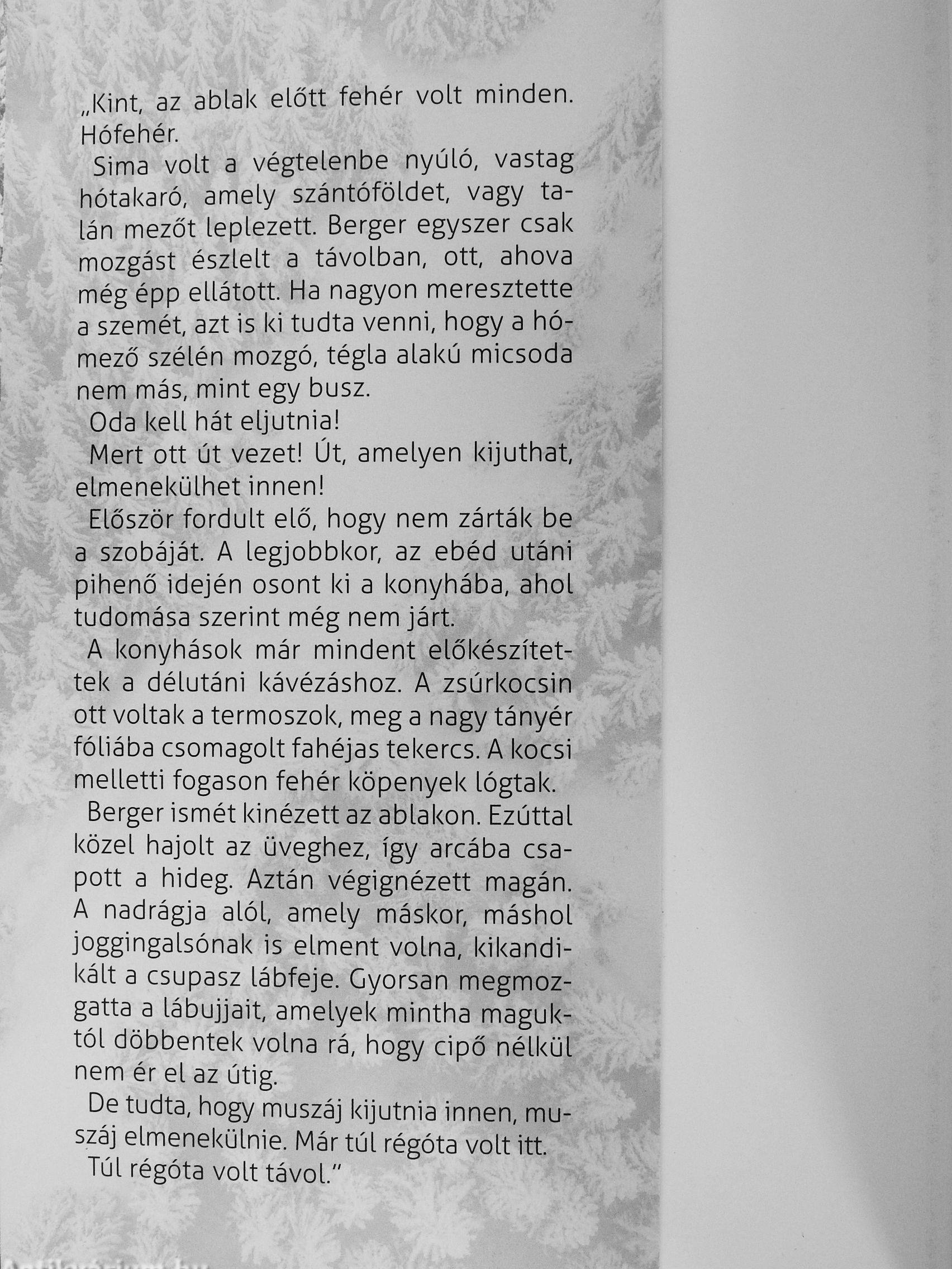 Sima volt a végtelenbe nyúló, vastag hótakaró, amely szántóföldet, vagy talán mezőt leplezett. Berger egyszer csak mozgást észlelt a távolban, ott, ahova még épp ellátott. Ha nagyon meresztette a szemét, azt is ki tudta venni, hogy a hómező szélén mozgó, tégla alakú micsoda nem más, mint egy busz. Oda kell hát eljutnia! Mert ott út vezet! Út, amelyen kijuthat, elmenekülhet innen! Először fordult elő, hogy nem zárták be a szobáját. A legjobbkor, az ebéd utáni pihenő idején osont ki a konyhába, ahol tudomása szerint még nem járt. A í<onyhások már mindent előkészítettek a délutáni kávézáshoz. A zsúrl<ocsin ott voltak a termoszok, meg a nagy tányér fóliába csomagolt fahéjas tel<ercs. A kocsi melletti fogason fehér köpenyek lógtak. Berger ismét kinézett az ablakon. Ezúttal l<özel hajolt az üveghez, így arcába csapott a hideg. Aztán végignézett magán. A nadrágja alól, amely másl<or, máshol joggingalsónak is elment volna, kikandikált a csupasz lábfeje. Gyorsan megmozgatta a lábujjait, amelyek mintha maguí<-tól döbbentek volna rá, hogy cipő nélkül nem ér el az útig.