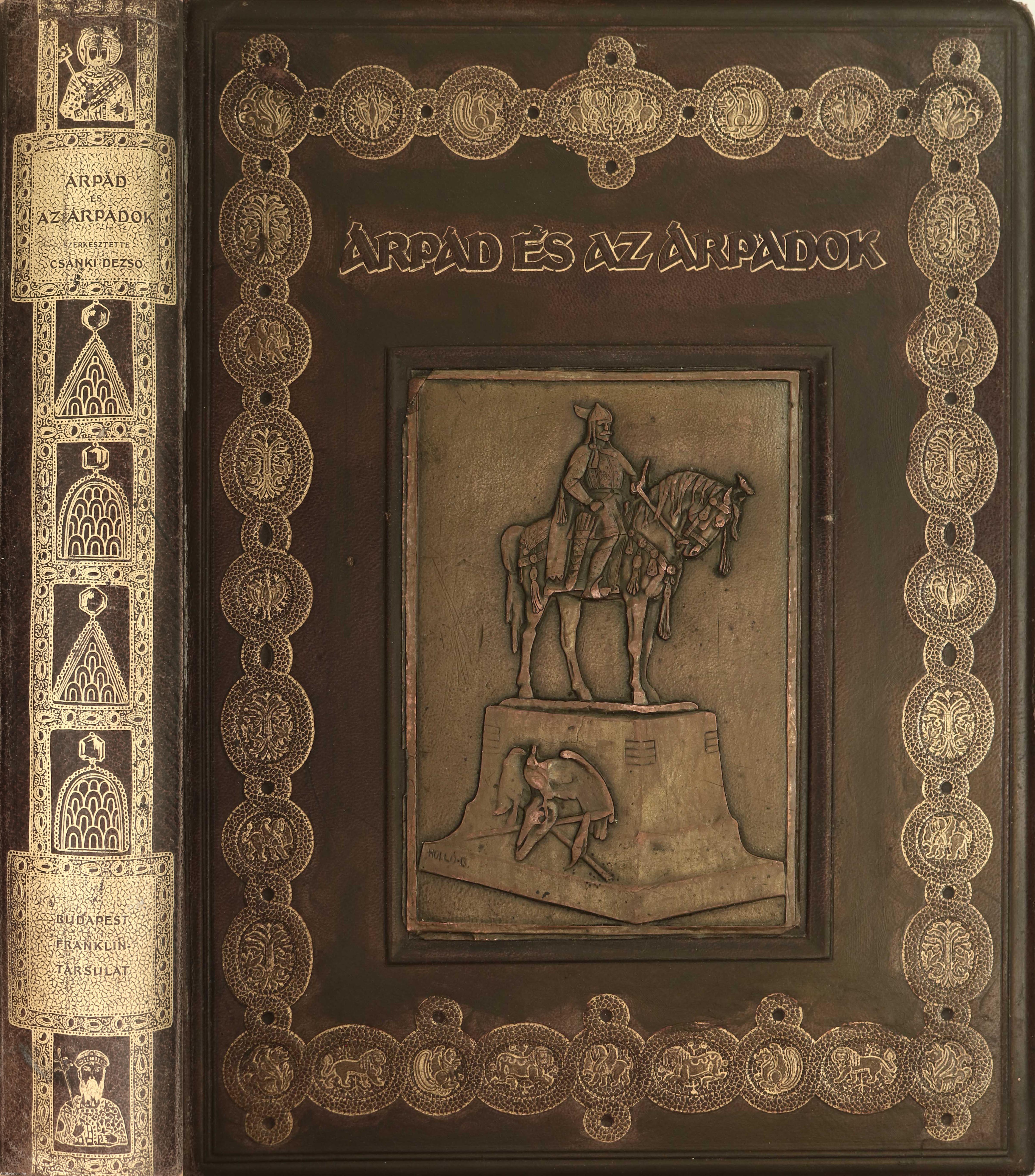 | A bekötési tábla bélés-oldalai: elől a nagyszentmiklósi lelet aranyedényeinek állatalakjai és díszítményi részletei; hátul Árpád-Szent-Erzsébet cividalei imakönyve hátsó fedele, s e fedélnek egyes részletei | |
