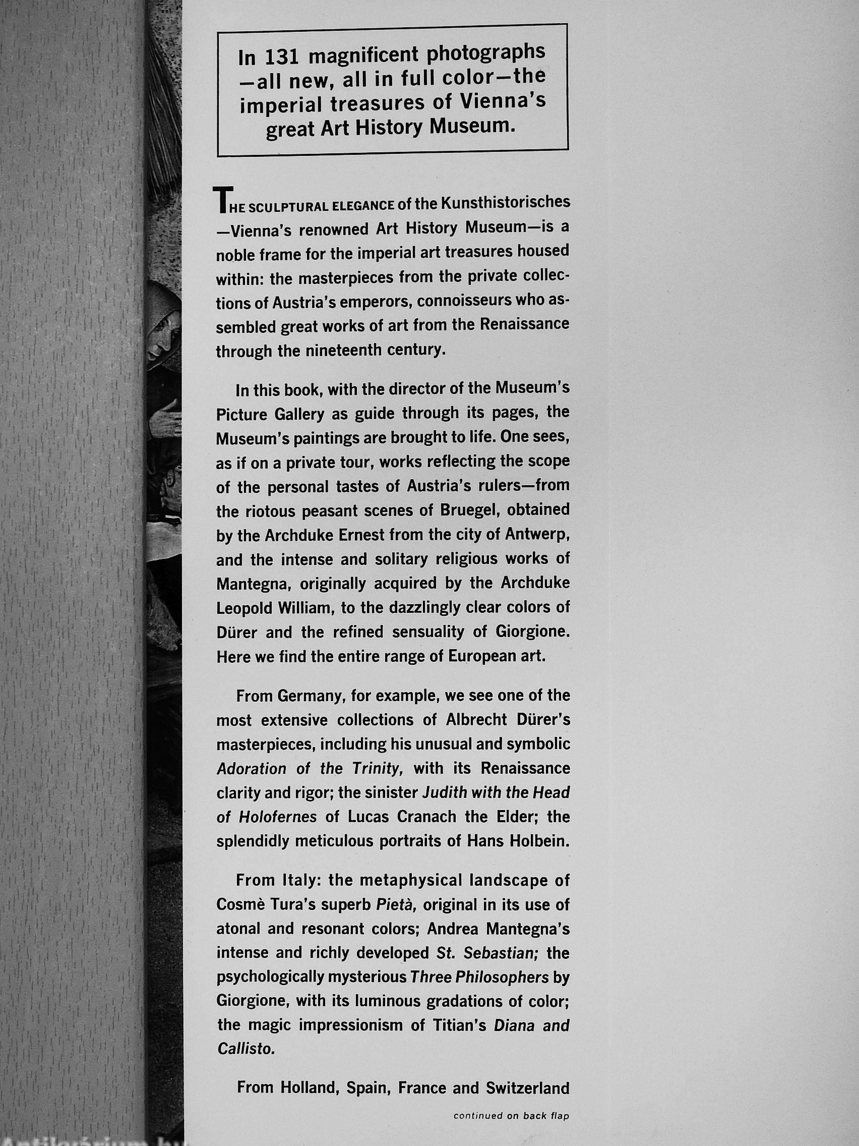 In this book, with the director of the Museum's Picture Gallery as guide through its pages, the Museum's paintings are brought to life. One sees, as if on a private tour, works reflecting the scope of the personal tastes of Austria's rulers—from the riotous peasant scenes of Bruegel, obtained by the Archduke Ernest from the city of Antwerp, and the intense and solitary religious works of Mantegna, originally acquired by the Archduke Leopold William, to the dazzlingly clear colors of Dürer and the refined sensuality of Giorgione. Here we find the entire range of European art.