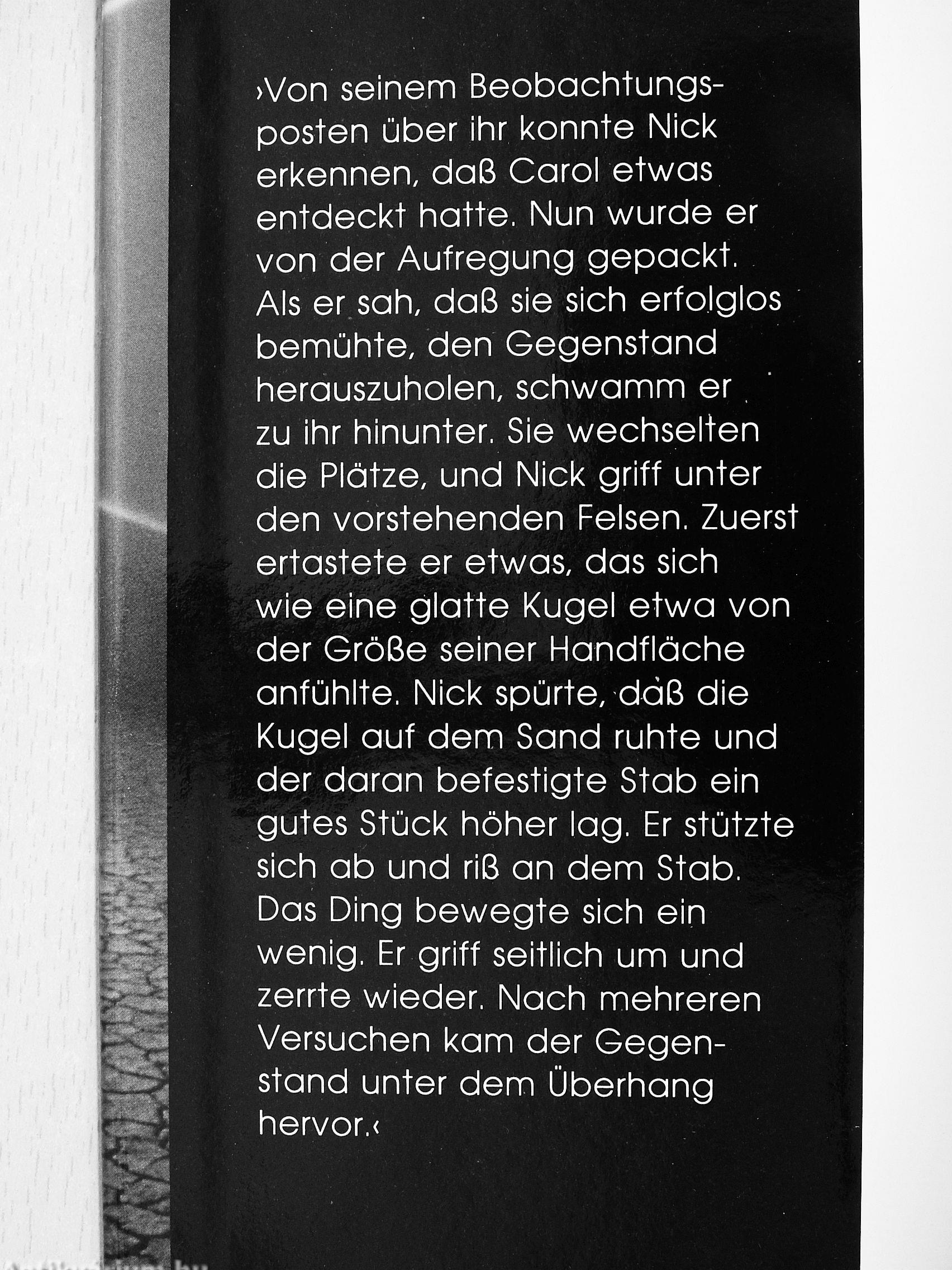 >Von seinem Beobachtungsposten über ihr konnte Nick erkennen, daß Carol etwas entdeckt hatte. Nun wurde er von der Aufregung gepackt. Als er sah, daß sie sich erfolglos bemühte, den Gegenstand herauszuholen, schwamm er zu ihr hinunter, Sie wechselten die Plätze, und Nick griff unter den vorstehenden Felsen. Zuerst ertastete er etwas, das sich wie eine glatte Kugel etwa von der Größe seiner Handfläche anfühlte, Nick spürte, daß die Kugel auf dem Sand ruhte und der daran befestigte Stab ein gutes Stück höher lag. Er stützte sich ab und riß an dem Stab, Das Ding bewegte sich ein wenig. Er griff seitlich um und zerrte wieder. Nach mehreren Versuchen kam der Gegenstand unter dem Überhang hervor,< Vissza