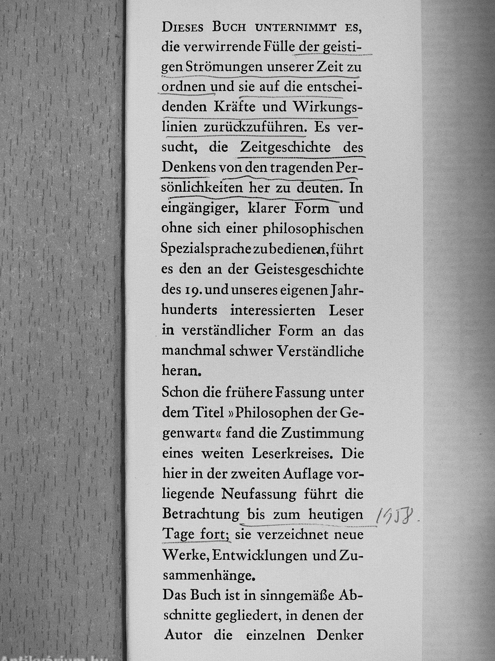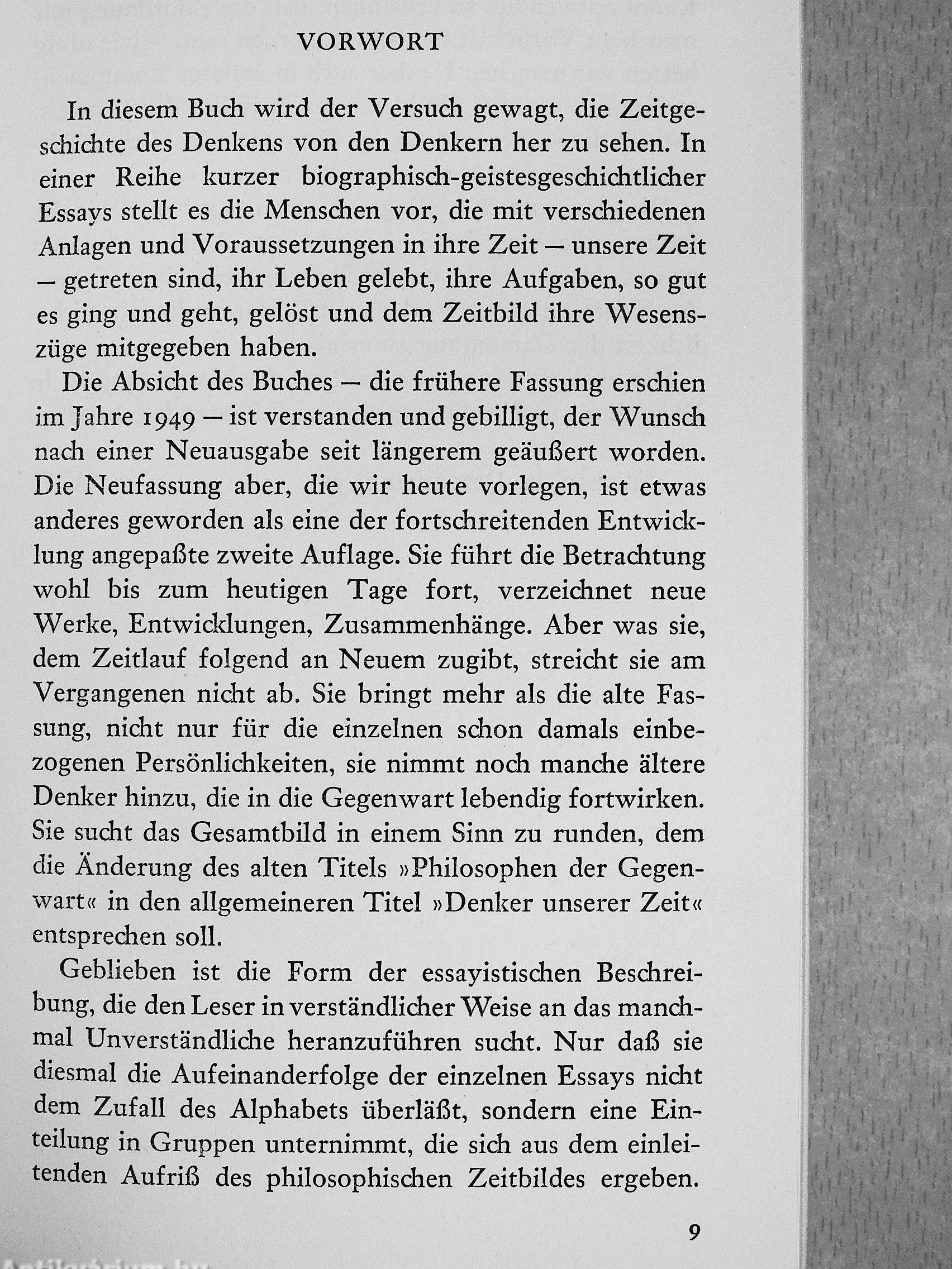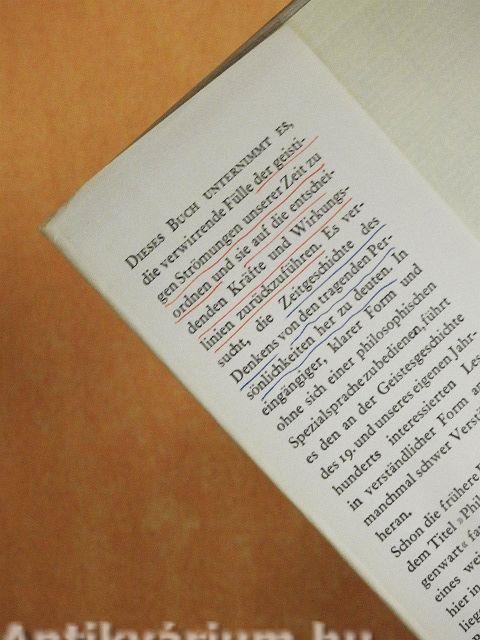 gen Strömungen unserer Zeit zu o^nenjind sie auf die entscheidenden Kräfte und Wirkungslinien zurückzuführen. Es versucht, die Zeitgeschichte des Denkens von den tragenden Persönlichkeiten her zu deuten. In eingängiger, klarer Form und ohne sich einer philosophischen spezialSprache zubedienen, führt es den an der Geistesgeschichte des 19. und unseres eigenen Jahrhunderts interessierten Leser in verständlicher Form an das manchmal schwer Verständliche heran.