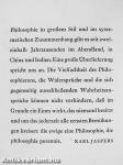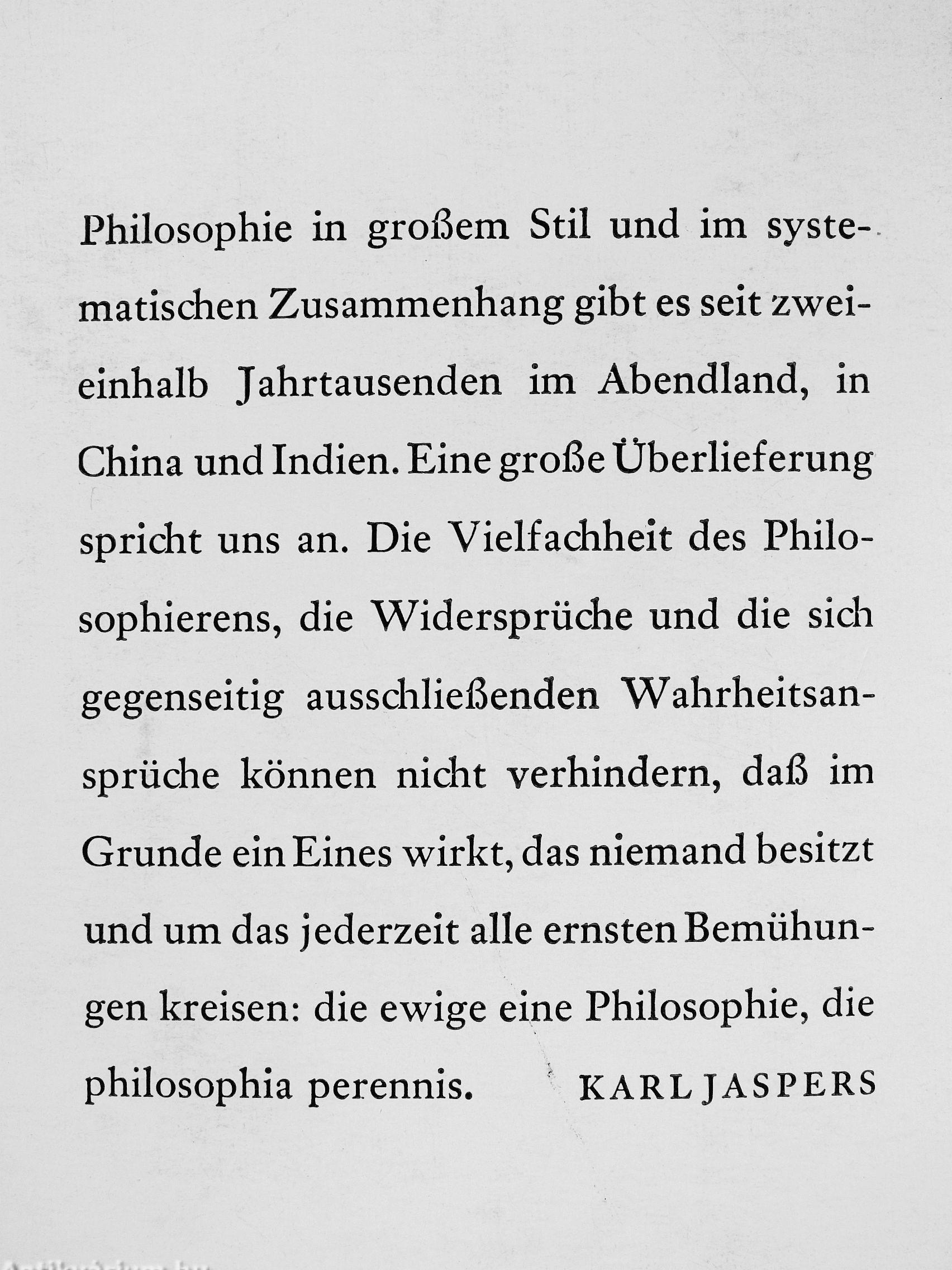 Philosophie in großem Stil und im systematischen Zusammenhang gibt es seit zweieinhalb Jahrtausenden im Abendland, in China und Indien. Eine große Überlieferung spricht uns an. Die Vielfachheit des Philosophierens, die Widersprüche und die sich gegenseitig ausschließenden Wahrheitsansprüche können nicht verhindern, daß im Grunde ein Eines wirkt, das niemand besitzt und um das jederzeit alle ernsten Bemühungen kreisen: die ewige eine Philosophie, die philosophia perennis. KARL JASPERS