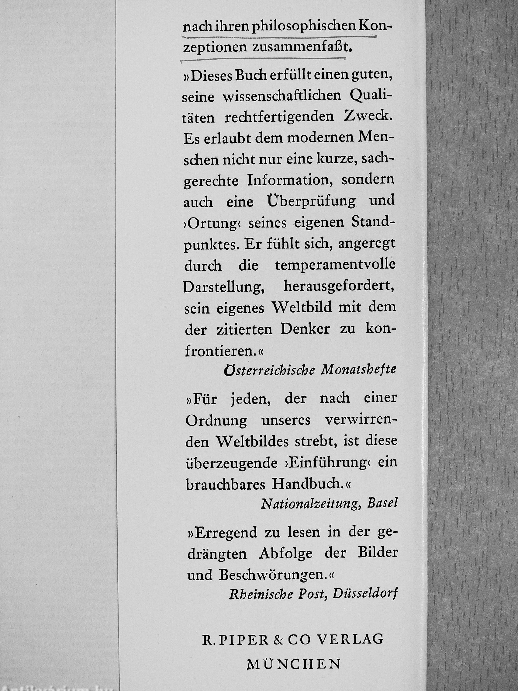 »Dieses Buch erfüllt einen guten, seine wissenschaftlichen Qualitäten rechtfertigenden Zweck. Es erlaubt dem modernen Menschen nidit nur eine kurze, sach-geredite Information, sondern audi eine Überprüfung und >Ortung{ seines eigenen Standpunktes. Er fühlt sich, angeregt durch die temperamentvolle Darstellung, herausgefordert, sein eigenes Weltbild mit dem der zitierten Denker zu konfrontieren.«