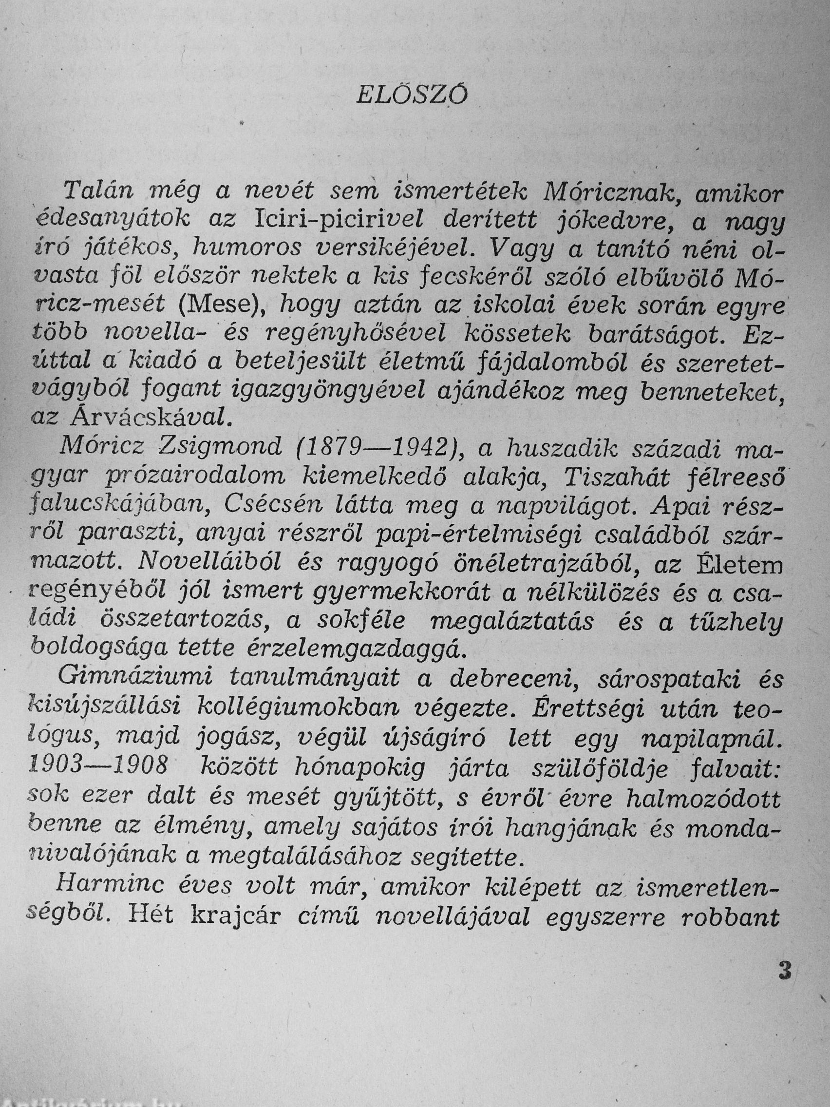 Móricz Zsigmond műveinek az Antikvarium.hu-n kapható vagy előjegyezhető listáját itt tekintheti meg: Móricz Zsigmond könyvek, művek