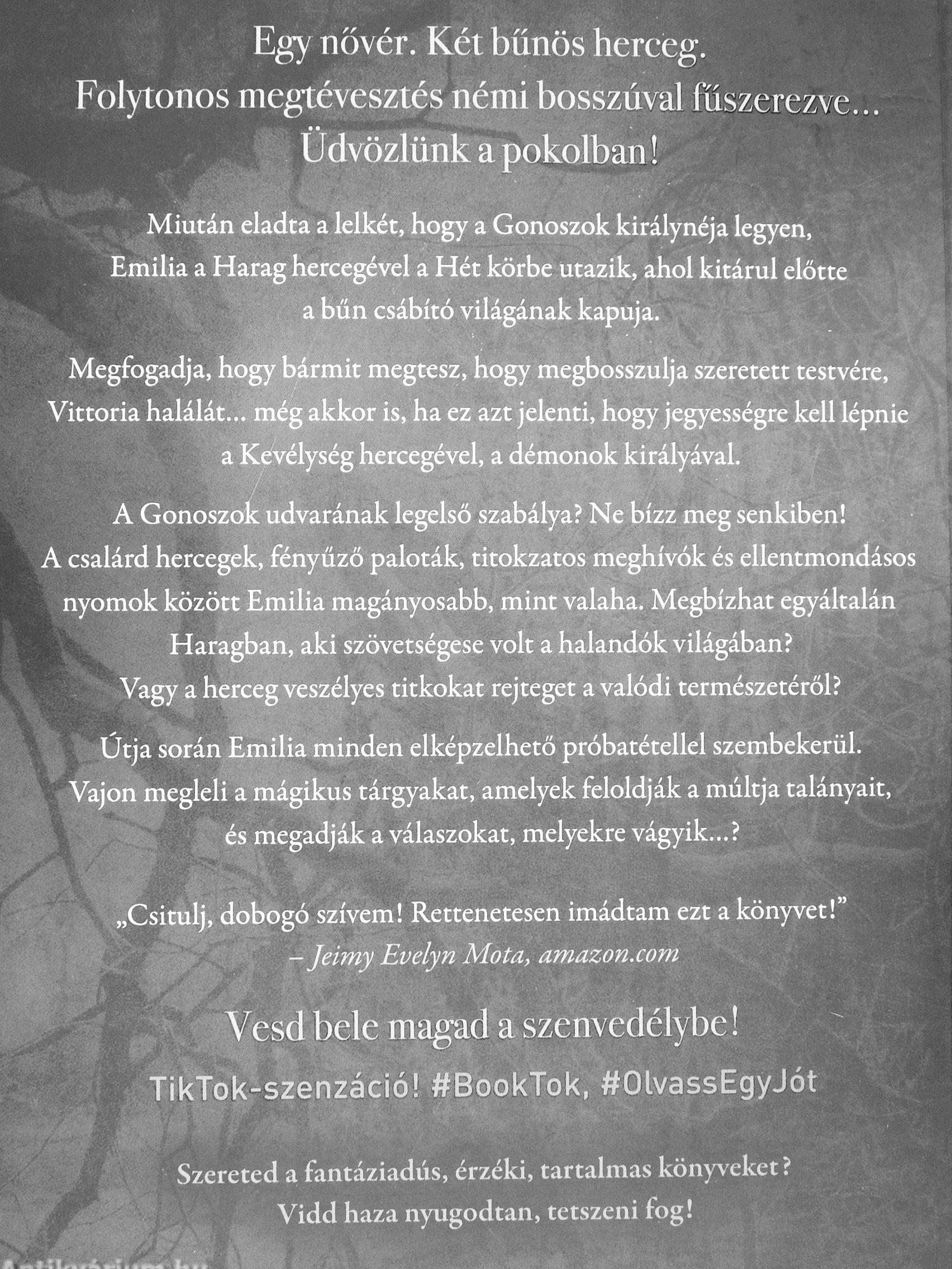A Gonoszok udvarának legelső szabálya? Ne bízz meg senkiben! A csalárd hercegek, fényűző paloták, titokzatos meghívók és ellentmondásos nyomok között Emilia magányosabb, mint valaha. Megbízhat egyáltalán Haragban, aki szövetségese volt a halandók világában? Vagy a herceg veszélyes titkokat rejteget a valódi természetéről?