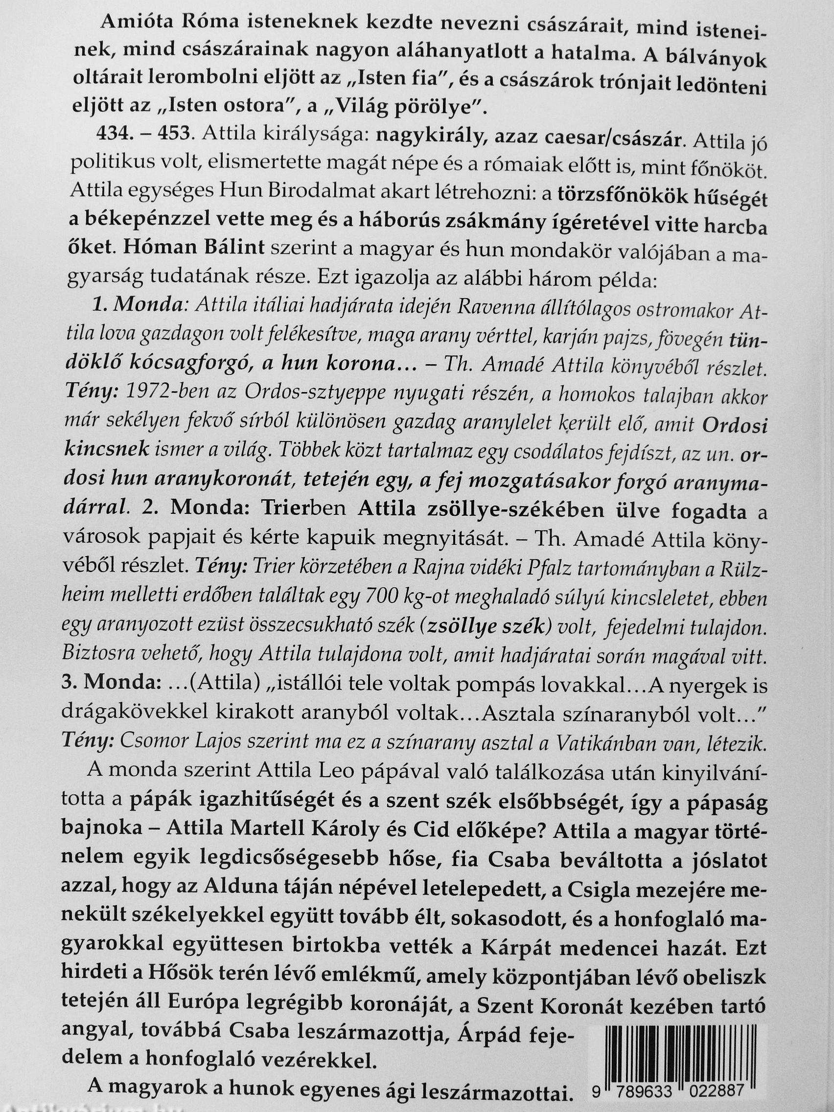 1. Monda: Attila itáliai hadjárata idején Ravenna állítólagos ostromakor Attila lova gazdagon volt felékesítve, maga arany vérttel, karján pajzs, fóvegén tündöklő kócsagforgó, a hun korona - Th. Amadé Attila könyvéből részlet. Tény: 1972-ben az Ordos-sztyeppe nyugati részén, a homokos talajban akkor már sekélyen fekvő... Tovább