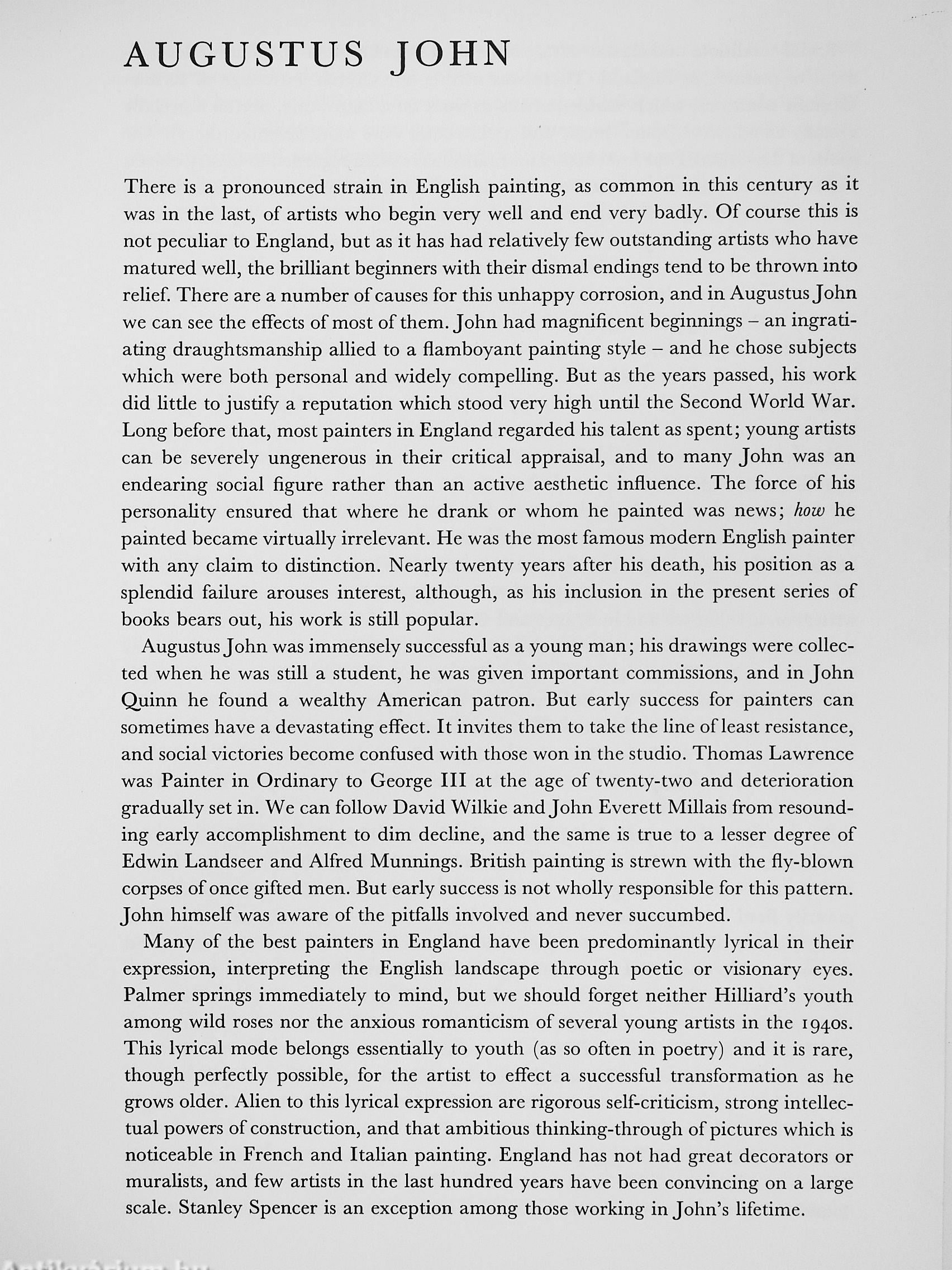 There have been innumerable figures in the history of English painting who have started their careers as painters with great gifts, but who have not always fulfilled that early promise. One of the most spectacularly gifted in his youth was Augustus John (1878-1961), who at one point appeared to be leading English painting back into the mainstream of European art. Yet at the present time, in spite of recent attempts to revive it with books and exhibitions, his reputation is low. His lifestyle and appealing character, which dominated a certain section of London's artistic life in the early years of the century, are perhaps better known than his work, although certain of his portraits - of Lawrence of Arabia, Dylan Thomas, Madame Suggia, his young son Robin -continue to be widely reproduced and popular.