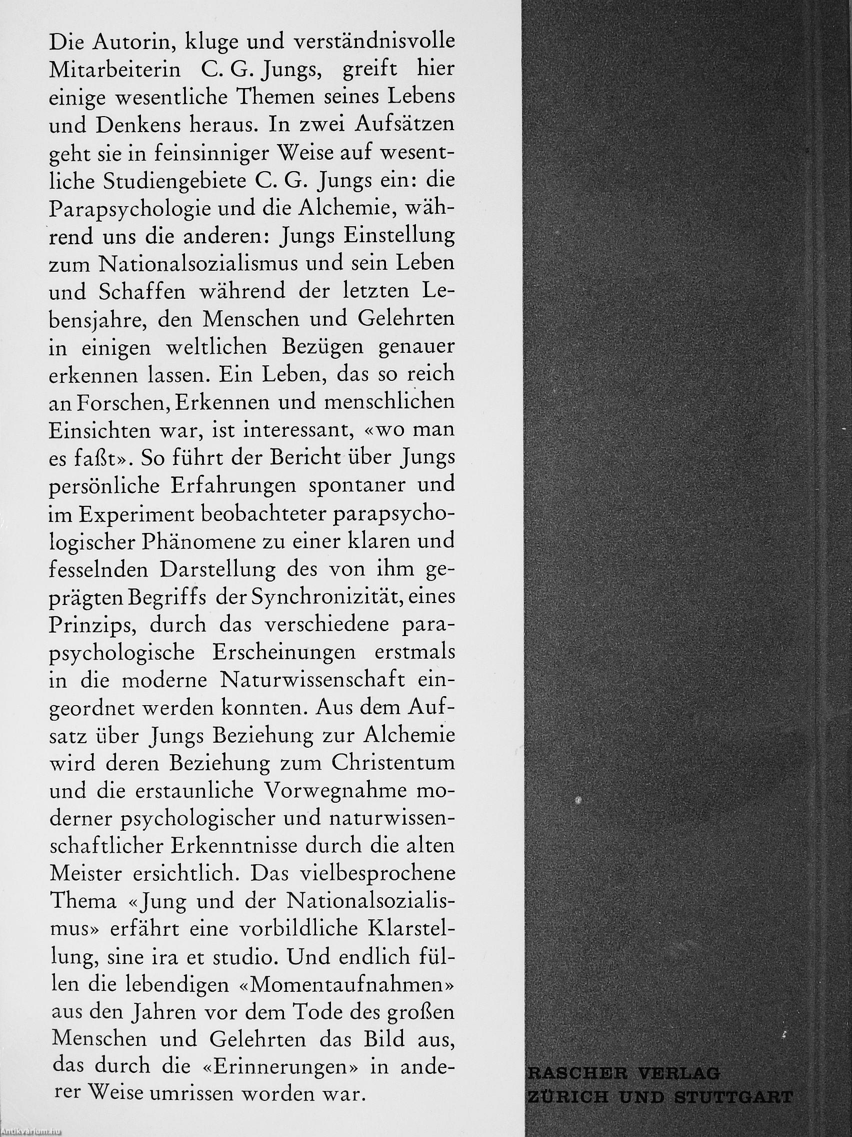 Die Autorin, kluge und verständnisvolle Mitarbeiterin C. G. Jungs, greift hier einige wesentliche Themen seines Lebens und Denkens heraus. In zwei Aufsätzen geht sie in feinsinniger Weise auf wesentliche Studiengebiete C. G. Jungs ein: die Parapsychologie und die Alchemie, während uns die anderen: Jungs Einstellung zum Nationalsozialismus und sein Leben und Schaffen während der letzten Lebensjahre, den Menschen und Gelehrten in einigen weltlichen Bezügen genauer erkennen lassen. Ein Leben, das so reich an Forschen, Erkennen und menschlichen Einsichten war, ist interessant, «wo man es faßt». So führt der Bericht über Jungs persönliche Erfahrungen spontaner und im Experiment beobachteter parapsychologischer Phänomene zu einer klaren und fesselnden Darstellung des von ihm geprägten Begriffs der Synchronizität, eines Prinzips, durch das verschiedene parapsychologische Erscheinungen erstmals in die moderne Naturwissenschaft eingeordnet werden konnten. Aus dem Aufsatz über Jungs Beziehung zur Alchemie wird deren Beziehung zum Christentum und die erstaunliche Vorwegnahme moderner psychologischer und naturwissenschaftlicher Erkenntnisse durch die alten Meister ersichtlich. Das vielbesprochene Thema «Jung und der Nationalsozialismus» erfährt eine vorbildliche Klarstellung, sine ira et studio. Und endlich füllen die lebendigen «Momentaufnahmen» aus den Jahren vor dem Tode des großen Menschen und Gelehrten das Bild aus, das durch die «Erinnerungen» in anderer Weise umrissen worden war.