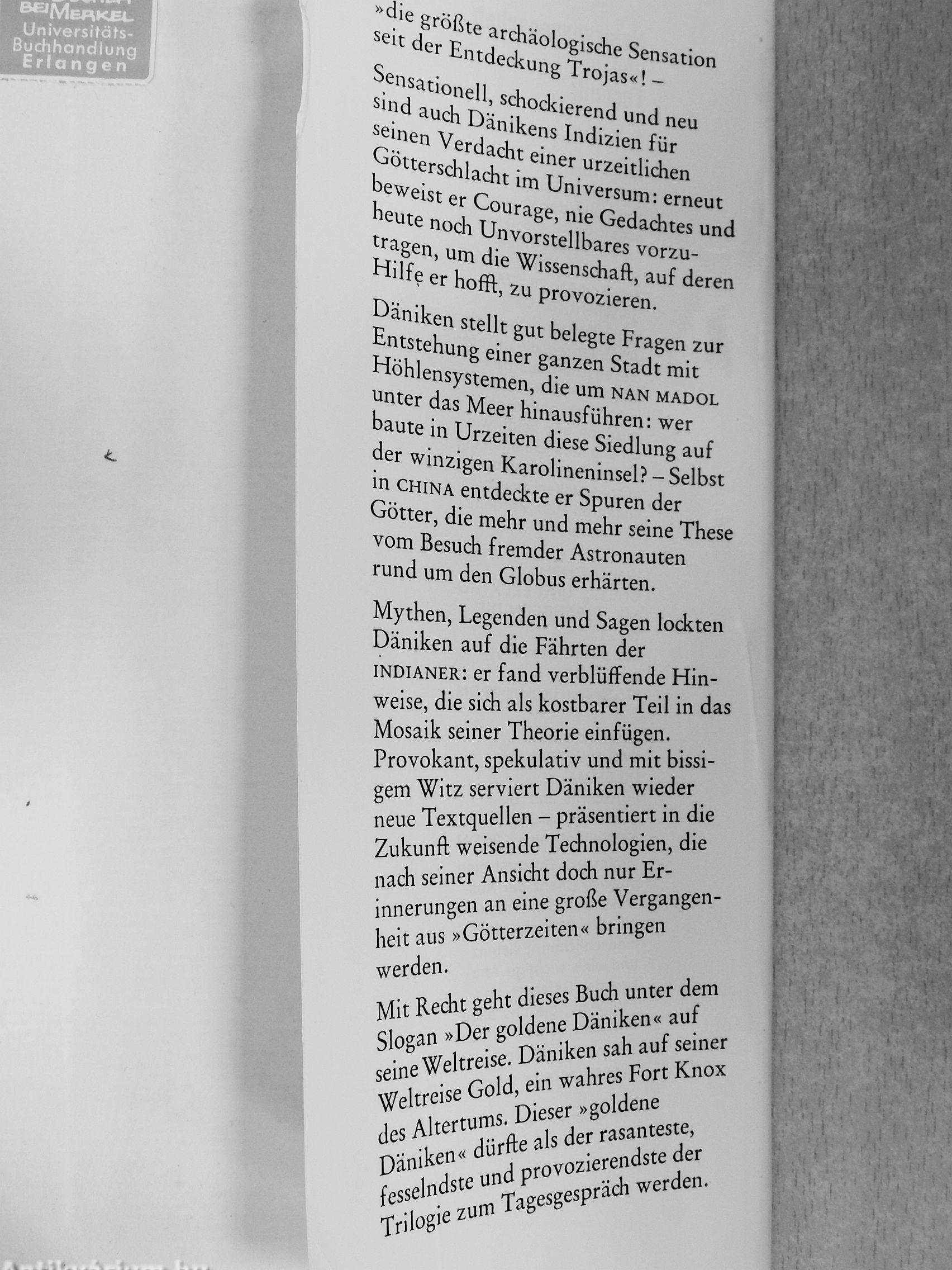 Däniken stellt gut belegte Fragen zur Entstehung einer ganzen Stadt mit Höhlensystemen, die um nan madol unter das Meer hinausführen: wer baute in Urzeiten diese Siedlung auf der winzigen Karolineninsel? - Selbst in china entdeckte er Spuren der Götter, die mehr und mehr seine These vom Besuch fremder Astronauten rund um den Globus erhärten.