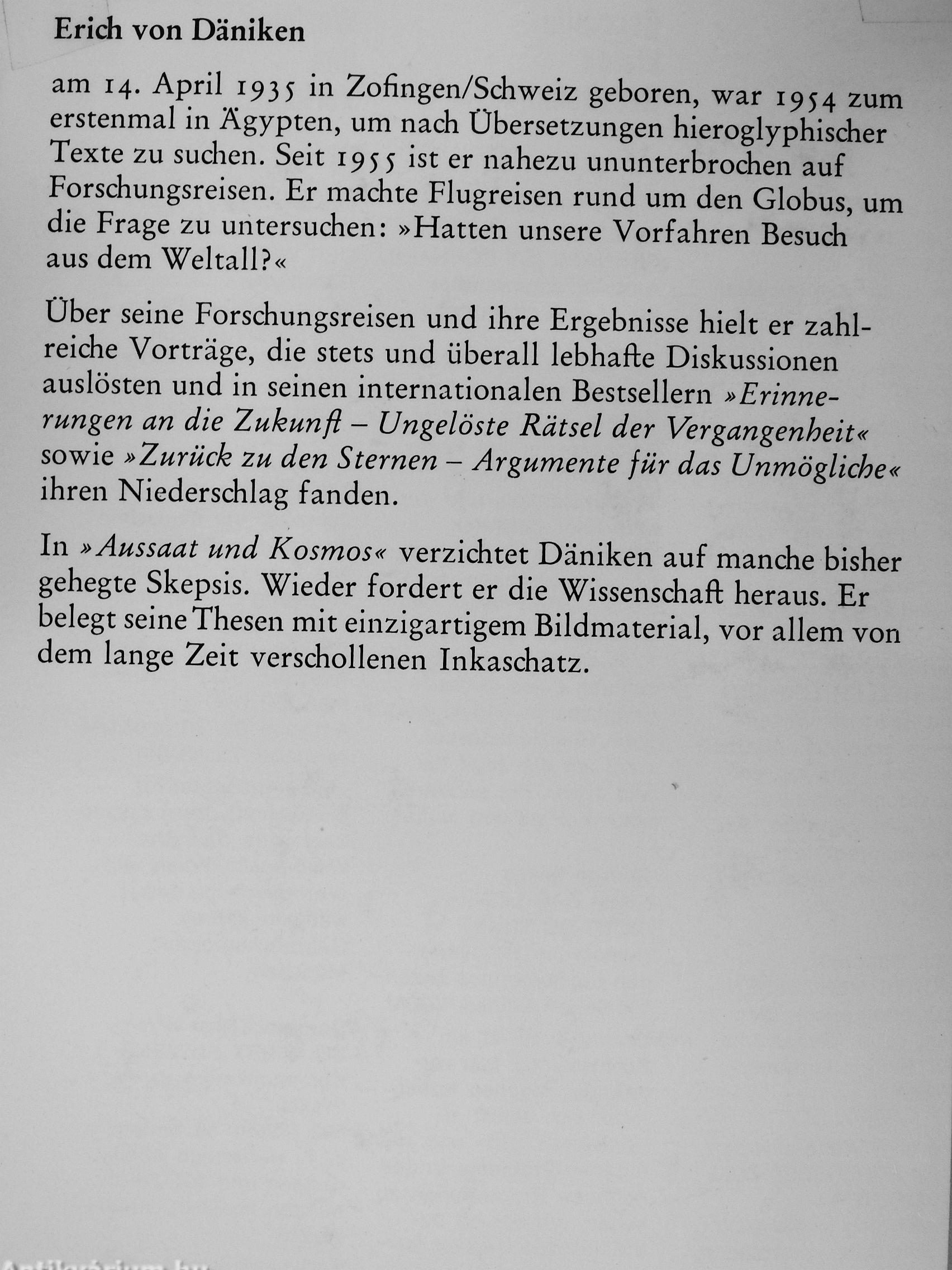 In »Aussaat und Kosmos« verzichtet Däniken auf manche bisher gehegte Skepsis. Wieder fordert er die Wissenschaft heraus. Er belegt seine Thesen mit einzigartigem Bildmaterial, vor allem von dem lange Zeit verschollenen Inkaschatz.