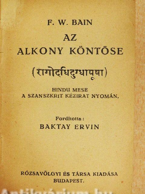 | Megjegyzés: | F. W. Bain tíz hindú meséjét (A Hajnal Leánya, Holdsarló, A Hibák Bányája, A Testetöltött Hó, Az Éjbemerült Nap, A Nagy Isten Hajában, Szürkület, Buborékok az Élet Tengerén, Az Égszinkék Ital, Isteni Hamvak) követi "Az Alkony köntöse". A művet Sugár Jenő rendezte sajtó alá. Szedték Korvin Testvérek félkövér Nordisch-antiqua betűivel. Nyomták 1921-ben 5100 példányban. |