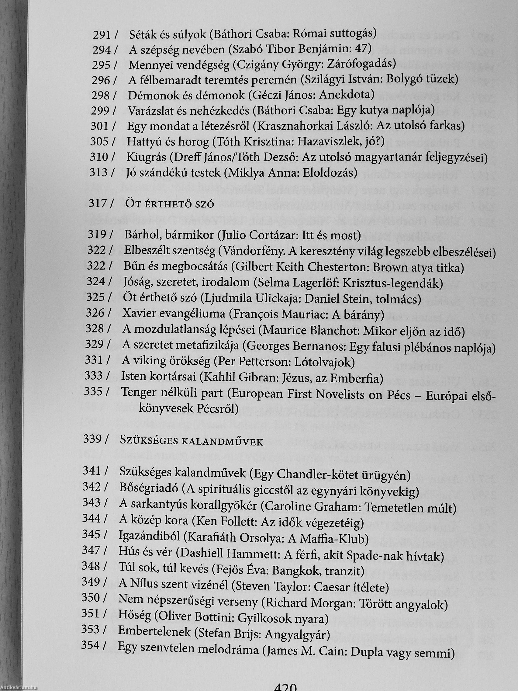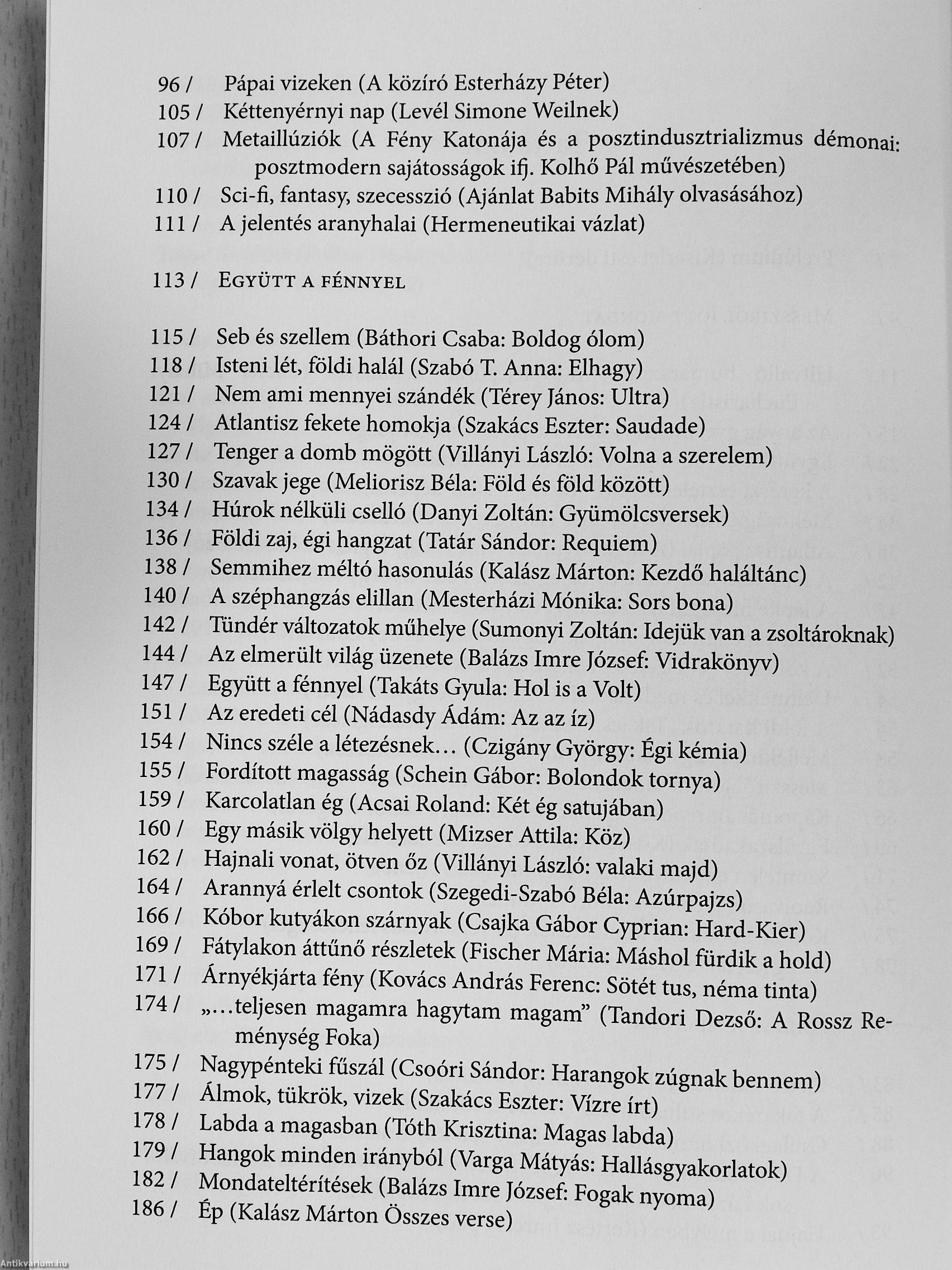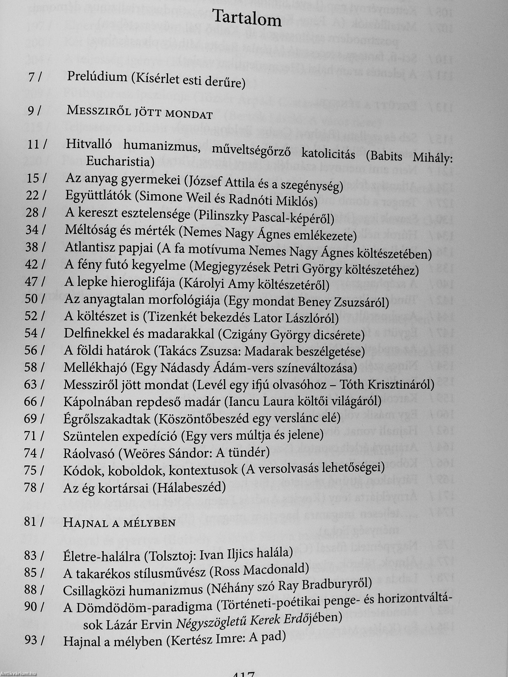 ' ' A kötet a szerző utóbbi évdien született értekező prózai írásait (irodEni . ; tárgyú esszélt, kritikmt, alkatew szövegeit) gyűjti egybe. A könyv kíséfle-teket és a|ániatokat ad közre: első rés^n klasszikus és jelenkori költők, .írók, gondolkodók^^űvéhez közelítő esszék szerepelnek; ezt követően'-" • ;" bírálatt^k^orakozhak - kortárs yeiaeskönyvekről, magyar és világirodalmi . ¦' : • prózakötetből, a szórakoztató irodatam néhány fontos darabjáról, érte- •